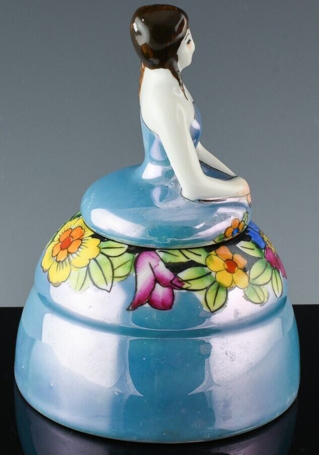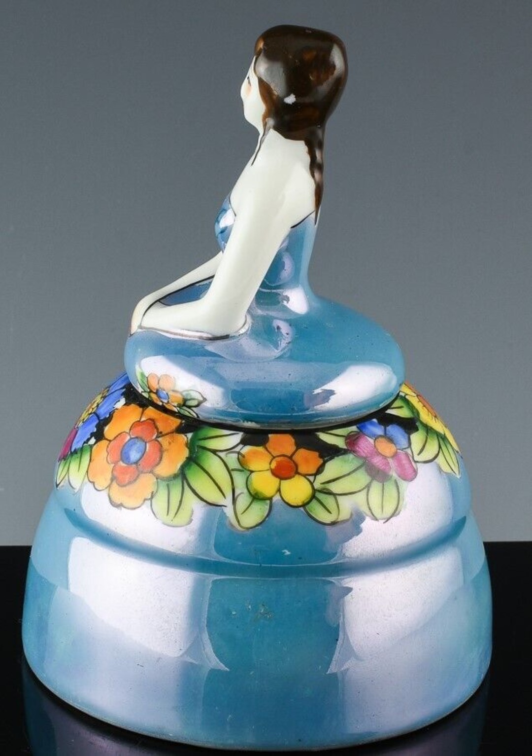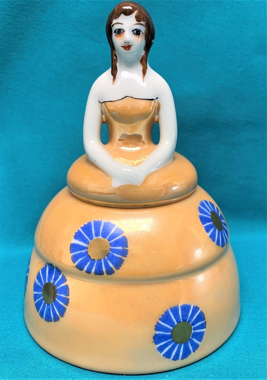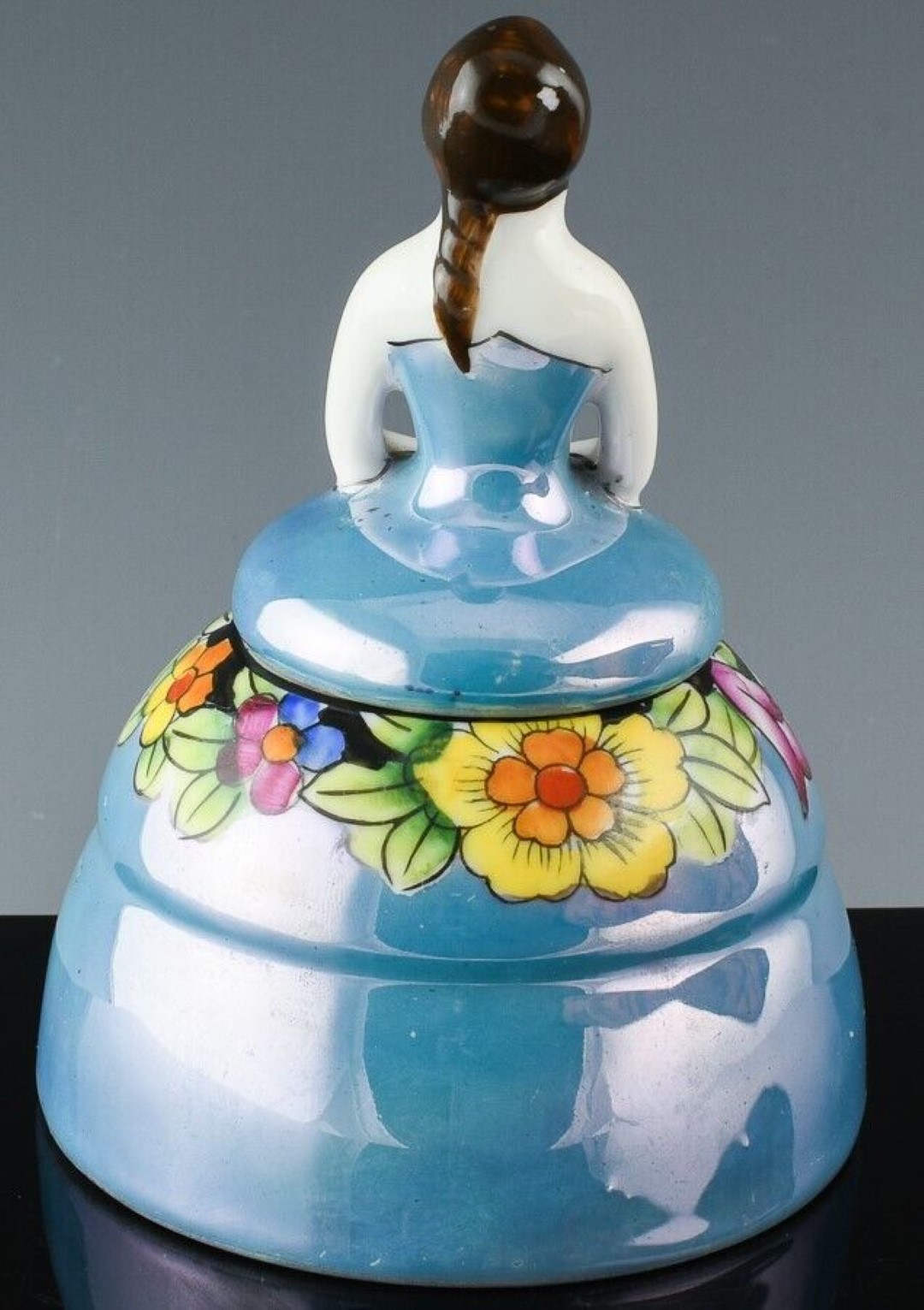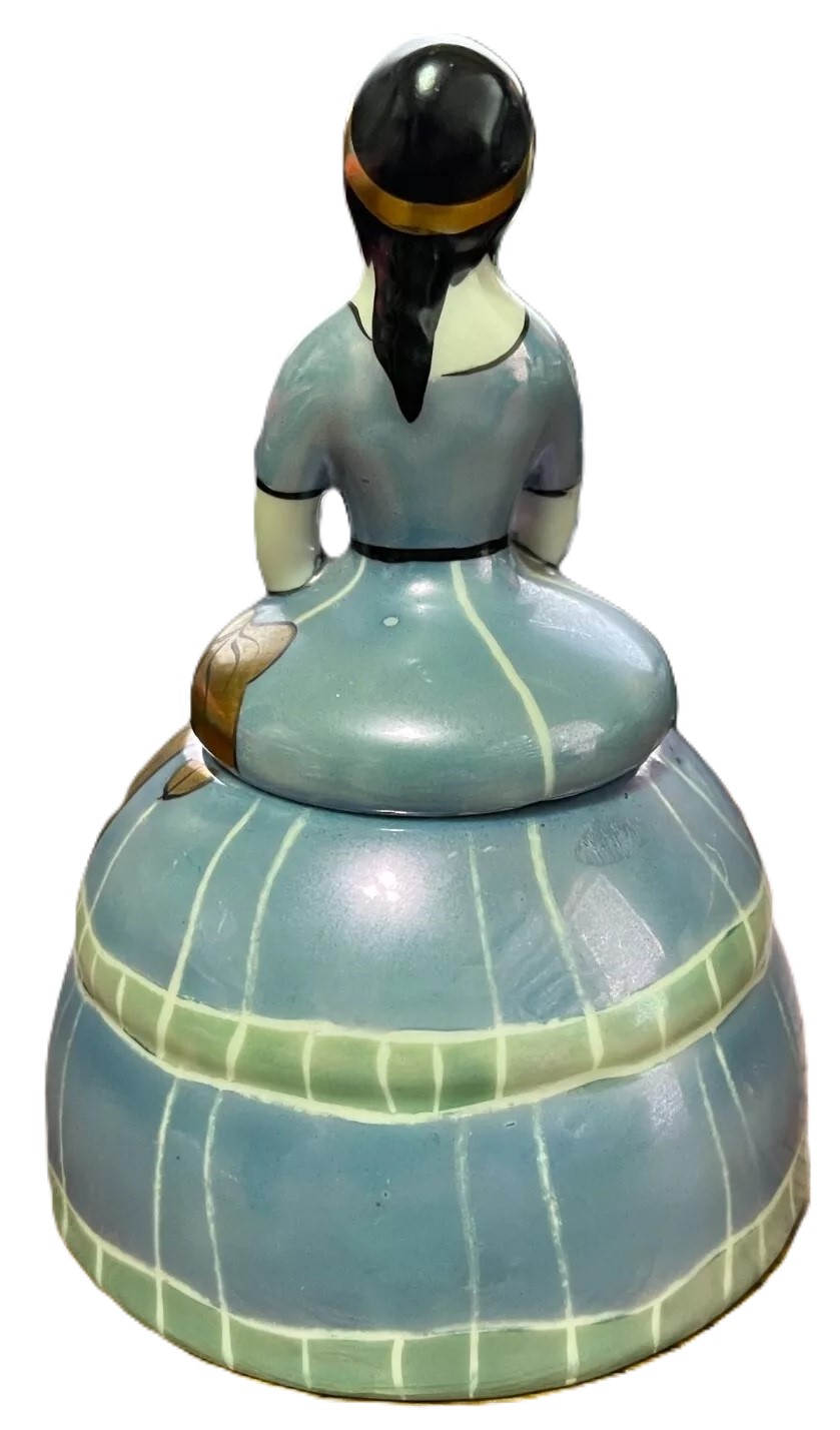 Shaped as a lady in a strapless gown with a long bell-shaped skirt, the top half lifts off to access the inkwell. The gown is painted with a tangerine luster color glaze and is accented with blue and gold flowers. Her hands are demurely clasped in front of her. Her facial features are exceptionally rendered. The green “M” in the wreath mark is on the base, with “Noritake” above it and “Hand Painted” “Made in Japan” below it.