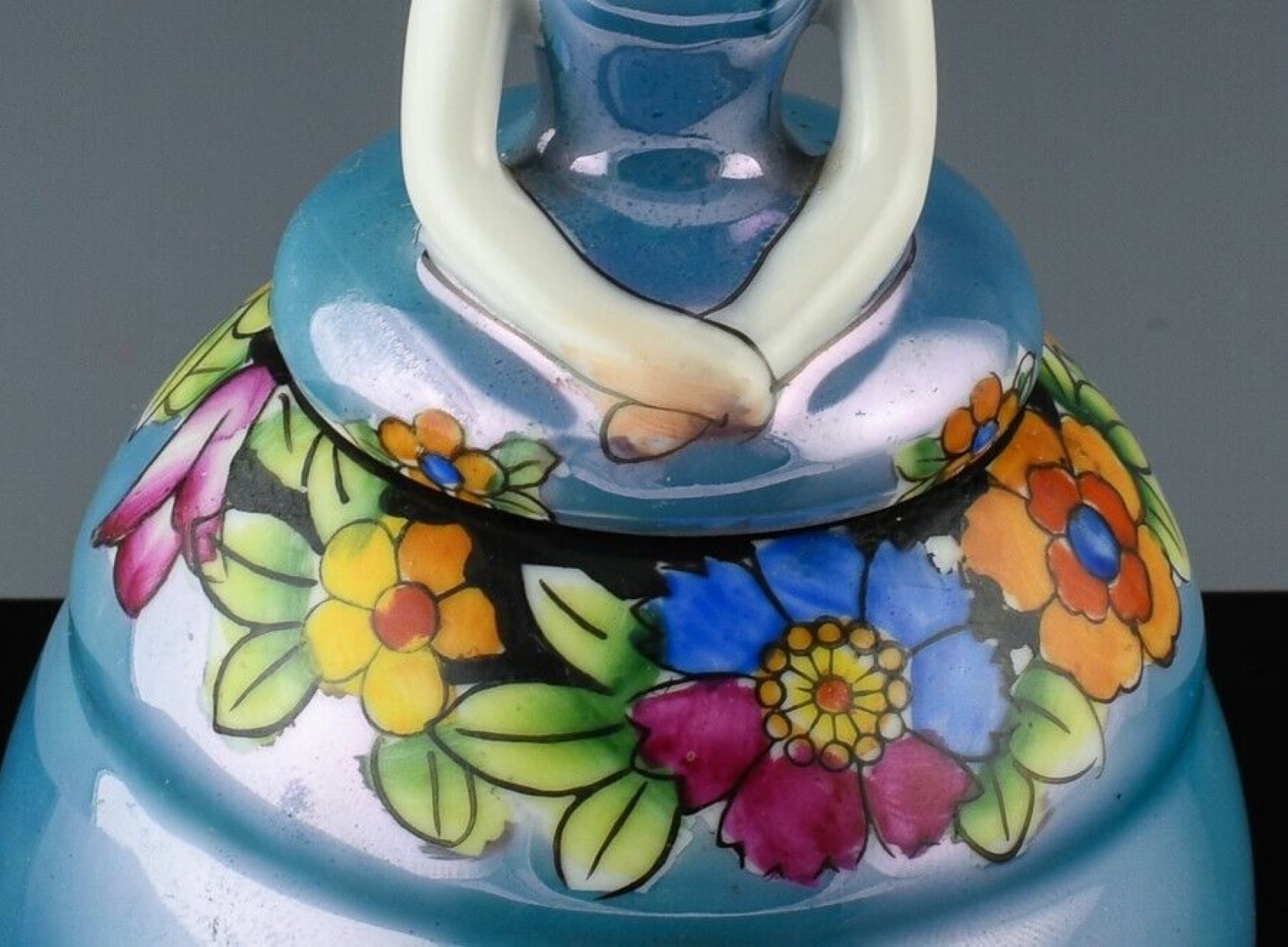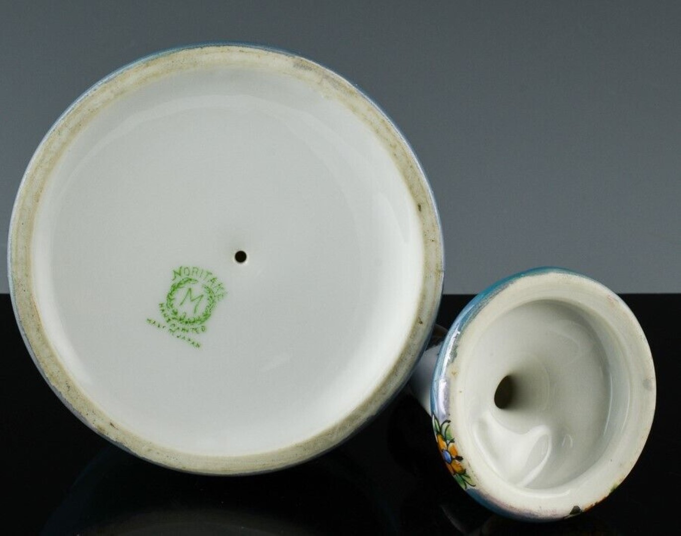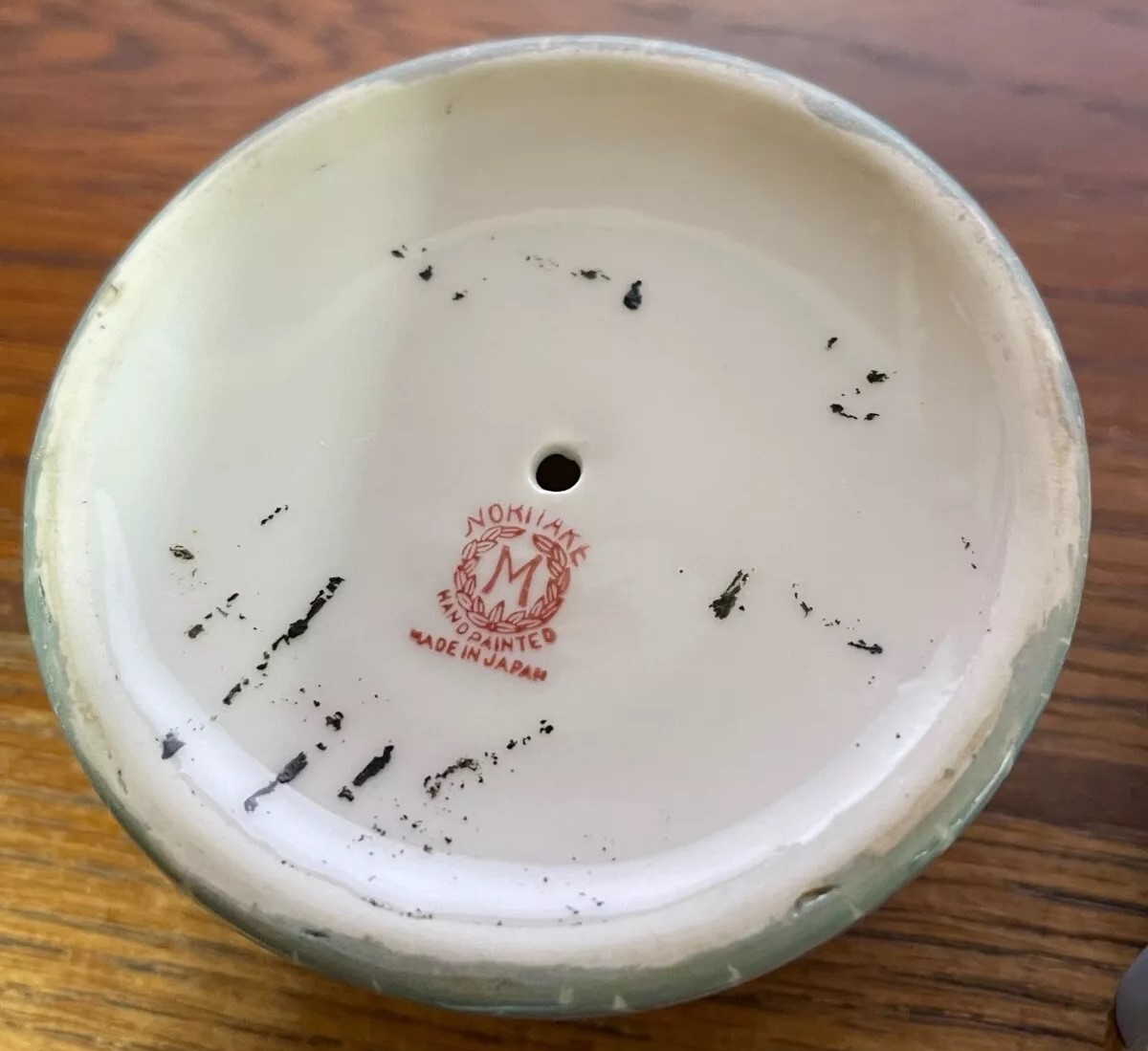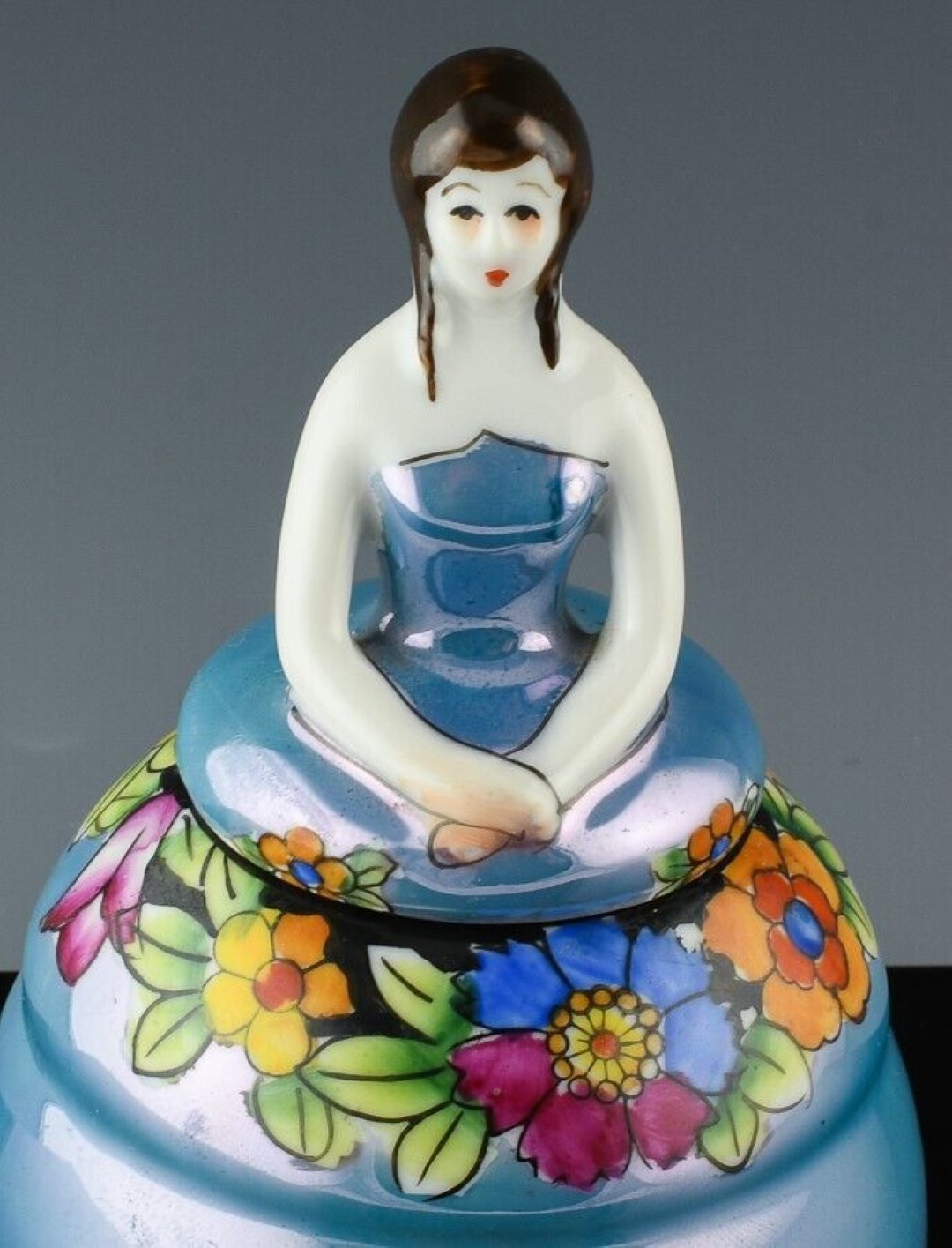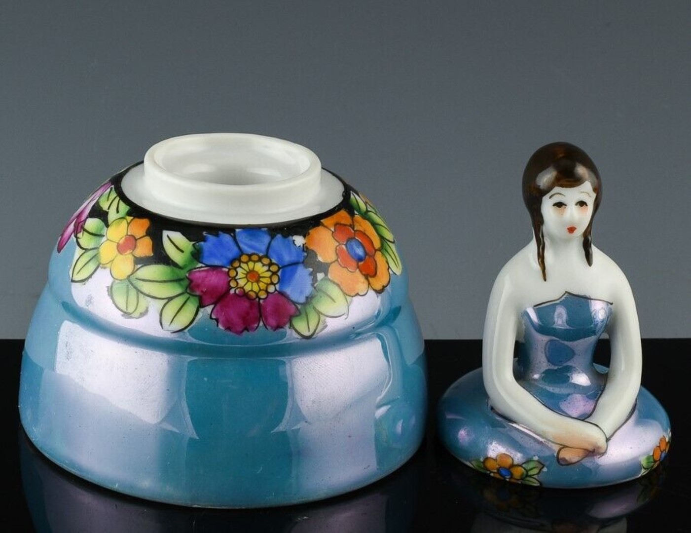 Shaped as a lady in a strapless gown with a long bell-shaped skirt, the top half lifts off to access the inkwell. The gown is painted with a tangerine luster color glaze and is accented with blue and gold flowers. Her hands are demurely clasped in front of her. Her facial features are exceptionally rendered. The green “M” in the wreath mark is on the base, with “Noritake” above it and “Hand Painted” “Made in Japan” below it.