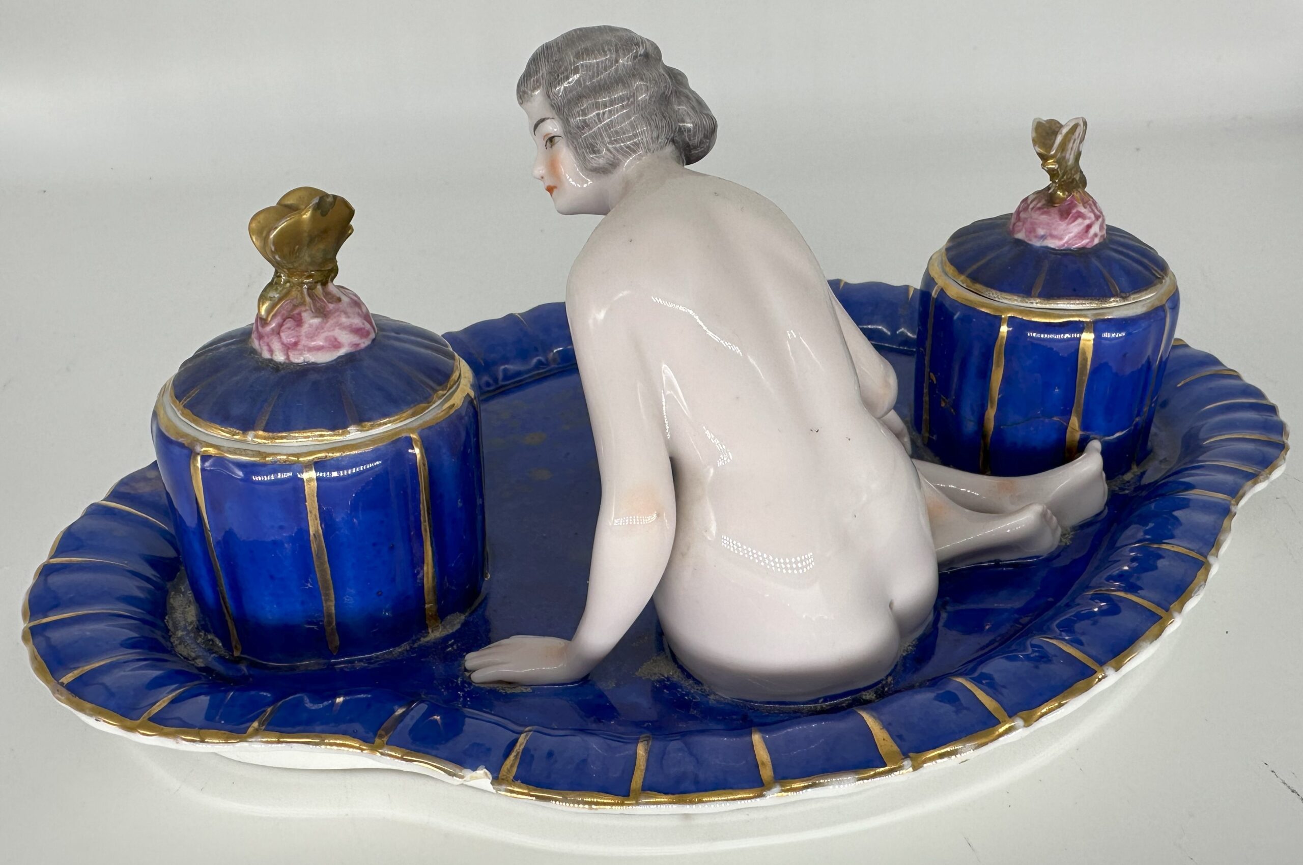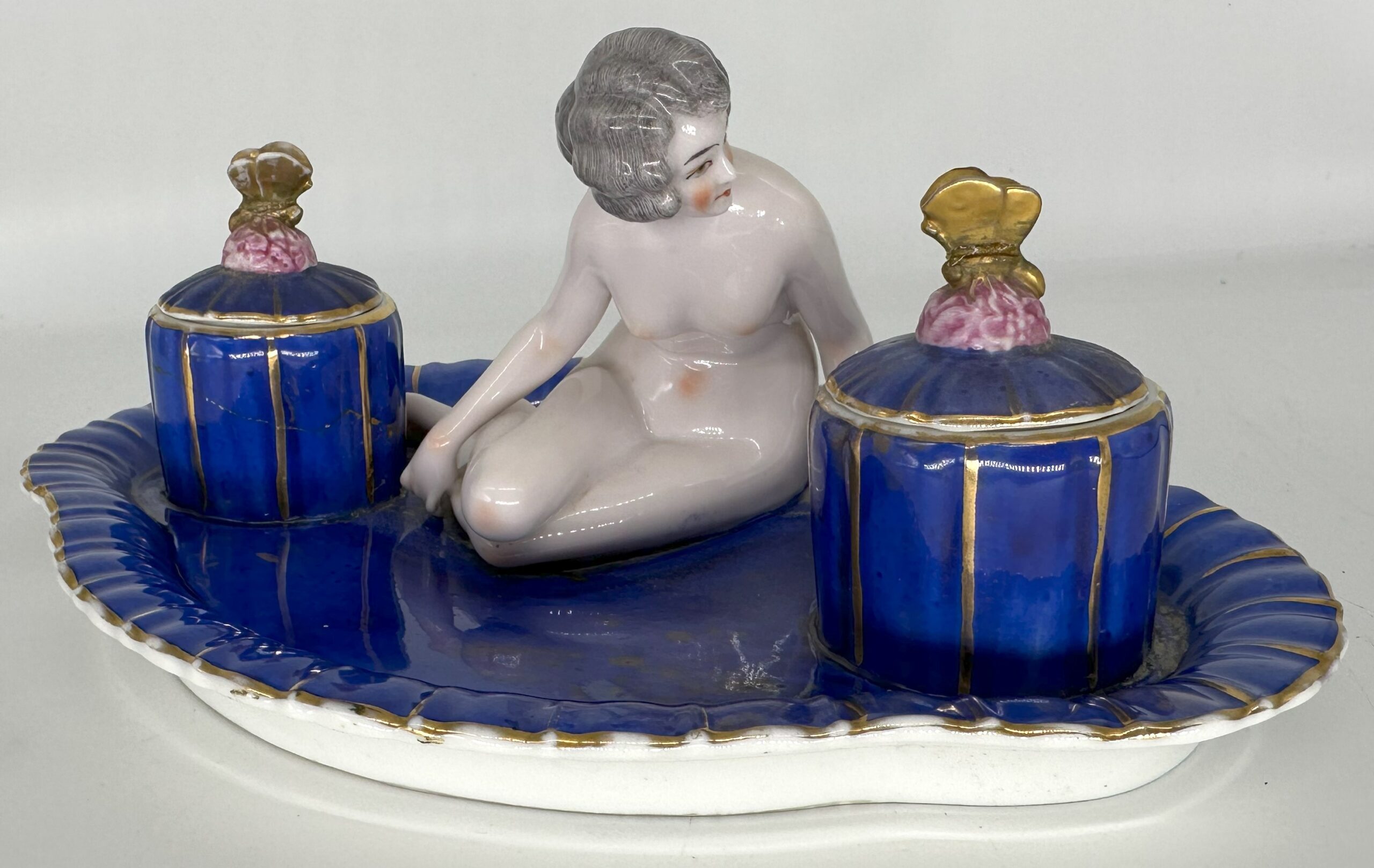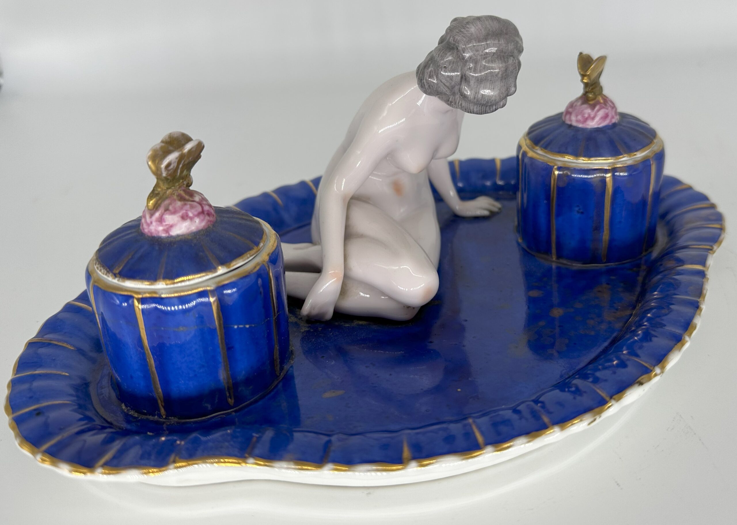A nude woman graces this double inkstand believed to be Dresden porcelain. Marked and numbered 5453. Two examples shown.
