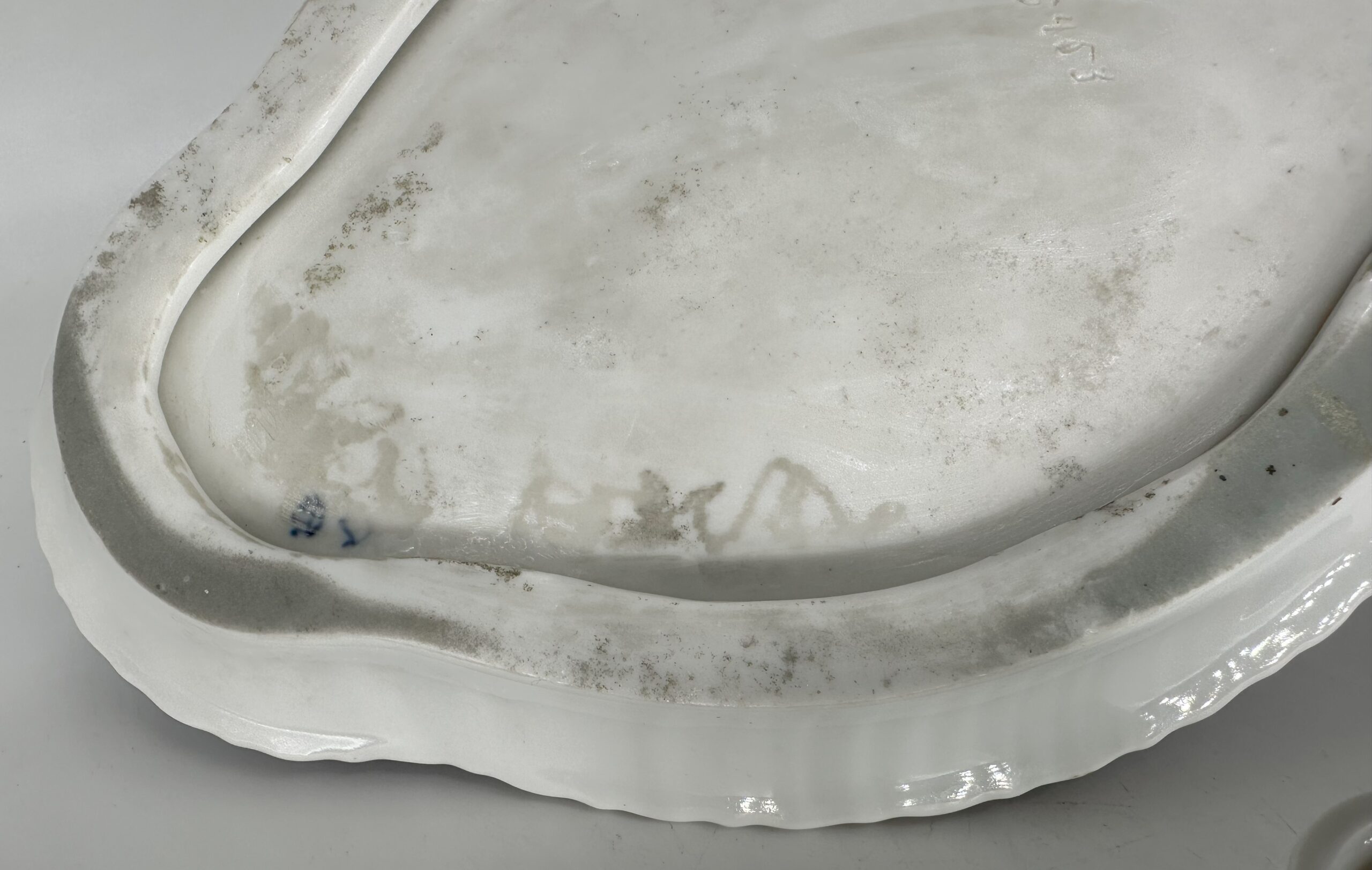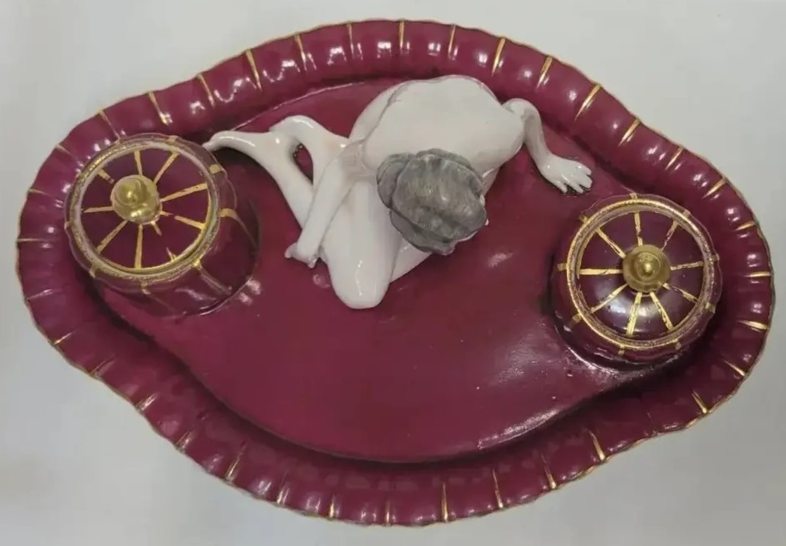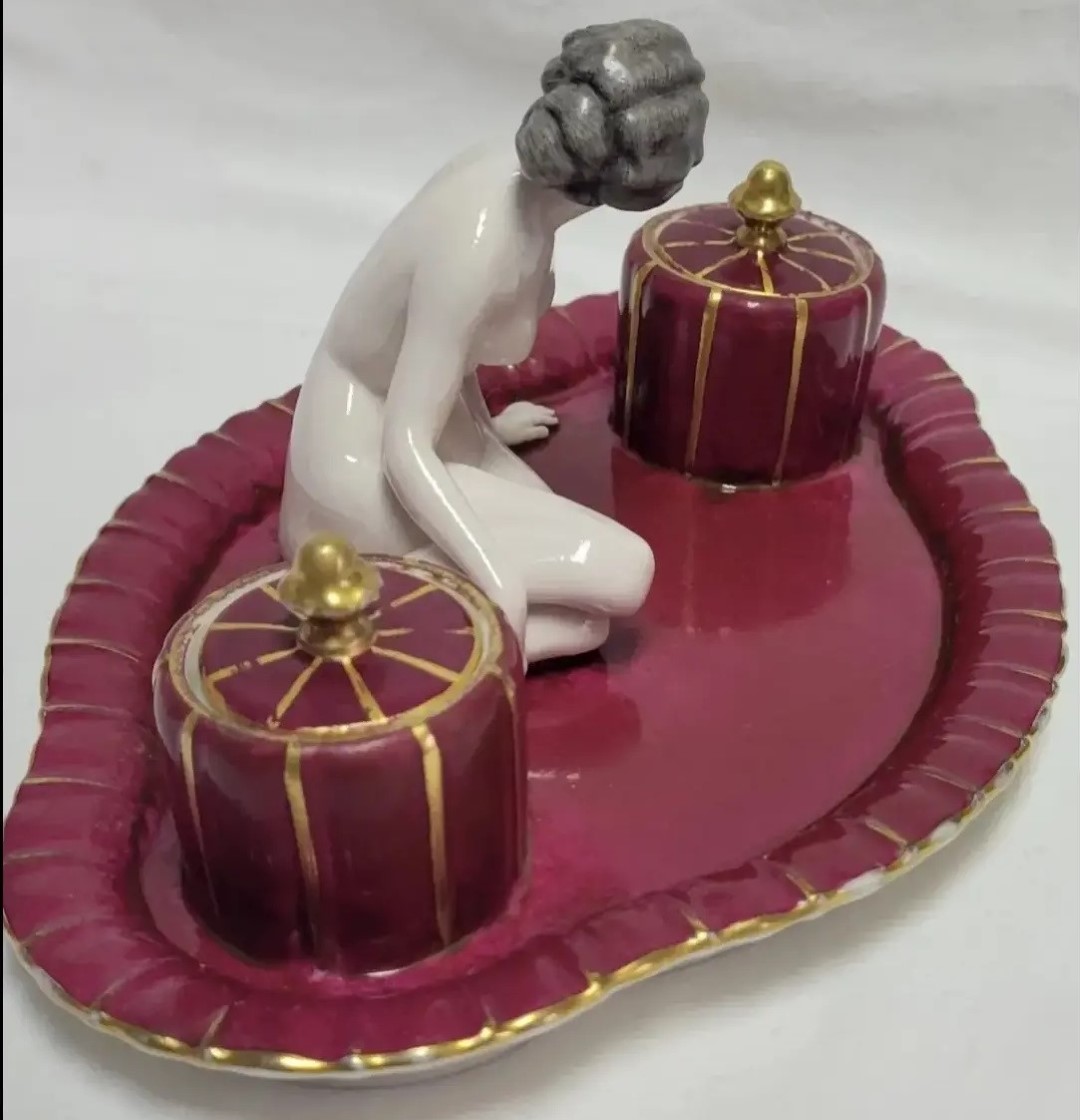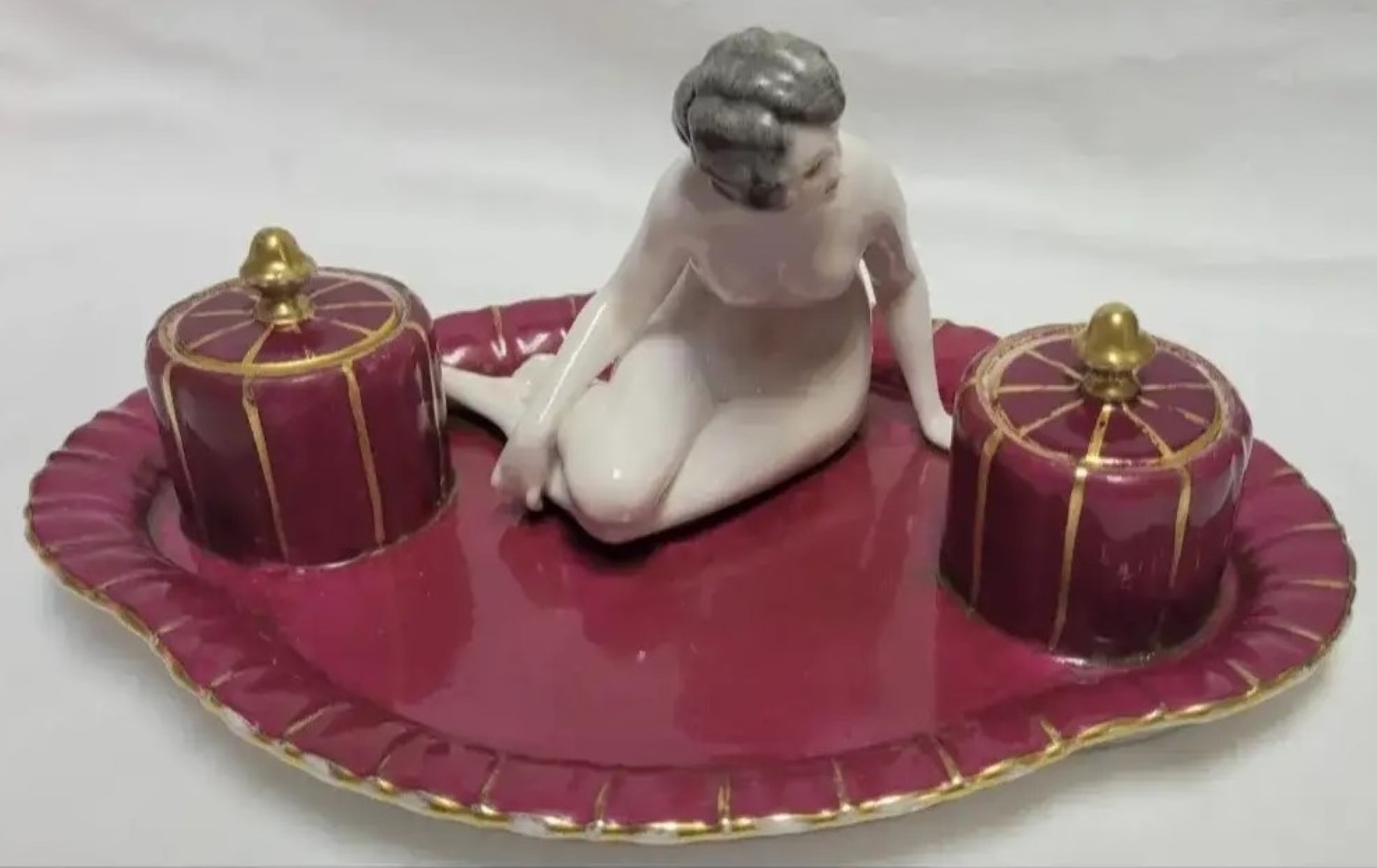 A nude woman graces this double inkstand believed to be Dresden porcelain. Marked and numbered 5453. Two examples shown.
