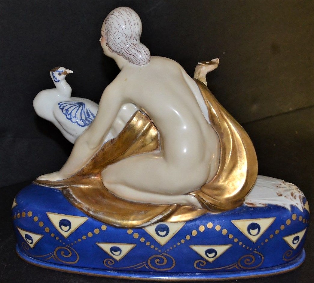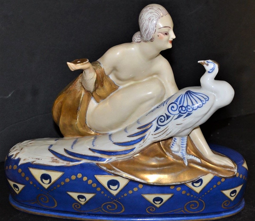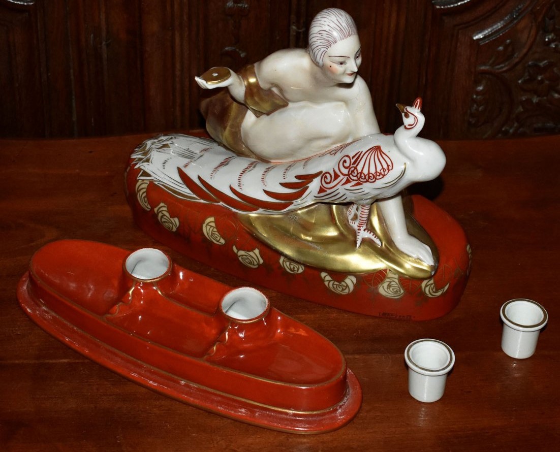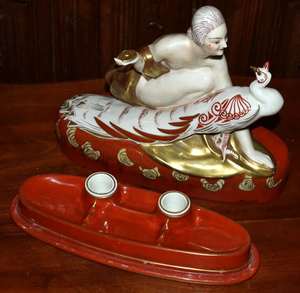 Beautifully enameled porcelain representing a young woman peering into the eyes of a peacock. This sumptuous inkwell, created by the sculptor Pierre Traverse (1892-1979) for the Aladin Luxe brand, is the epitome of 1920’s Art Deco style.