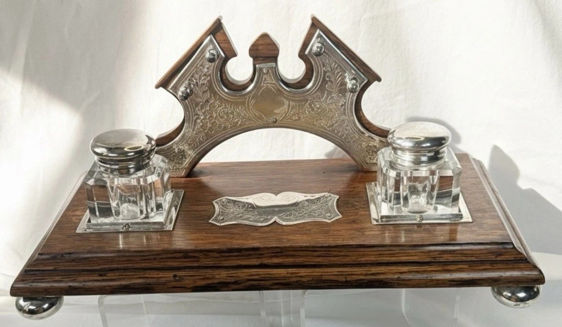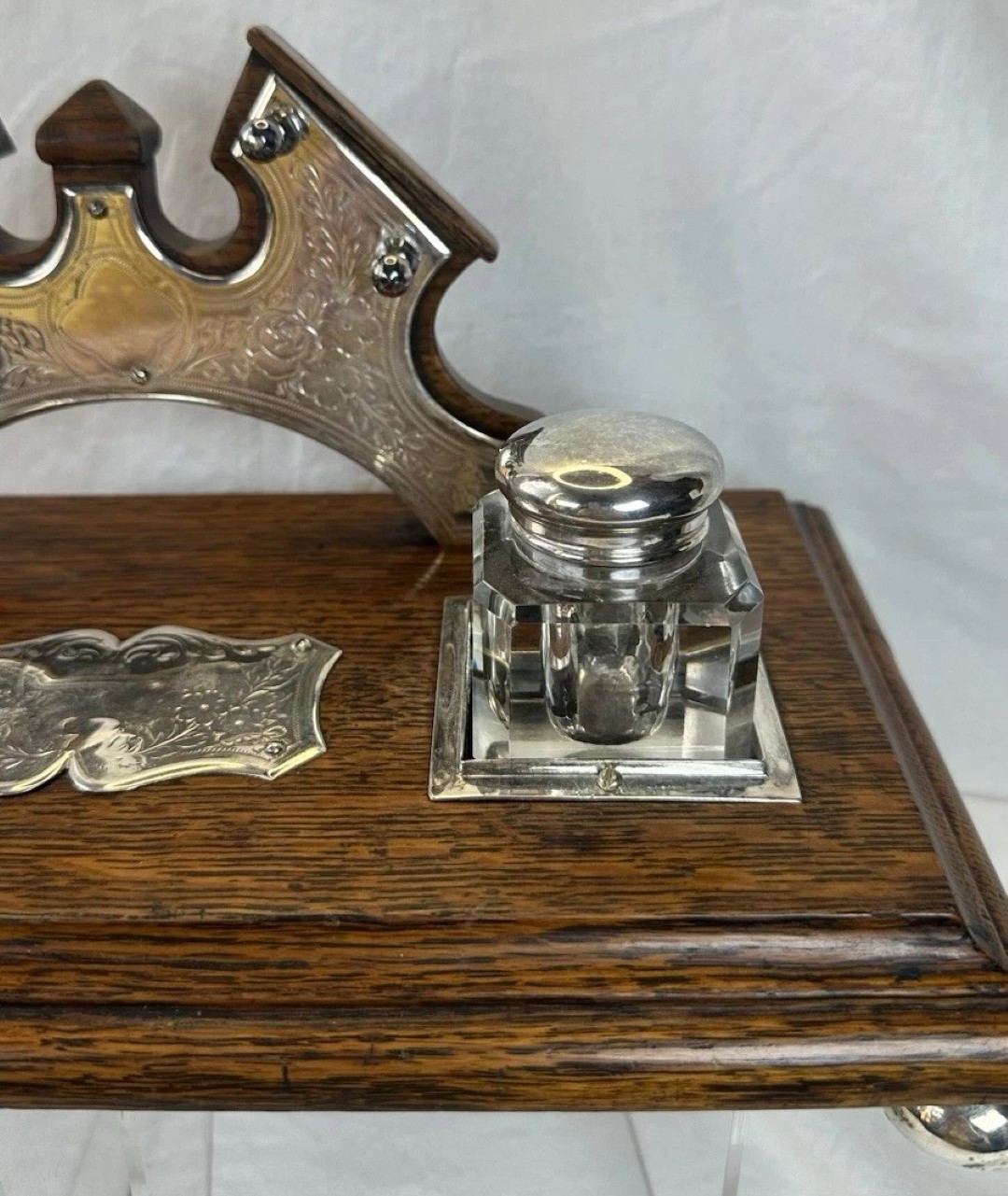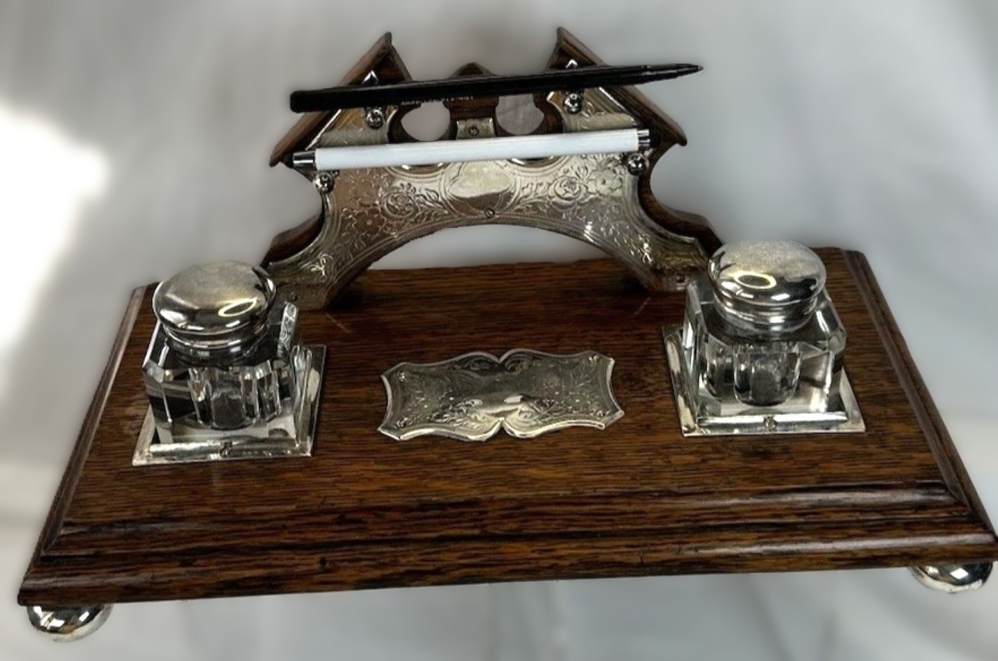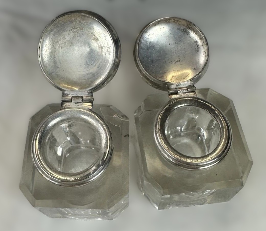 - The Inkwells: It features two clear glass inkwells, made of thick, heavy pressed glass. These are fitted with hinged silver-plated lids.
