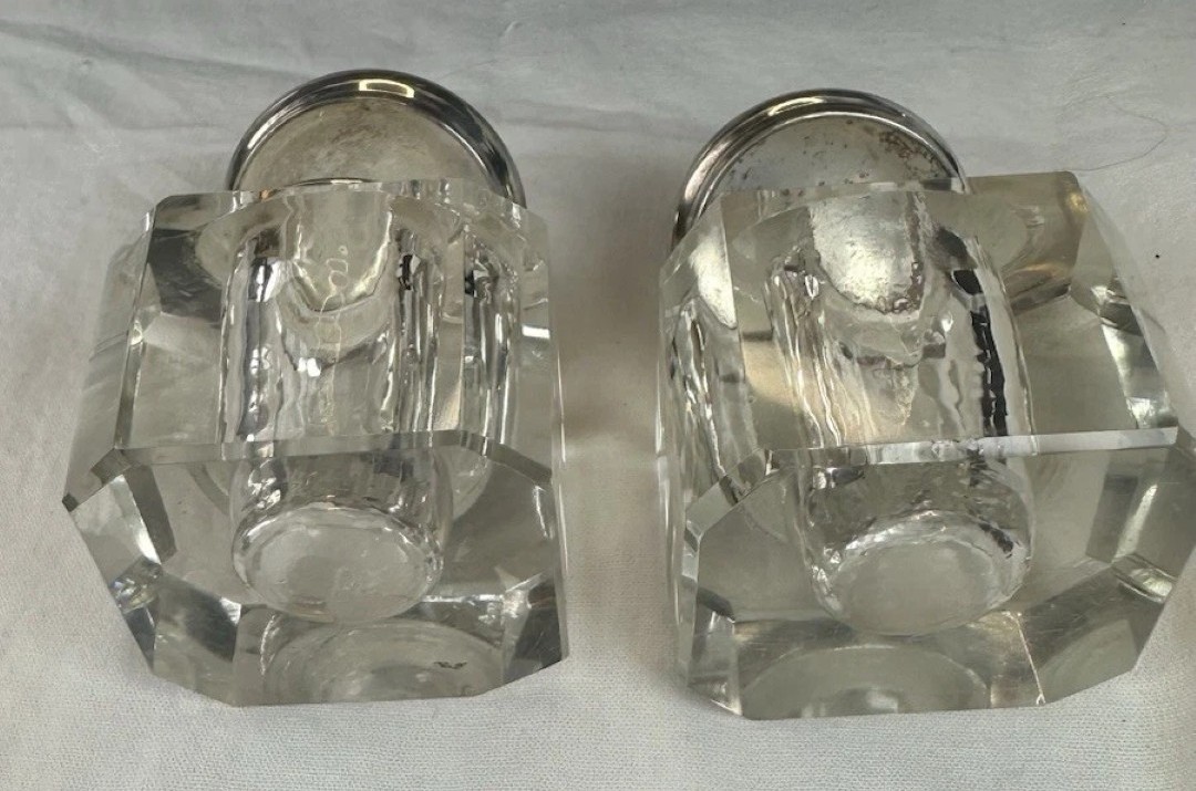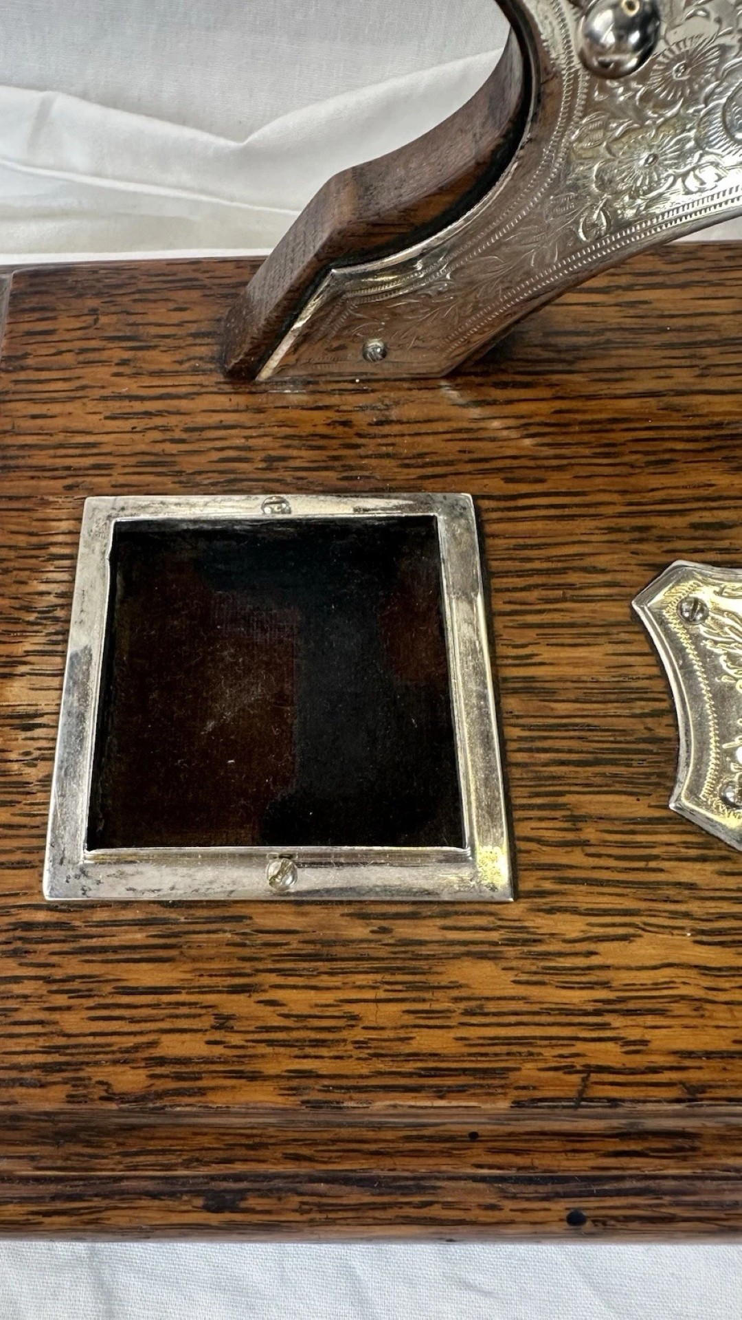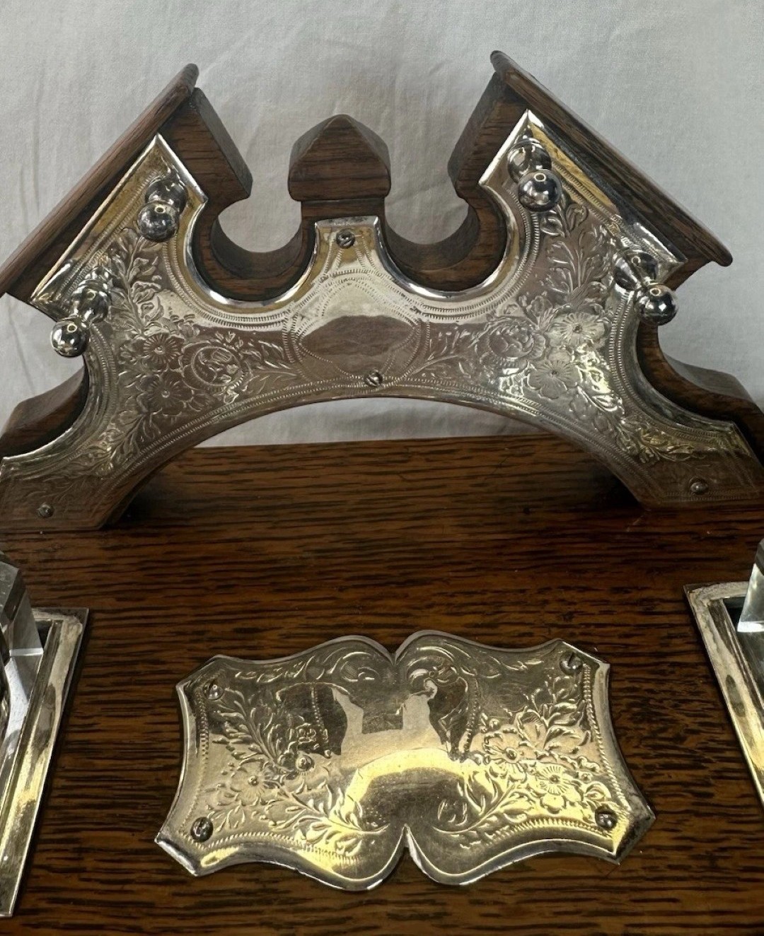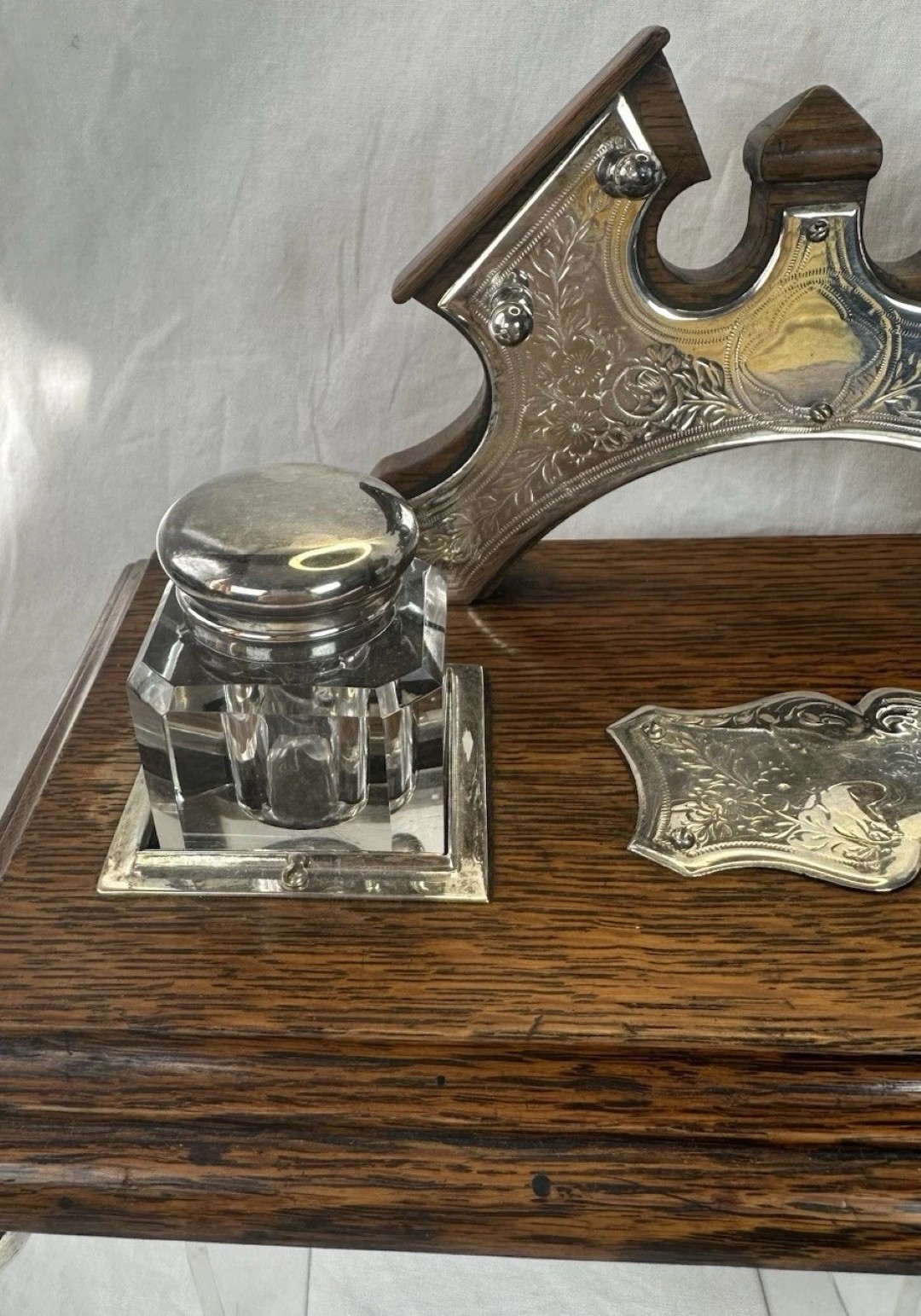 - The Inkwells: It features two clear glass inkwells, made of thick, heavy pressed glass. These are fitted with hinged silver-plated lids.