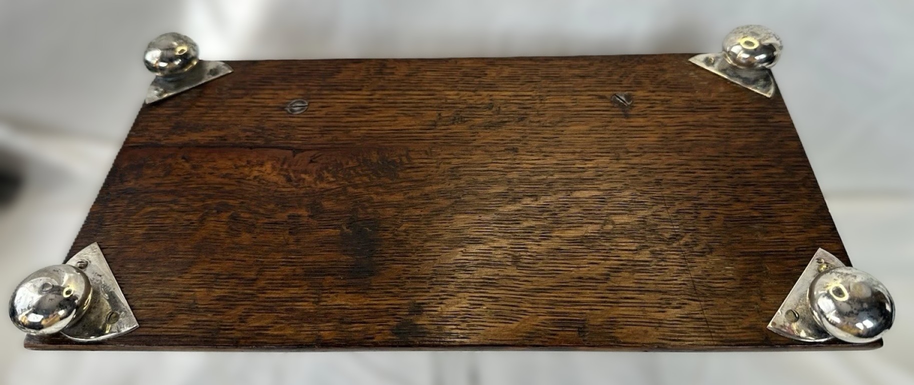 - The Base: Crafted from solid, dark-grained oak, often referred to as “fumed oak” or “weathered oak” in the period, which highlights the dramatic medullary rays (the “tiger” stripes) of the wood. It is set upon four silver-plated ball feet.