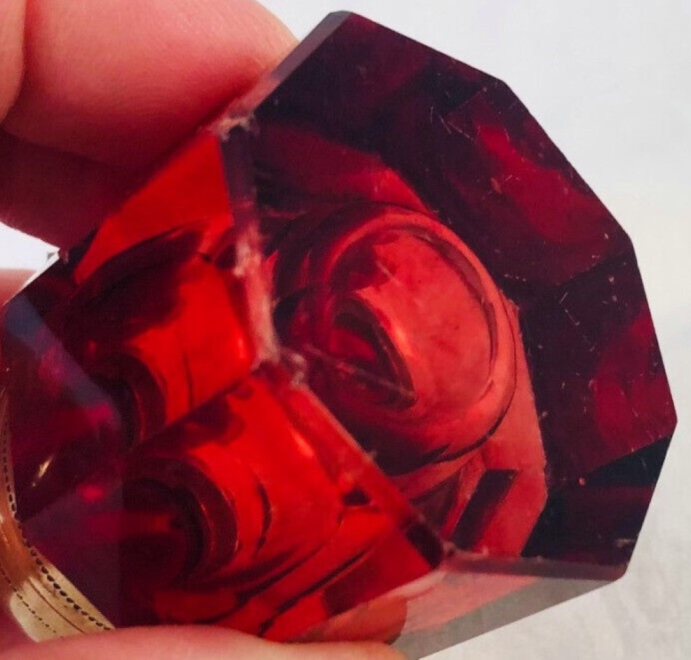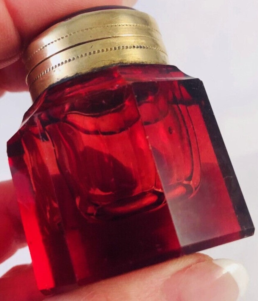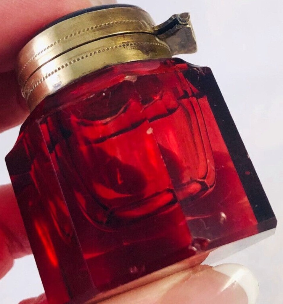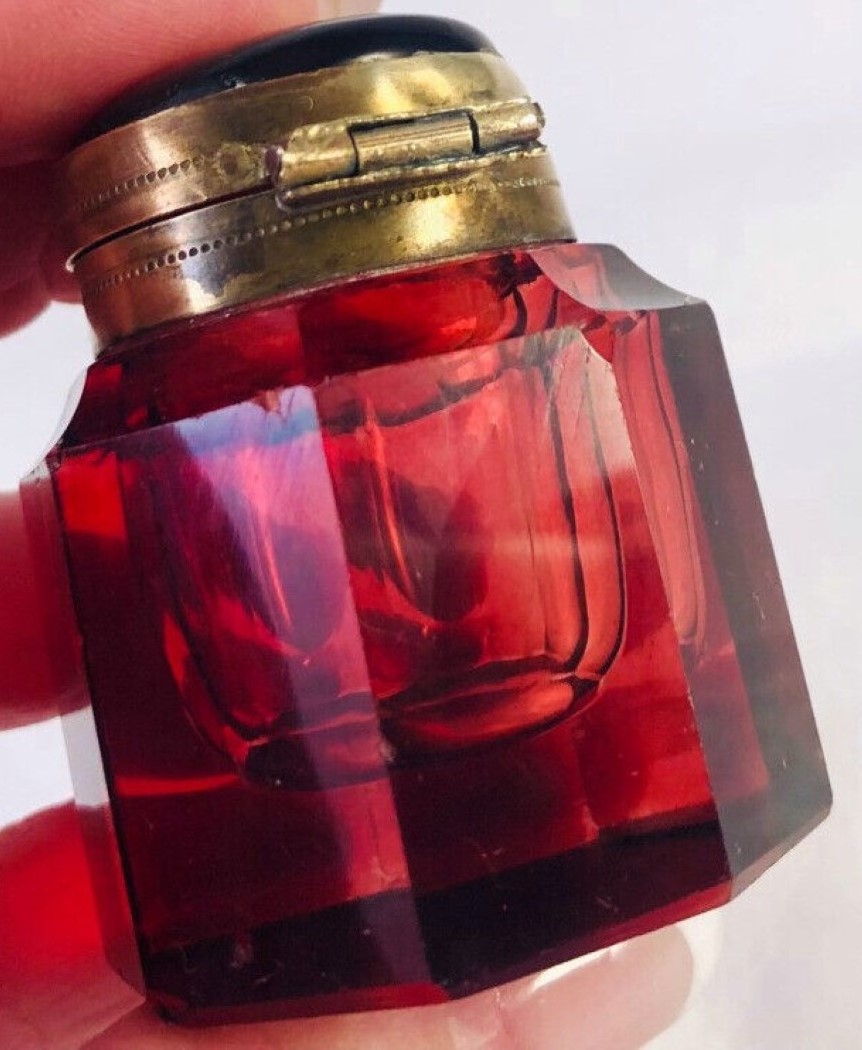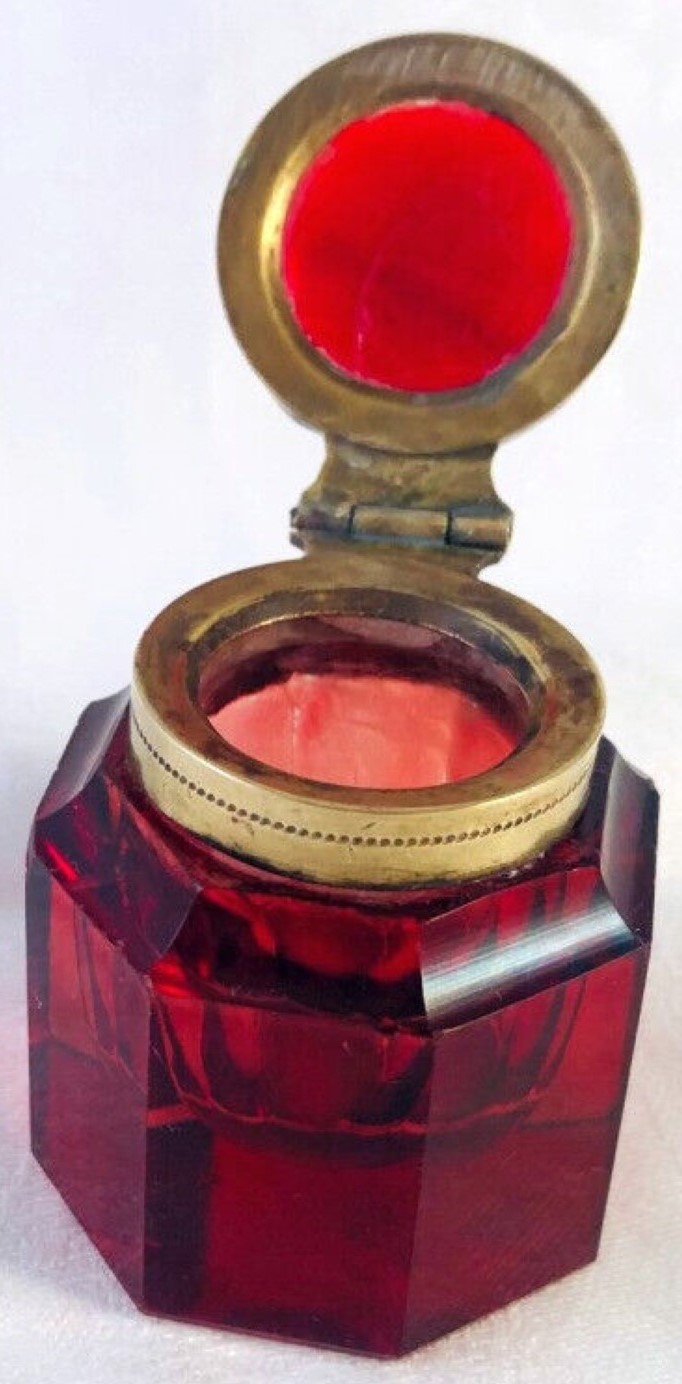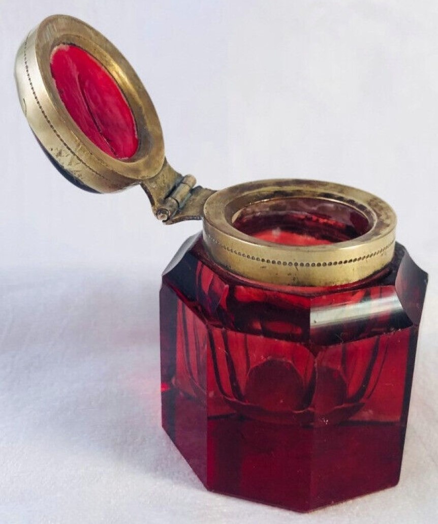 Cranberry 8-paneled cut glass inkwell with hinged lid, brass banding, polished sides, and ogee shaped shoulders.