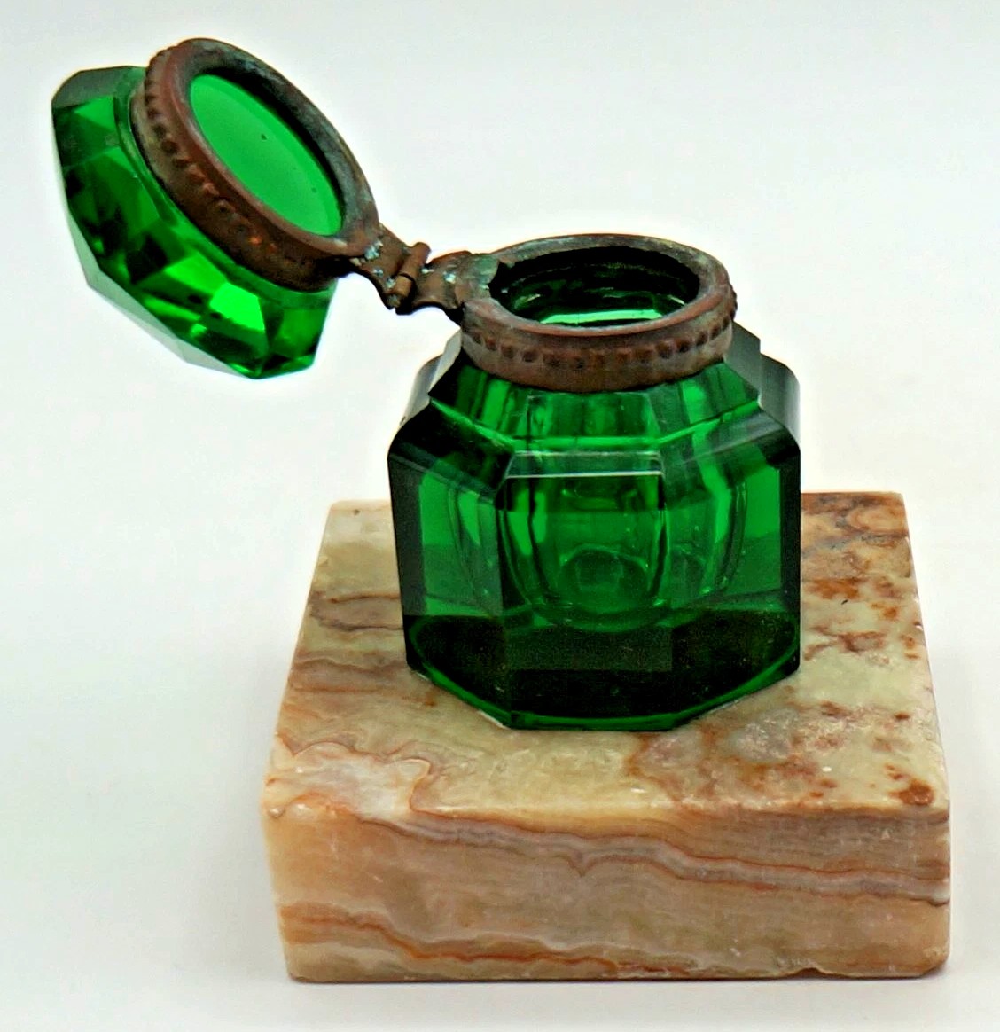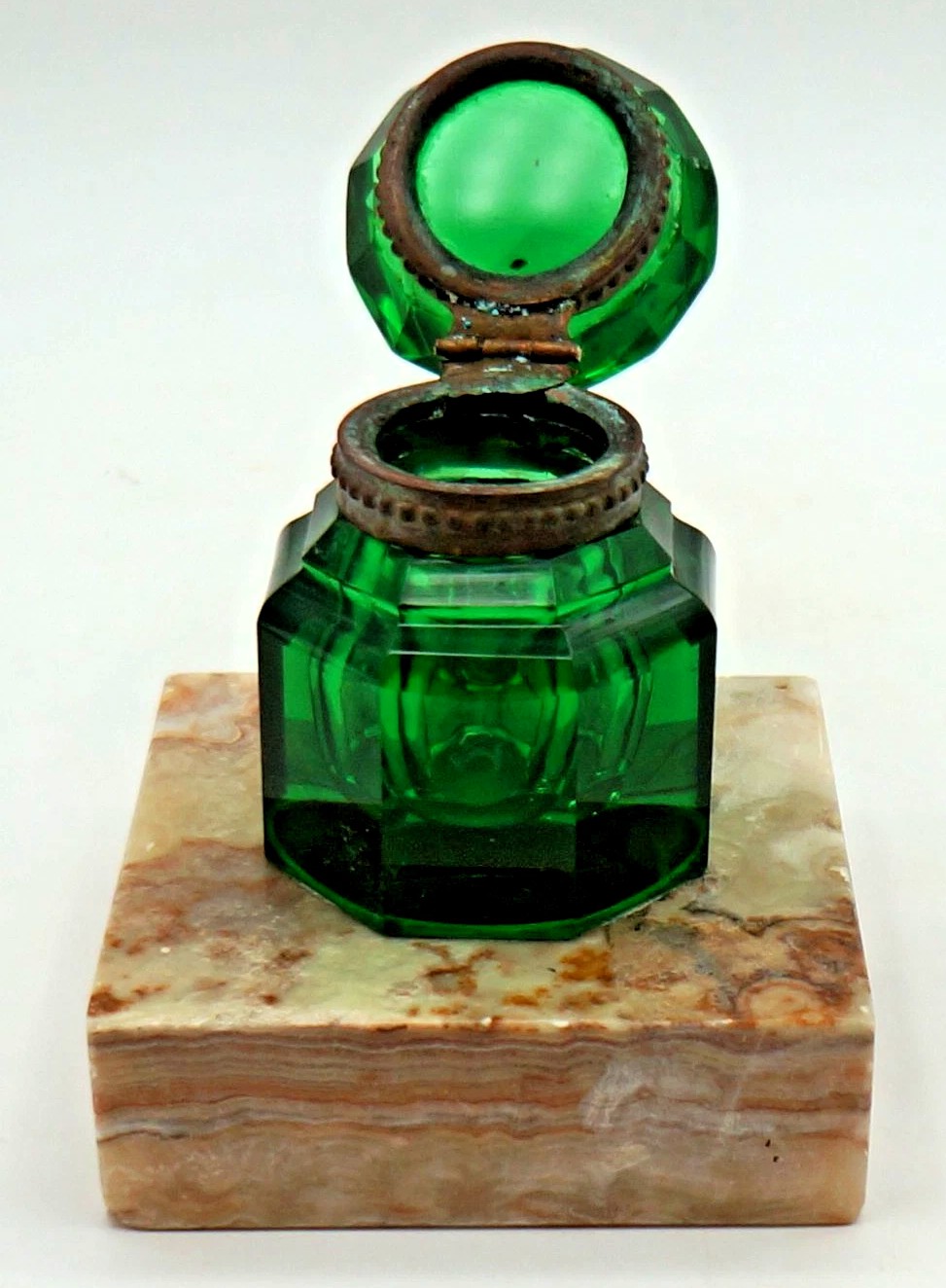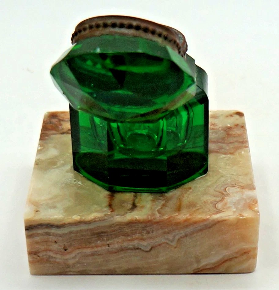 Octagonal Green Glass Inkwell on Marble