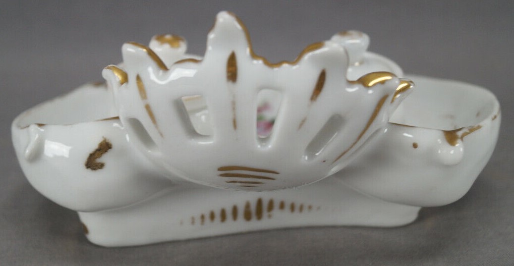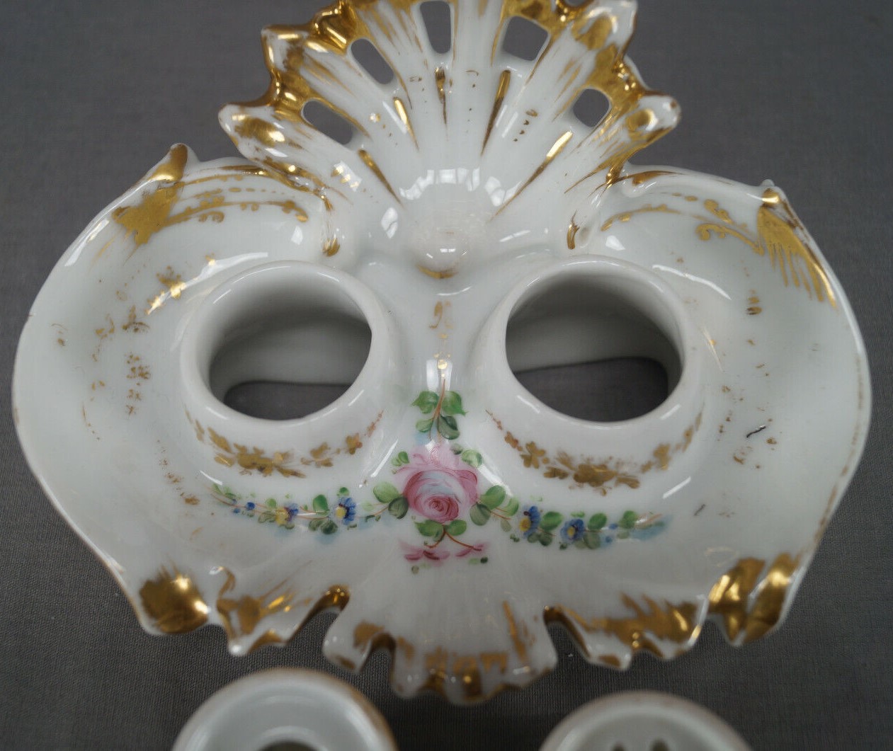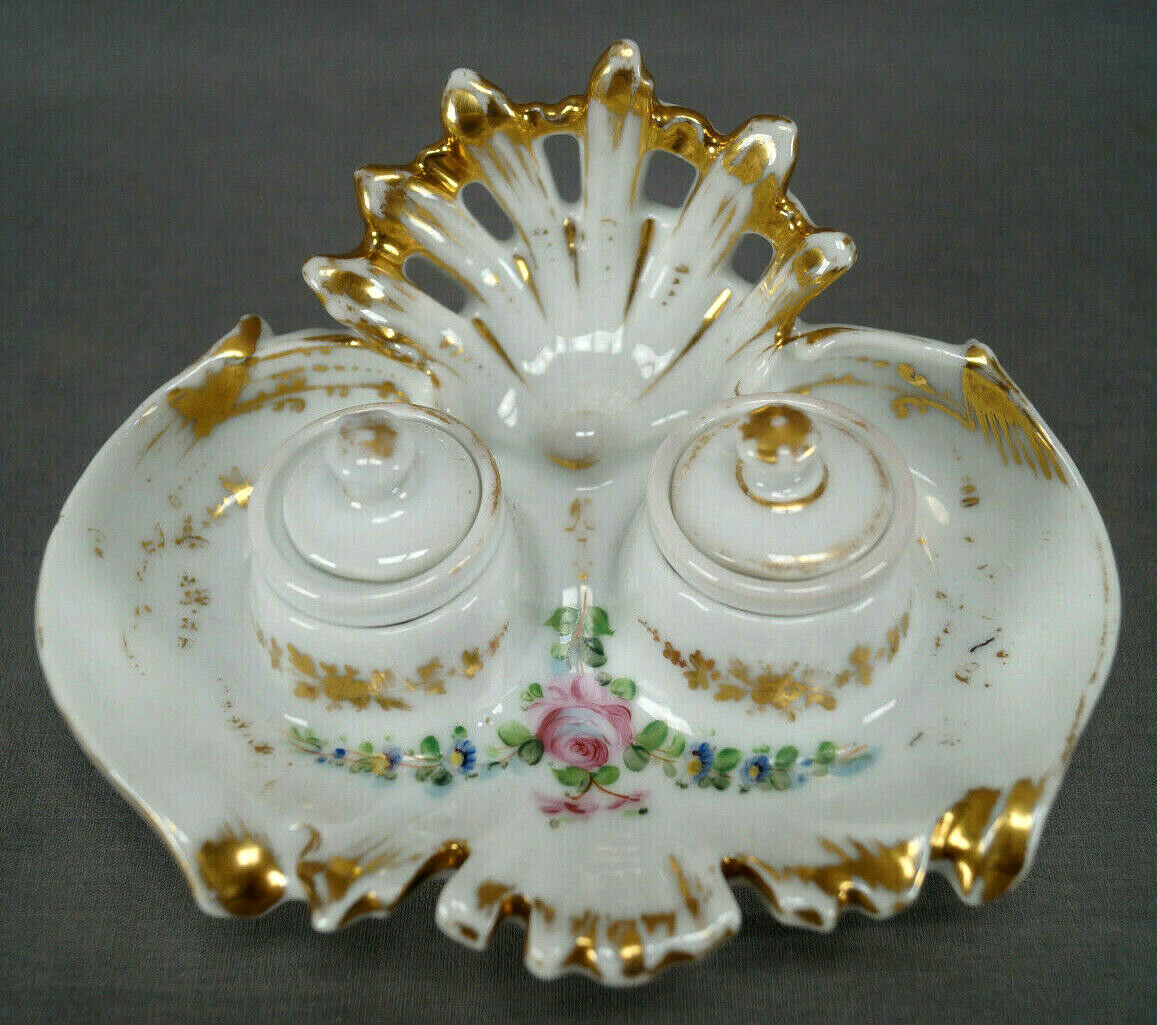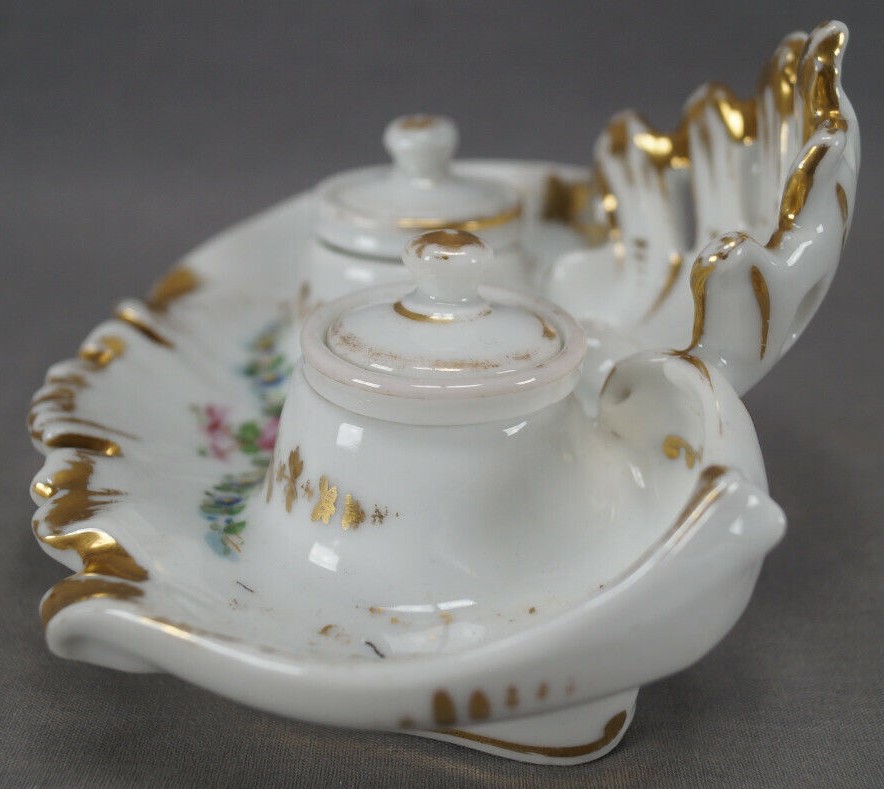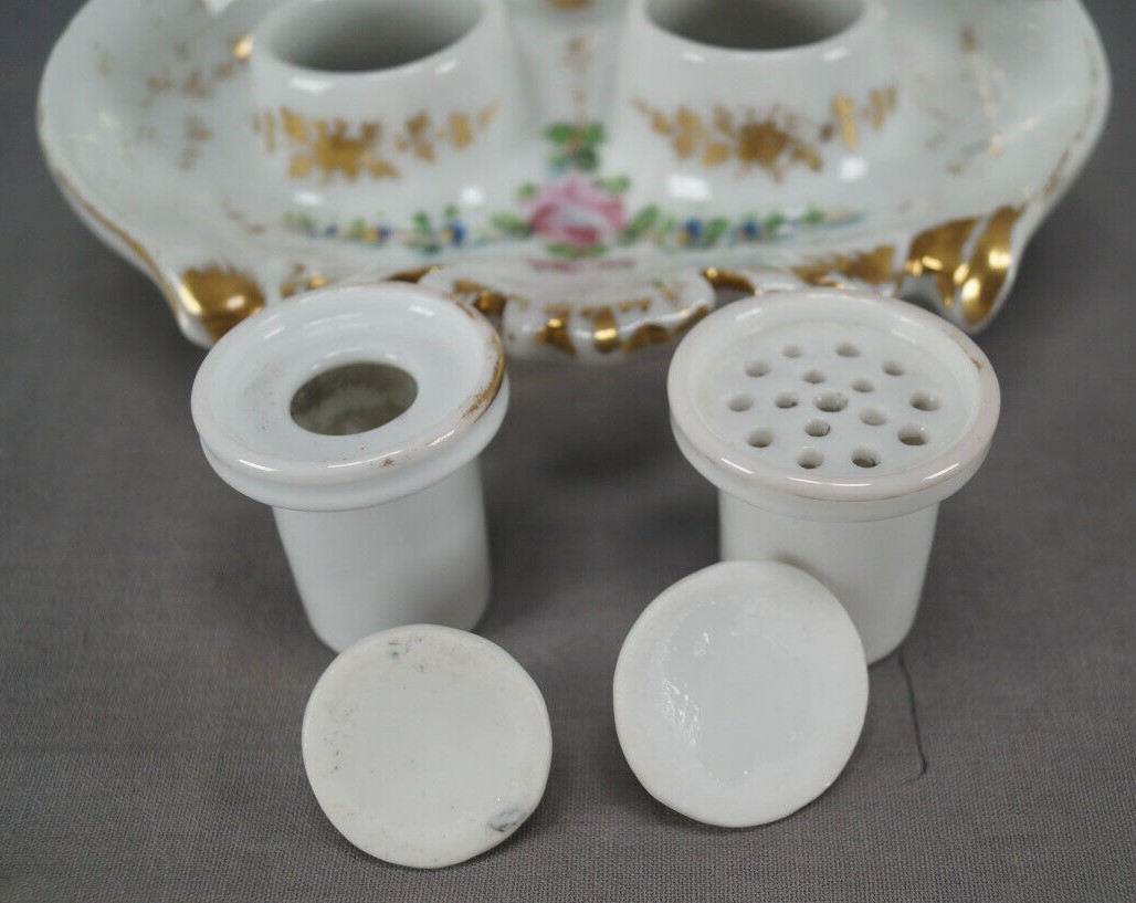 This porcelain inkstand with gold trim holds an inkwell and sander, each with lids. The inkstand is decorated with a hand painted rose and forget-me-nots.