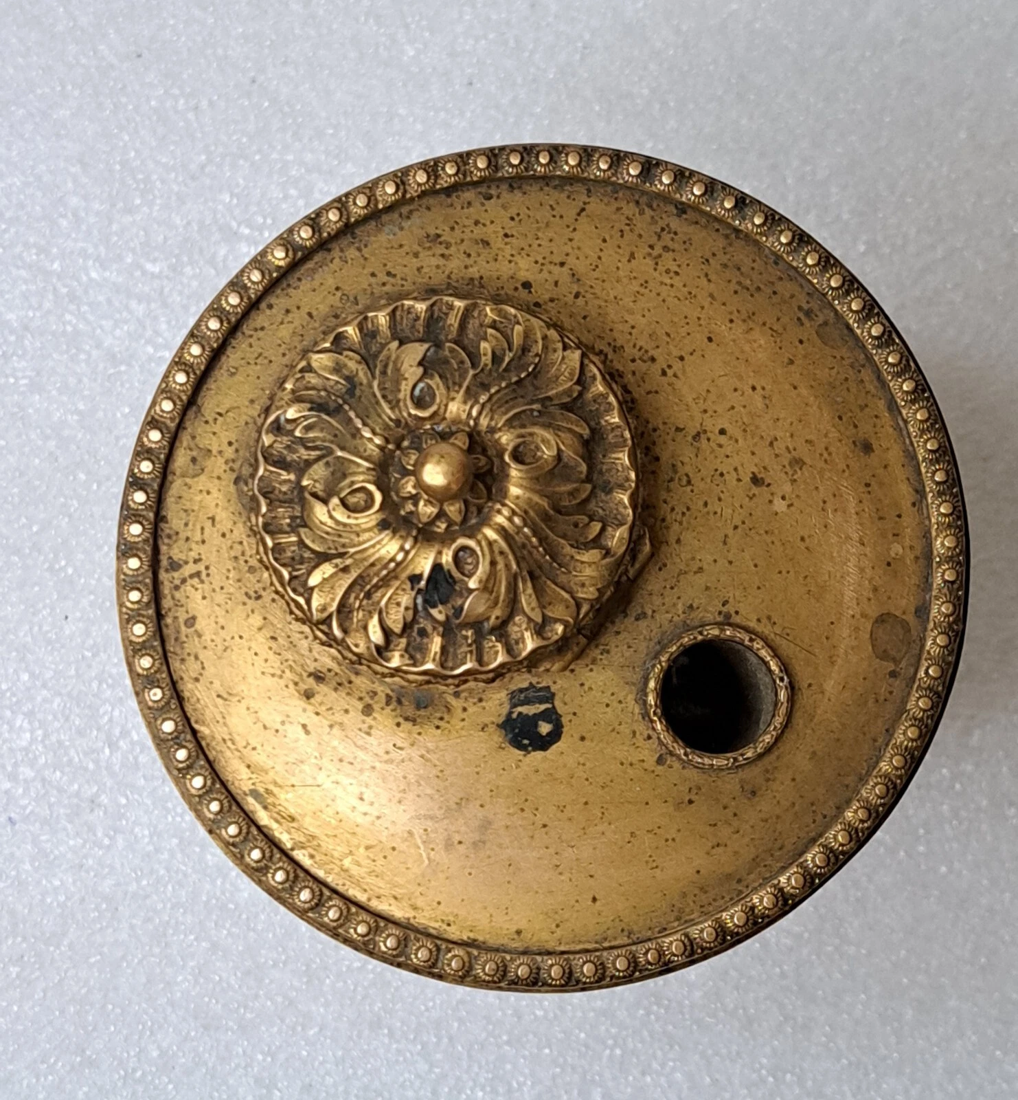 - Quill Hole: A circular opening is located on the bronze top plate, allowing a pen to rest upright.
