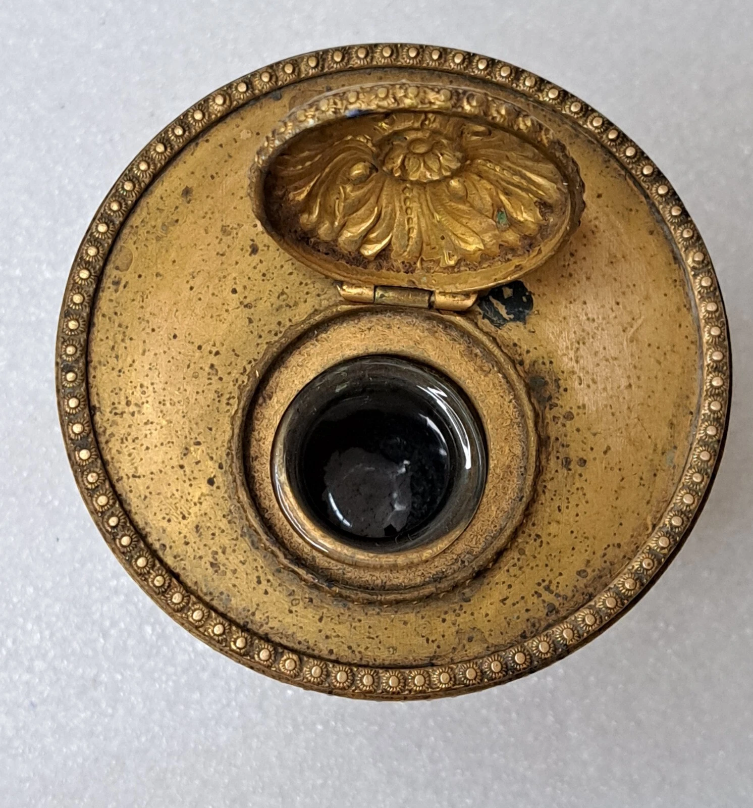 - Internal Well: The lid opens to reveal the original clear glass insert, which remains stained with deep blue-black ink from historical use.