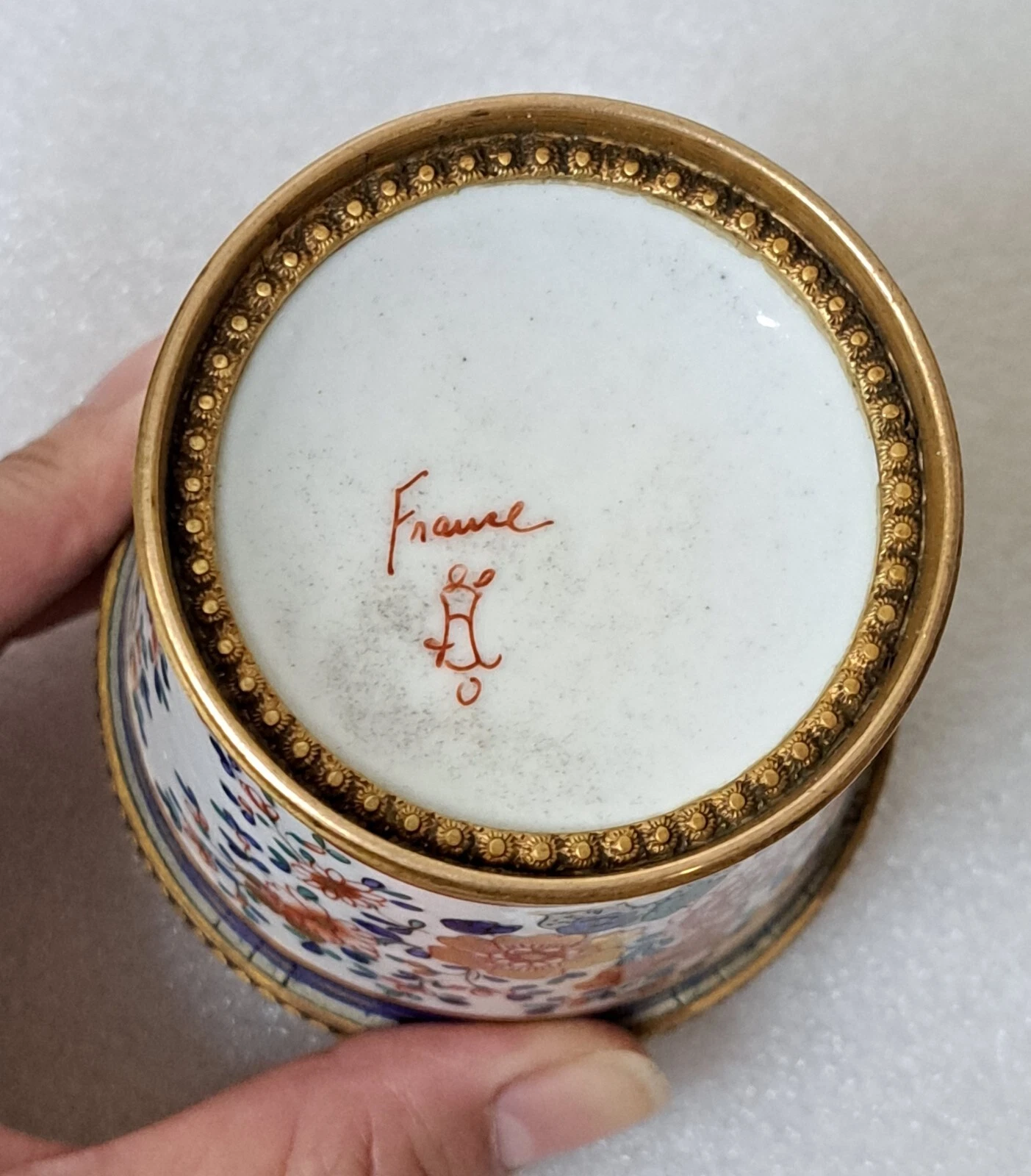 The underside of the porcelain bears a hand-painted mark in iron-red: