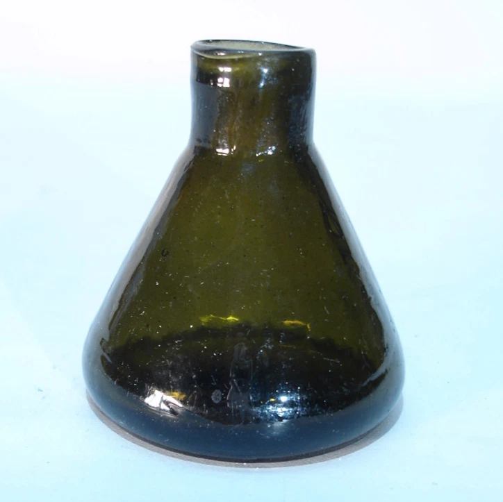 This is an olive-green colored glass cone ink bottle with pontil made in New England.