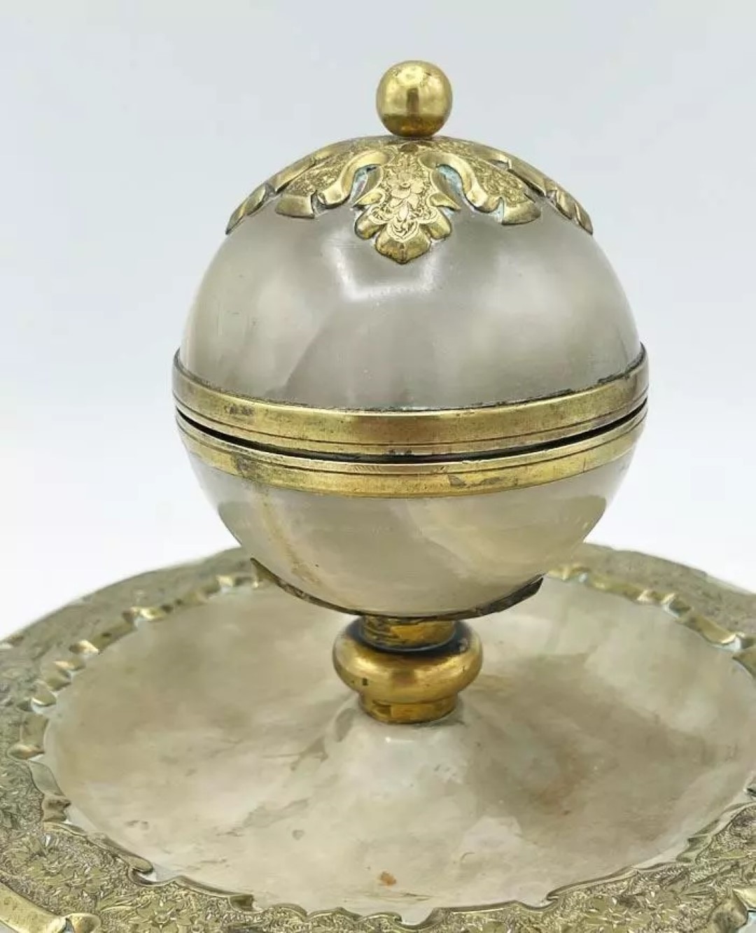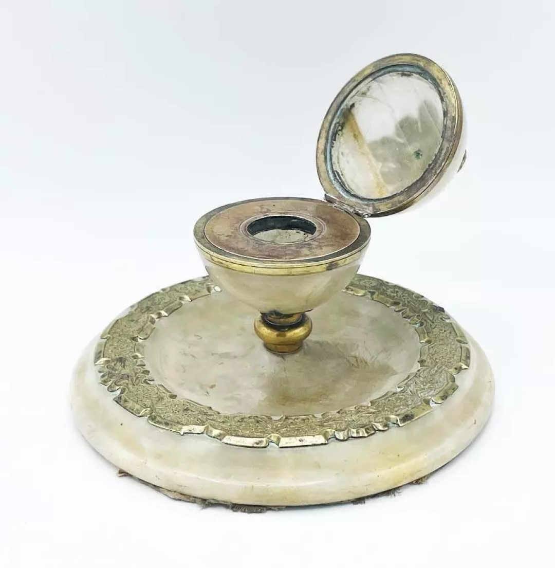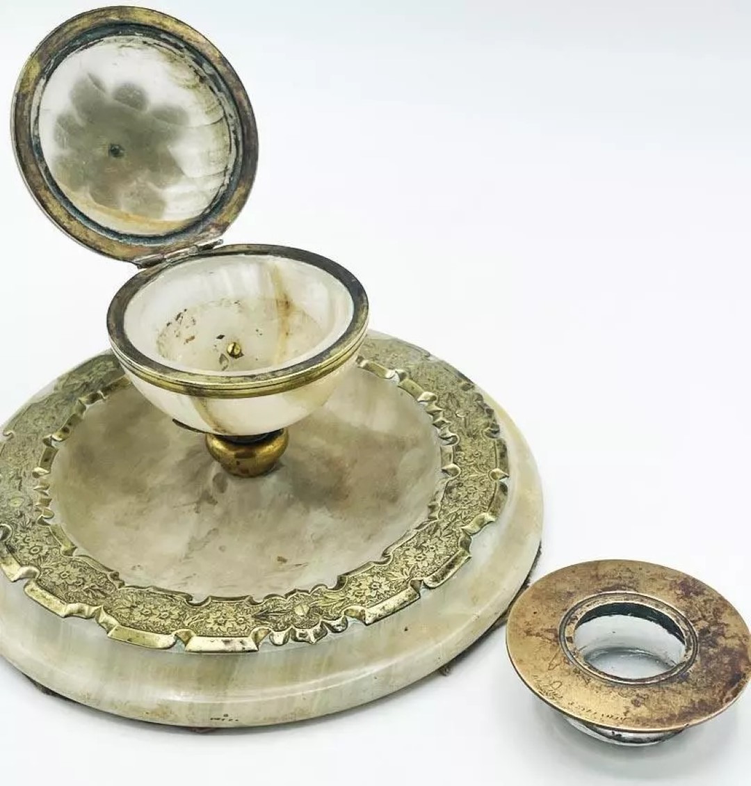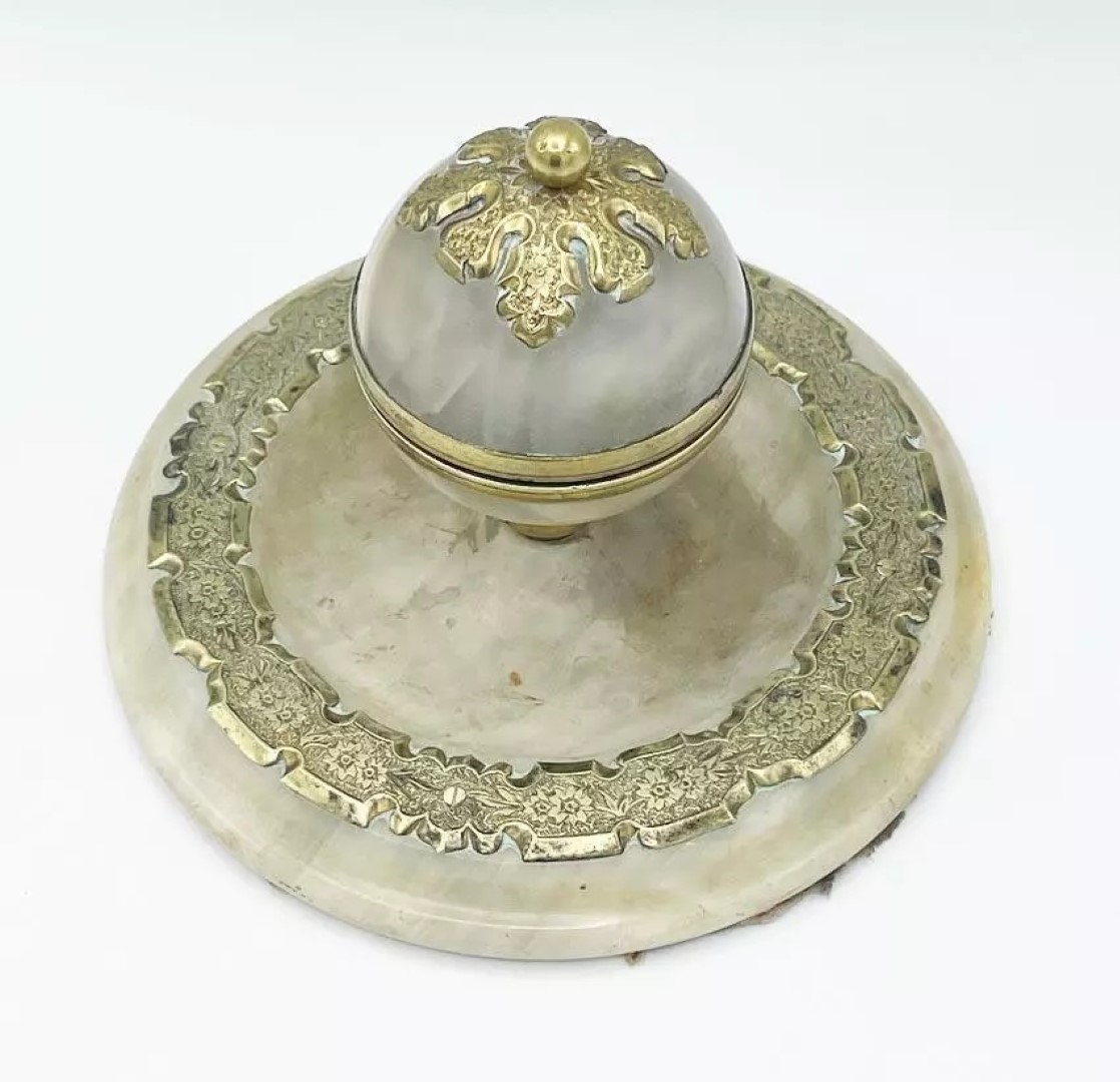 This onyx inkstand features a spherical container resting on a pedestal, all mounted on a flat, round base. The inkstand is adorned with ornamental brass accents, including a decorative band around the sphere’s equator and the rim of the base. The lid of the sphere has a finial shaped in a floral design. It is marked “Bracher & Sydenham, Reading”.