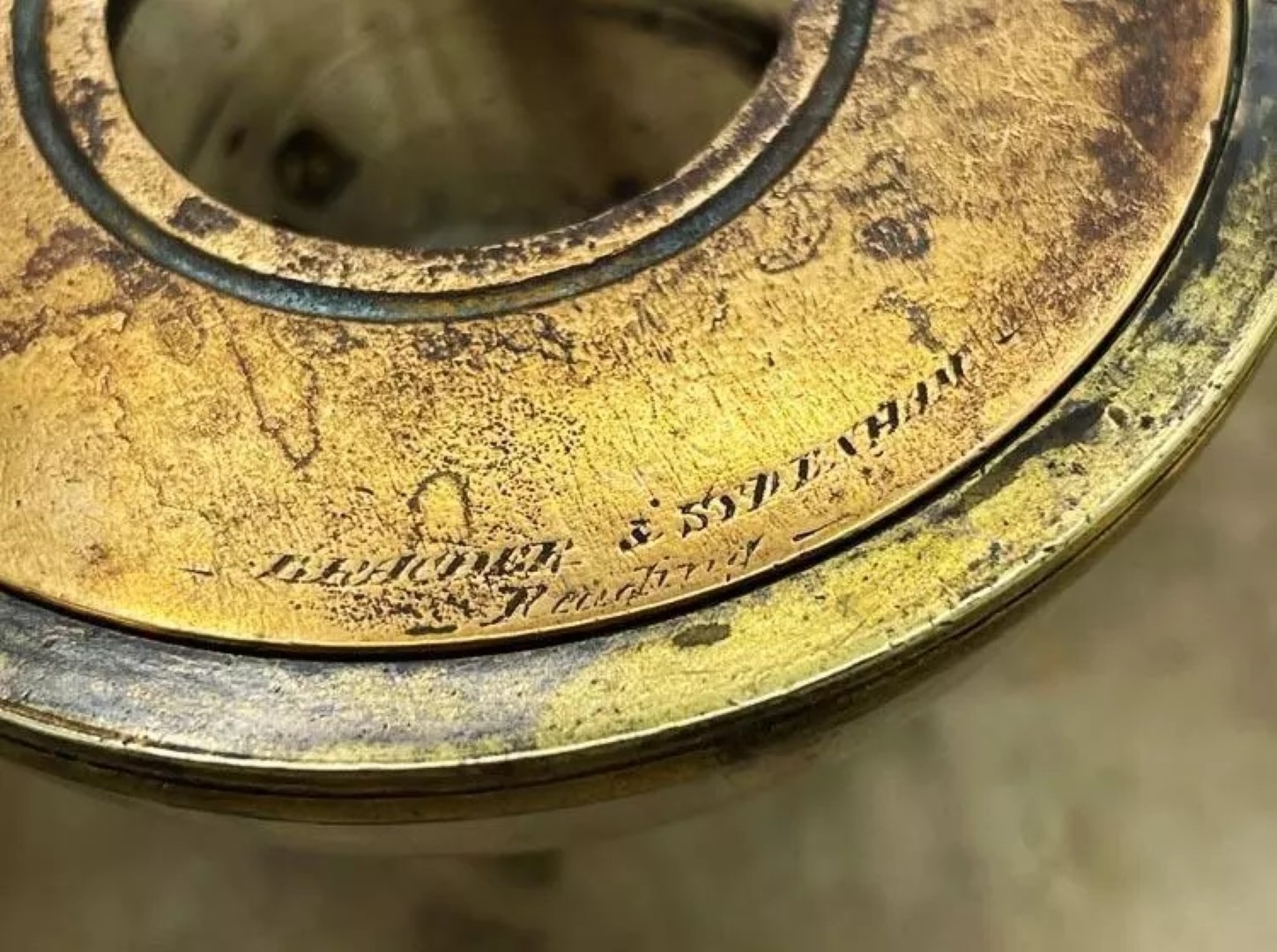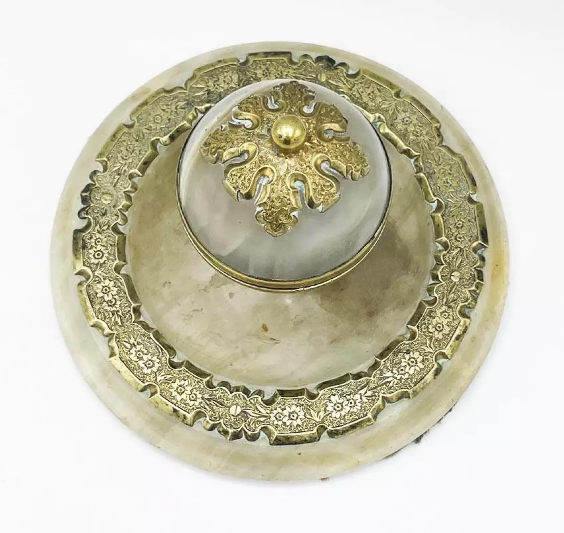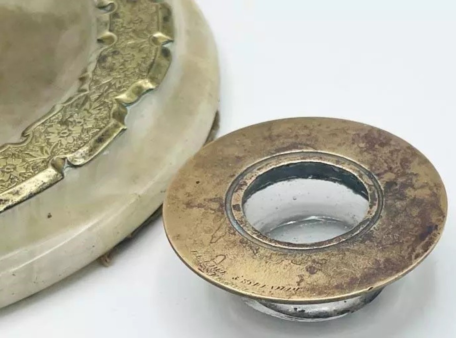 This onyx inkstand features a spherical container resting on a pedestal, all mounted on a flat, round base. The inkstand is adorned with ornamental brass accents, including a decorative band around the sphere’s equator and the rim of the base. The lid of the sphere has a finial shaped in a floral design. It is marked “Bracher & Sydenham, Reading”.