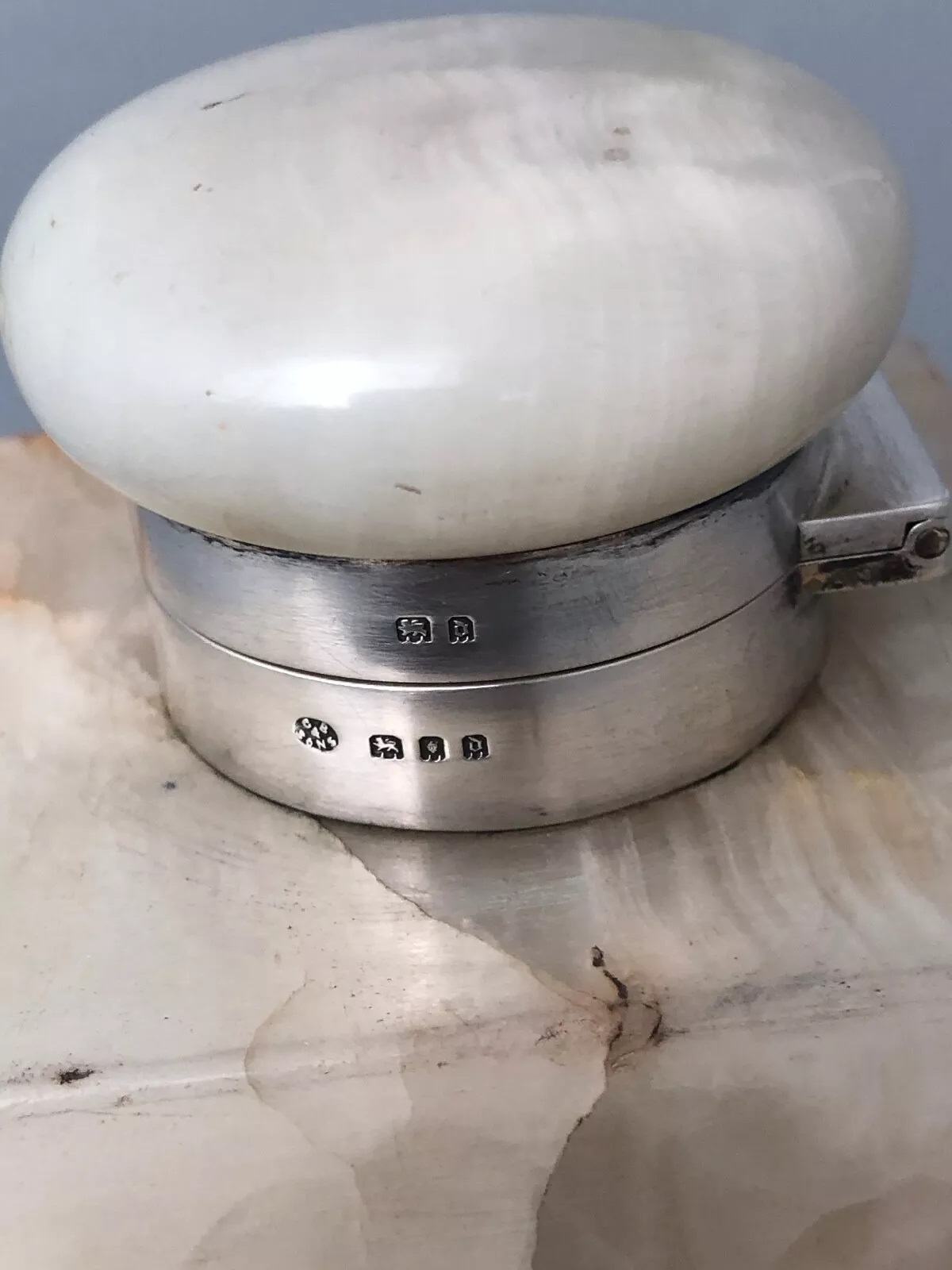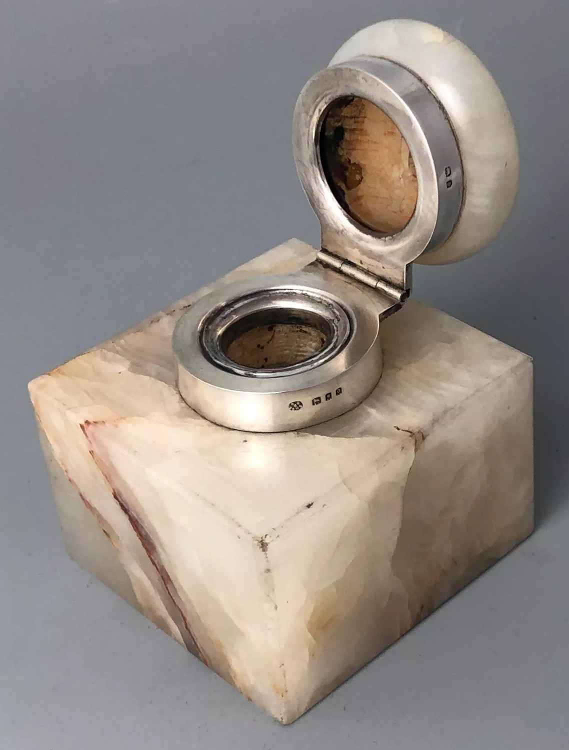 A sterling silver mounted onyx inkwell with glass liner. Hallmarked for George Betjemann, London, 1919.
