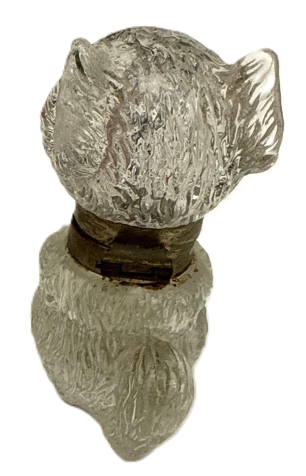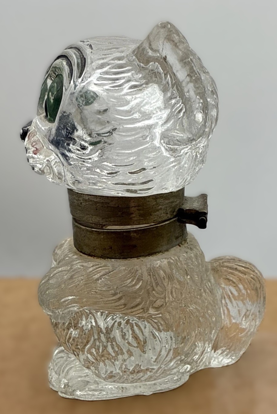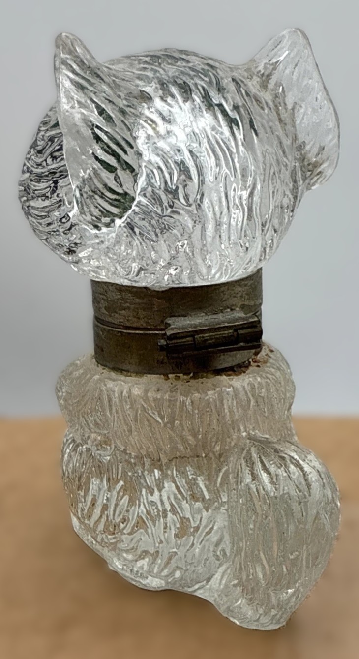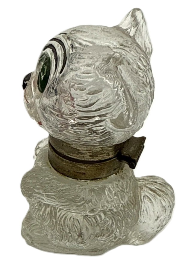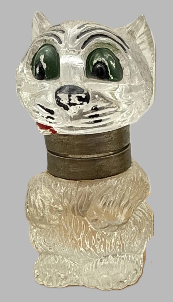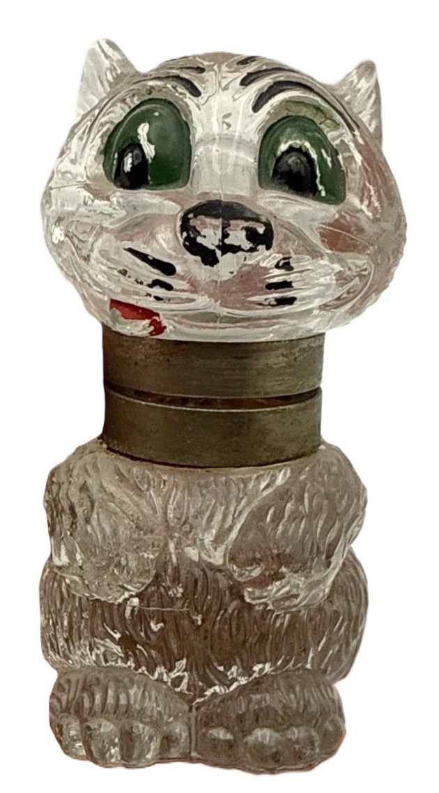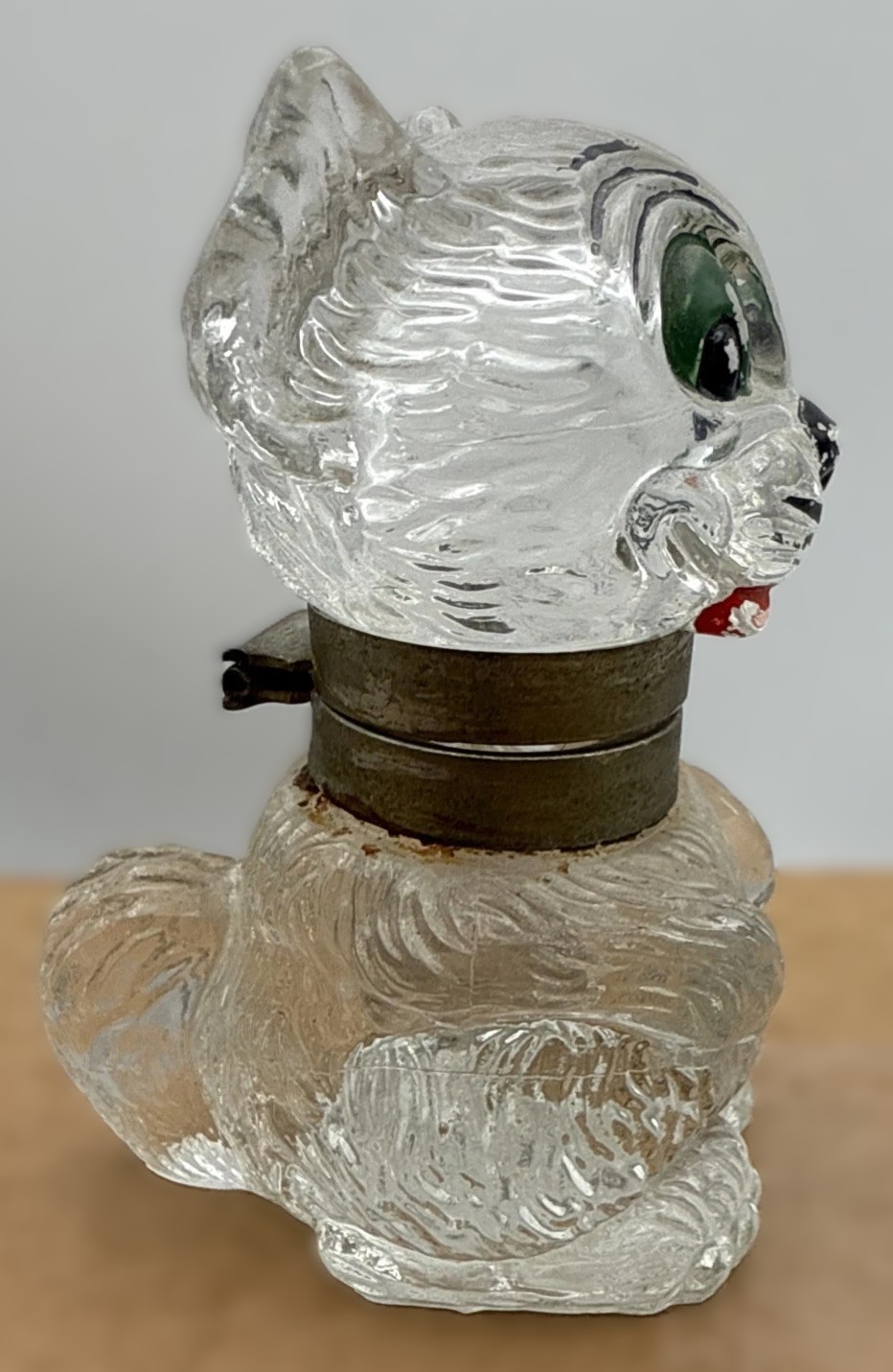 - The Figure: The inkwell is a figural representation of a wide-eyed, mischievous cat cast in translucent glass.