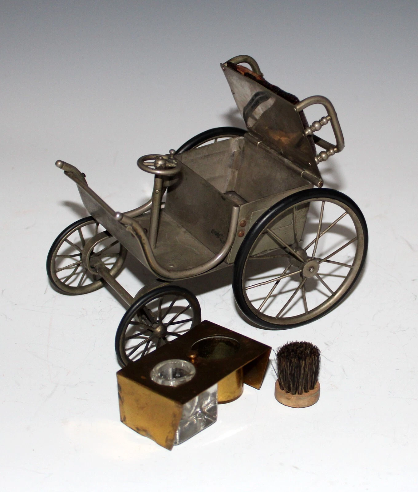 - Hinged Seat: The bench seat, positioned above the larger rear wheels, is hinged. When opened, it provides access to the functional elements of the inkwell:
