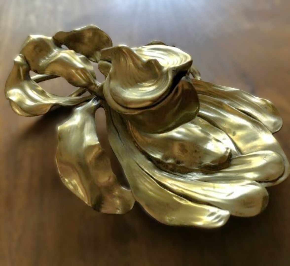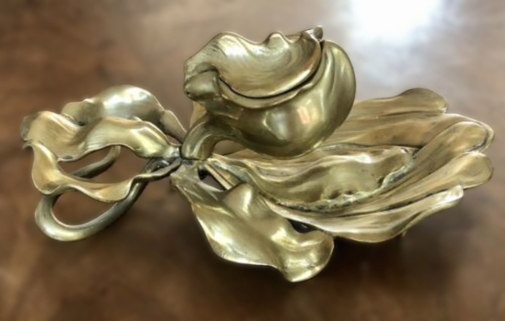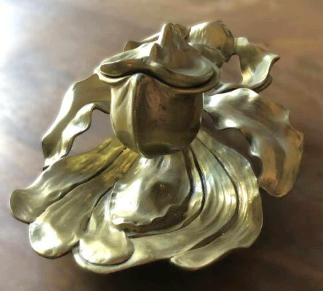 This inkwell is a distinctive example of Art Nouveau figural metalwork, modeled in the form of a large, blooming orchid blossom.