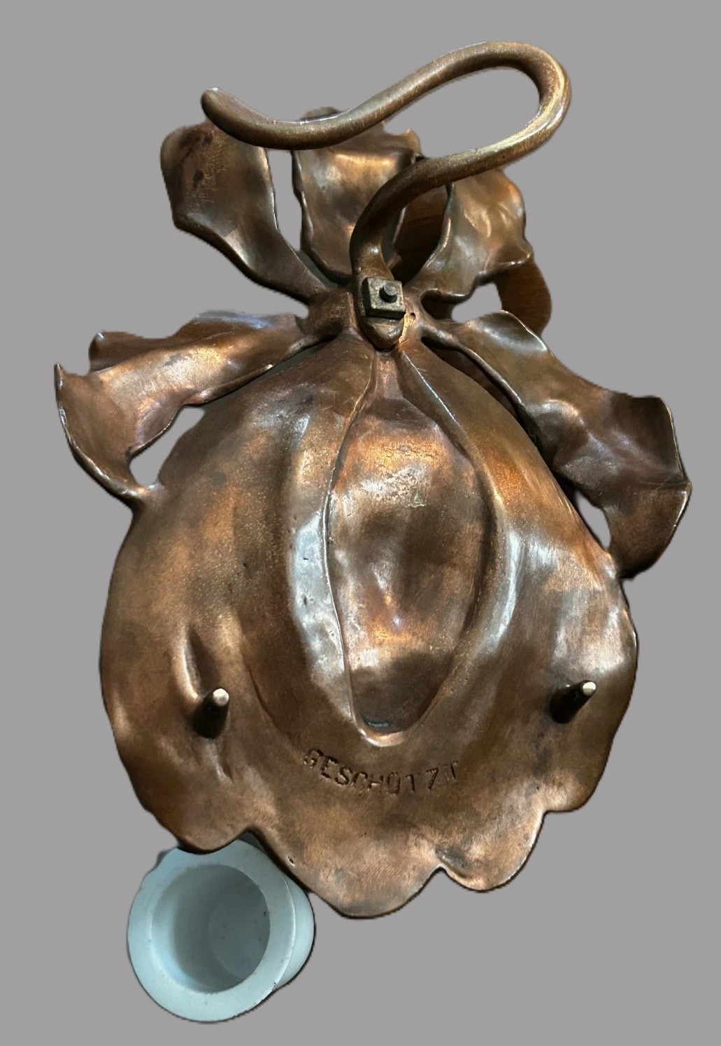 - Material: One piece is crafted from copper, displaying a rich, aged reddish-brown patina with darker accents that highlight the “veins” and folds of the petals. The other example is made of brass. During the Jugendstil period, many foundries produced the exact same design in both copper and brass to offer different price points and aesthetic choices for consumers.