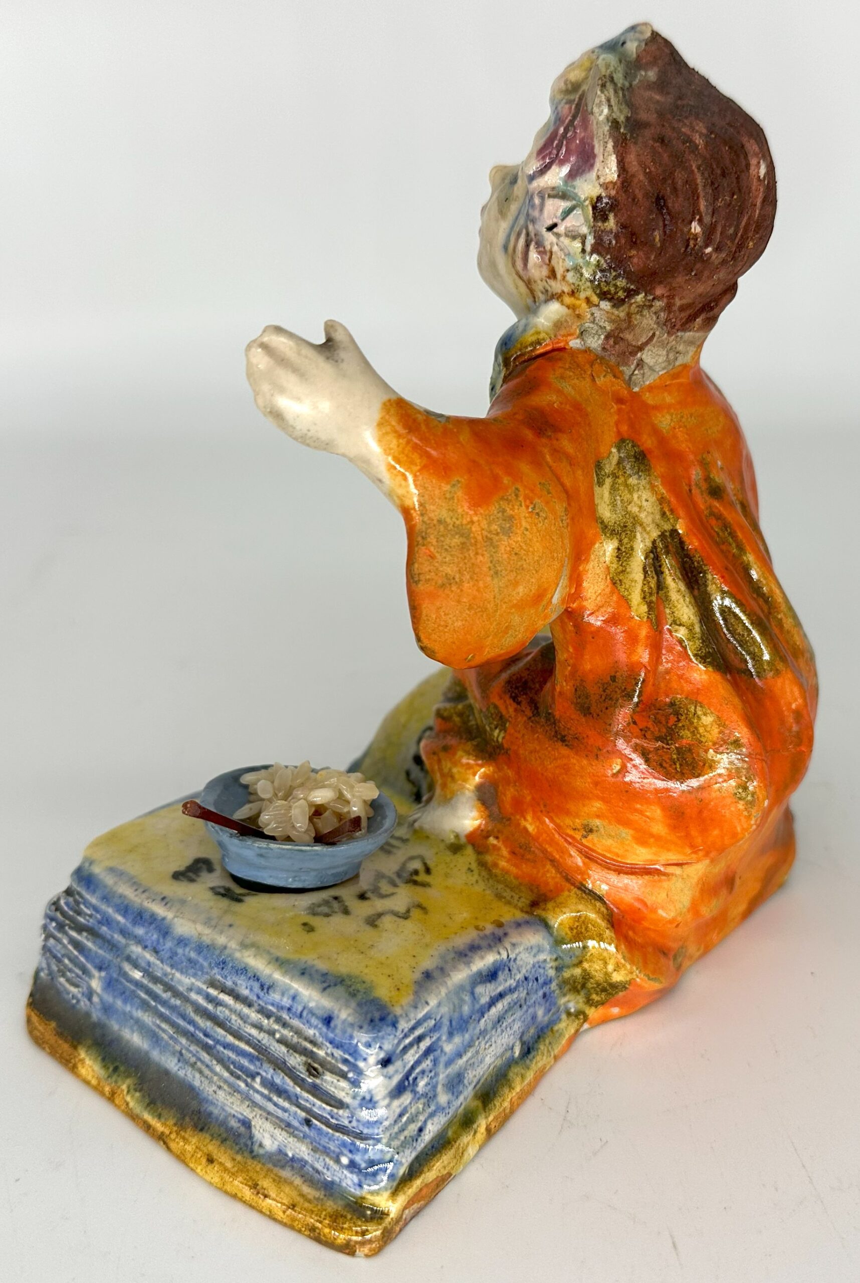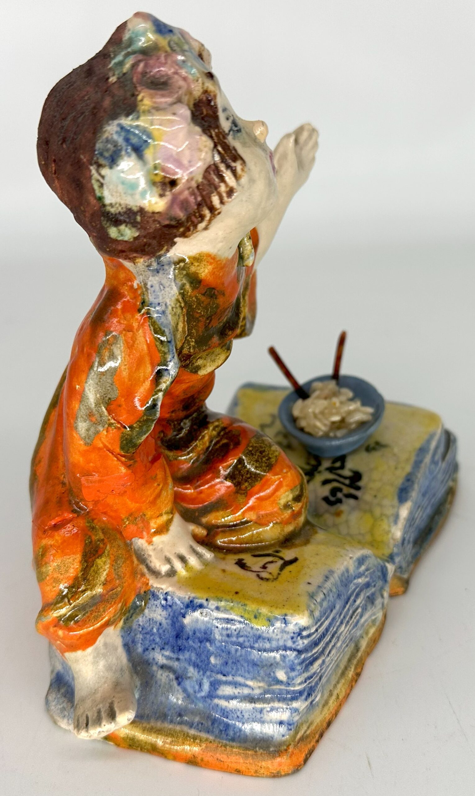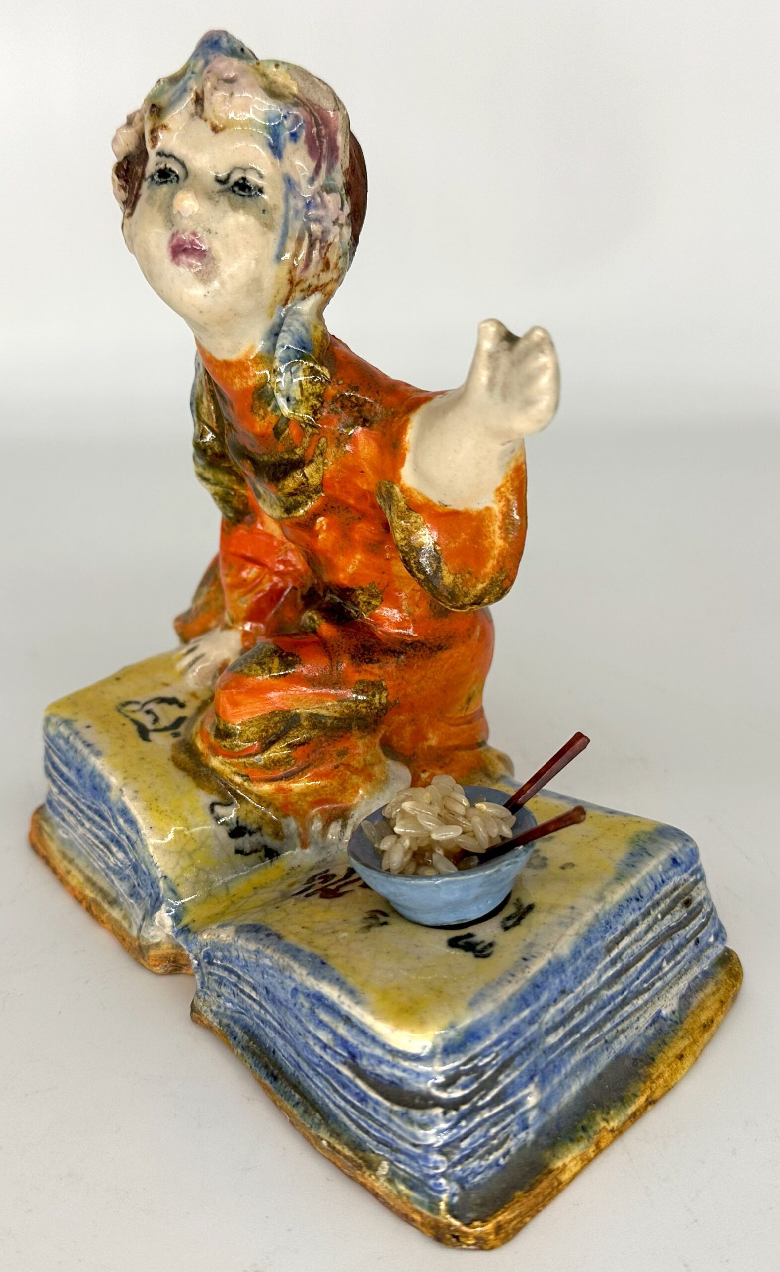This inkstand features a girl kneeling on a large open book, oriental characters showing. Her arm is outstretched. Next to her is a bowl of rice with chopsticks, which is the covering for the inkwell.