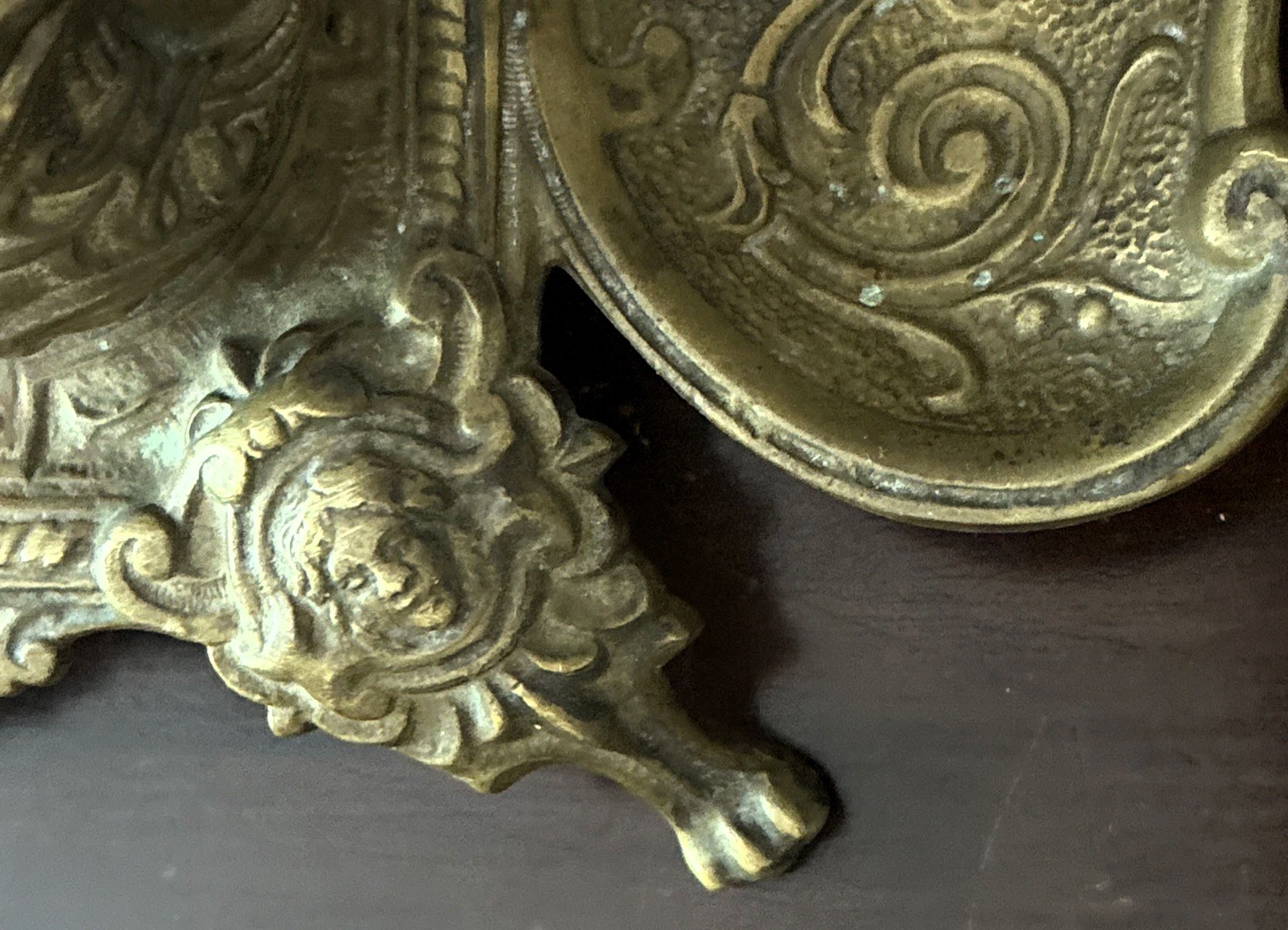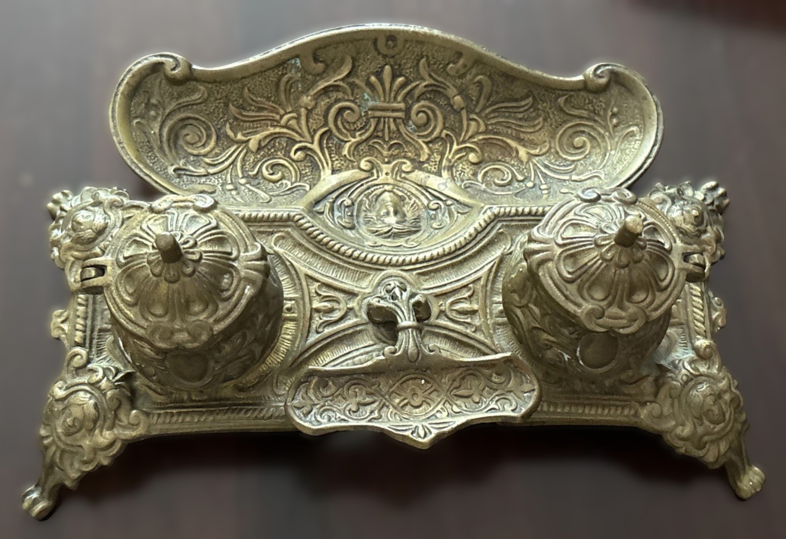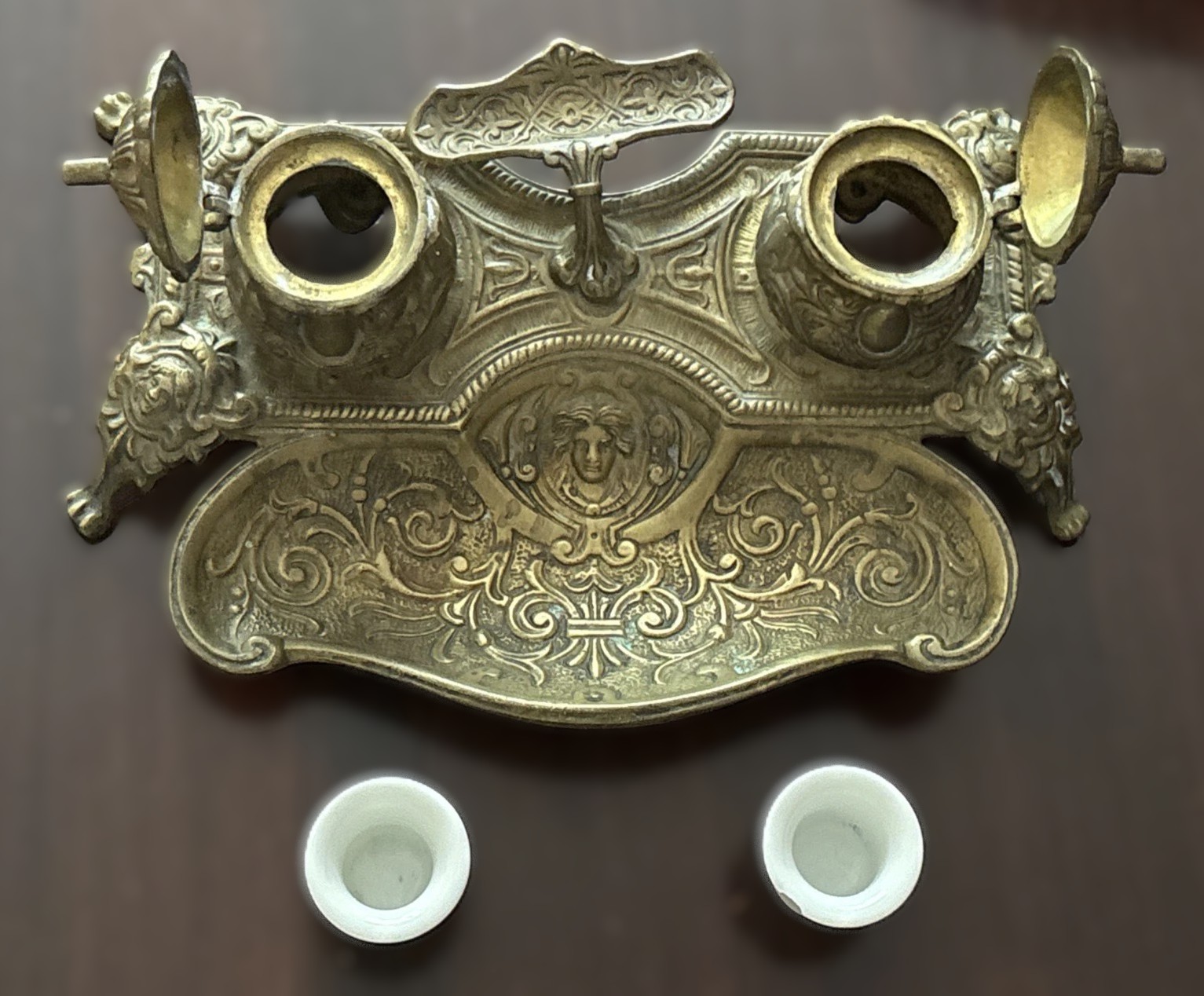- Legs: The inkstand is supported by four ornate legs. Each leg is formed from a mask or face and stylized hair, similar in style to the central figure. These figures are sometimes referred to as “grotesque” masks, a common motif in Renaissance and Neoclassical design.