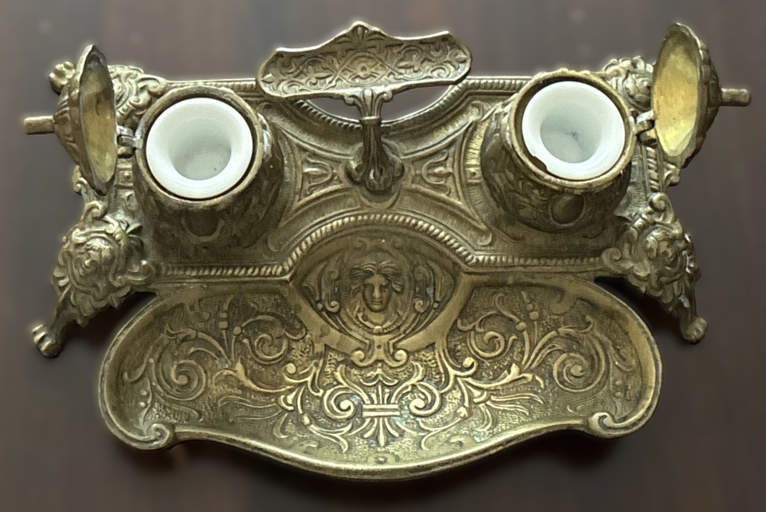 Inkwells: Each of the two circular inkwells is covered by a hinged lid, topped with a decorative finial. The lids are embossed with a radial pattern, and the inkwell containers themselves have a similar design. The inkwell is complete with its original removable ceramic inserts.