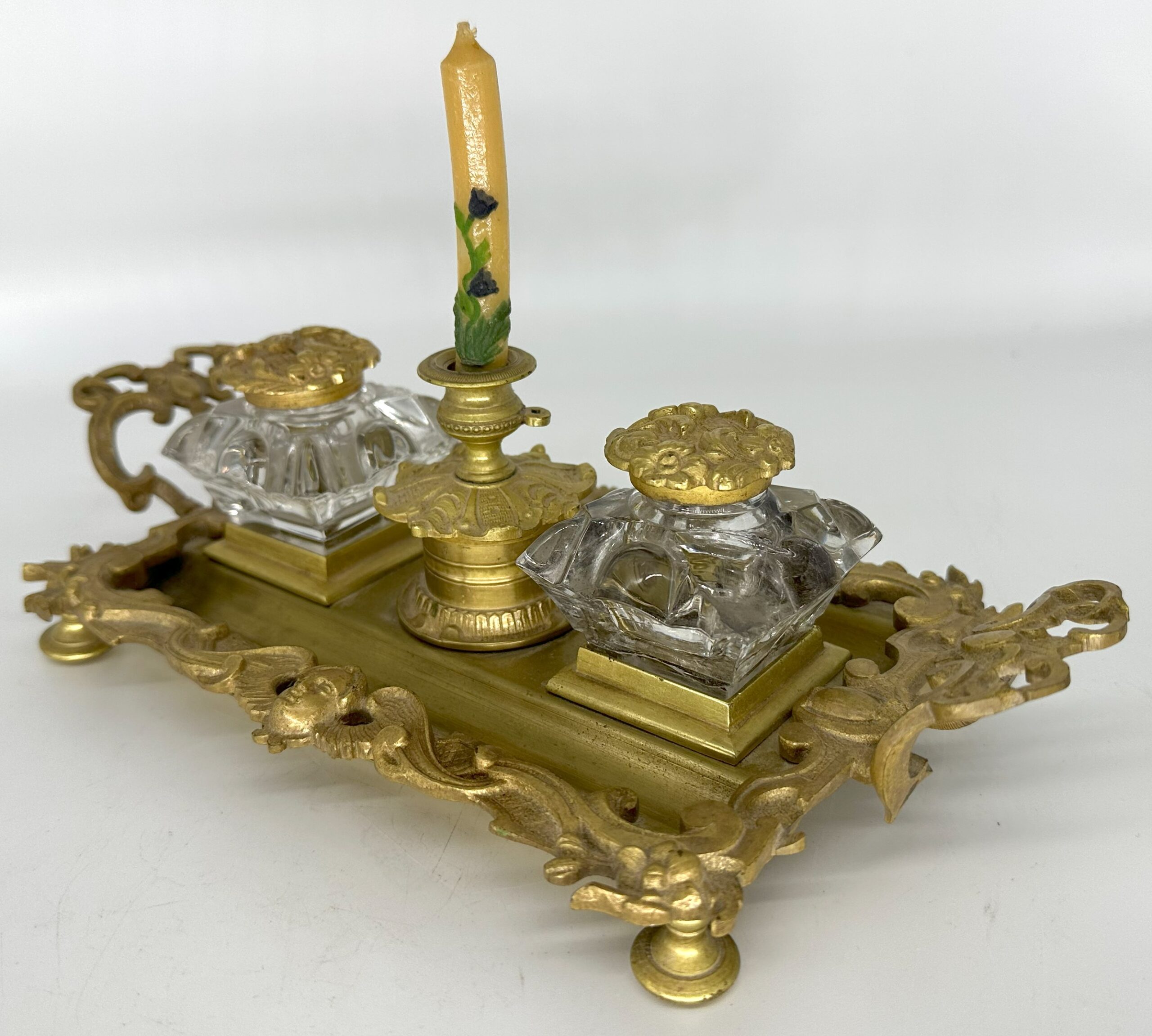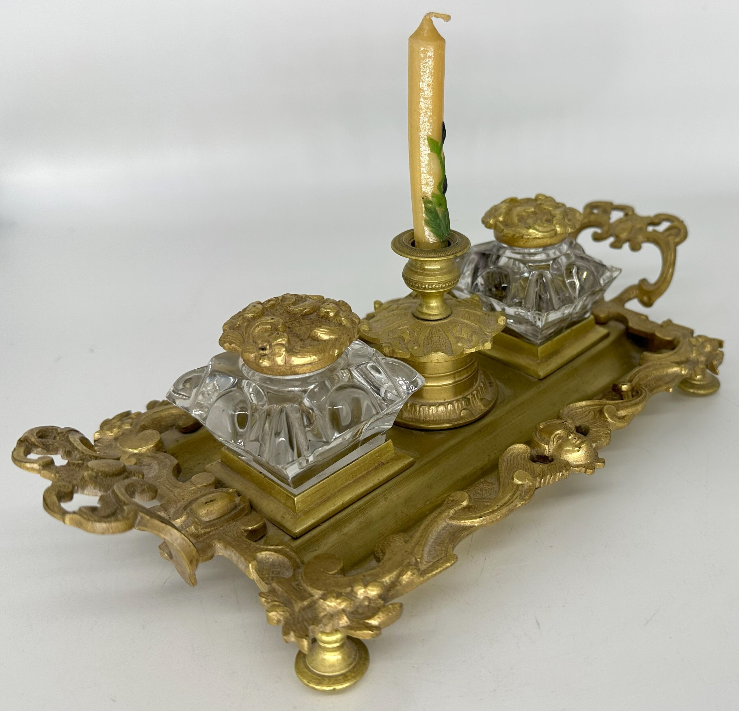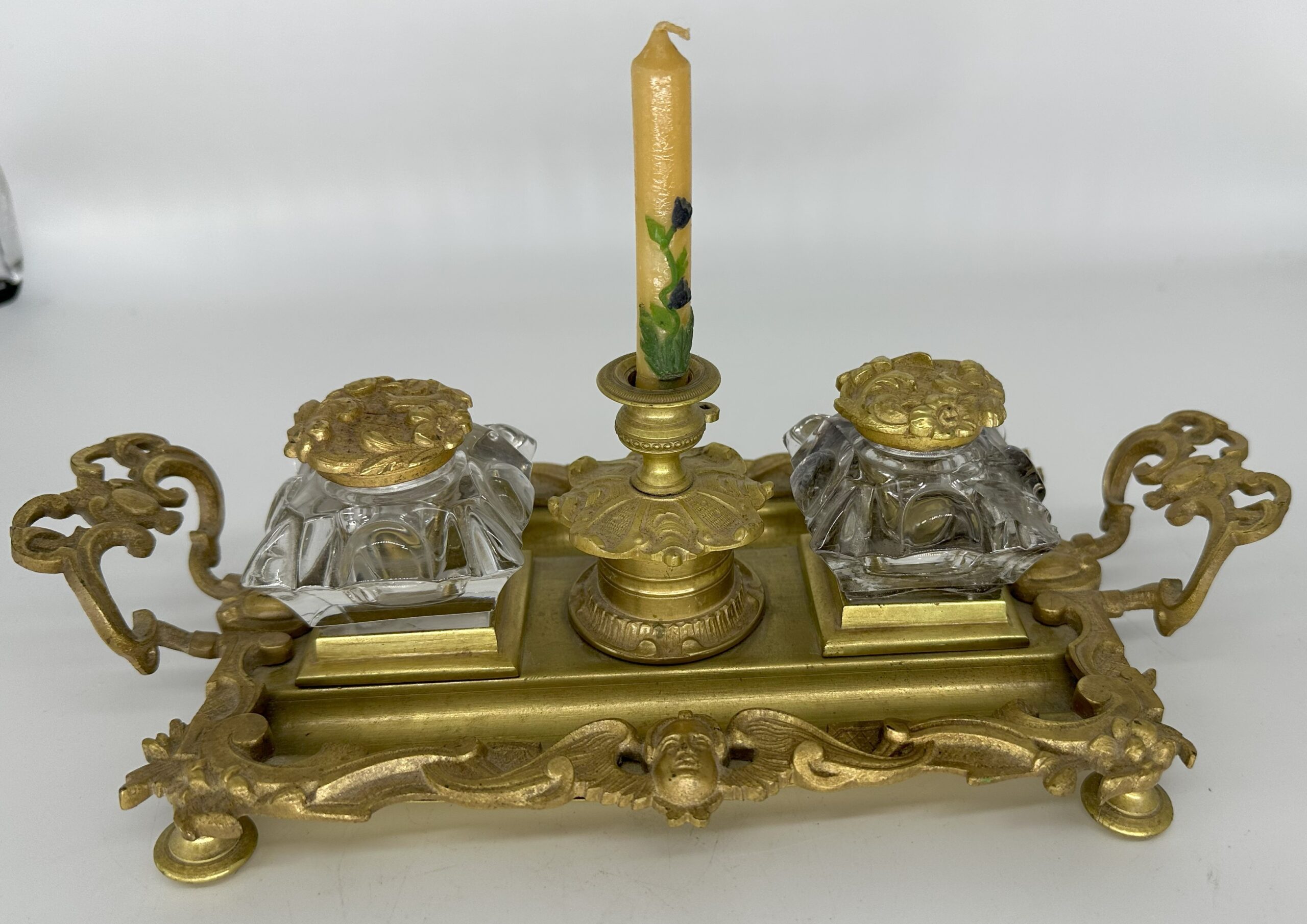 This cast brass double inkstand has two pen channels, handles, and two cut glass inkwells with separate lids. In the middle is a candleholder forming a lid for a nib/wafer storage compartment. Ornamentation with scrolls and faces completes the piece.