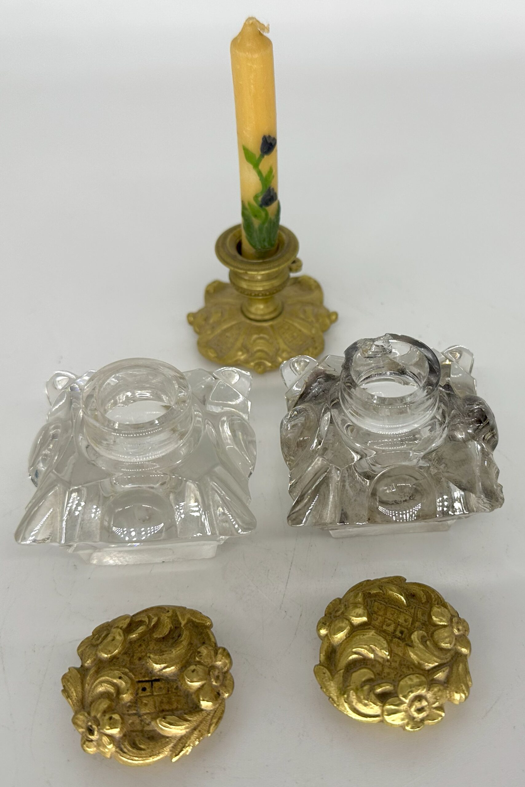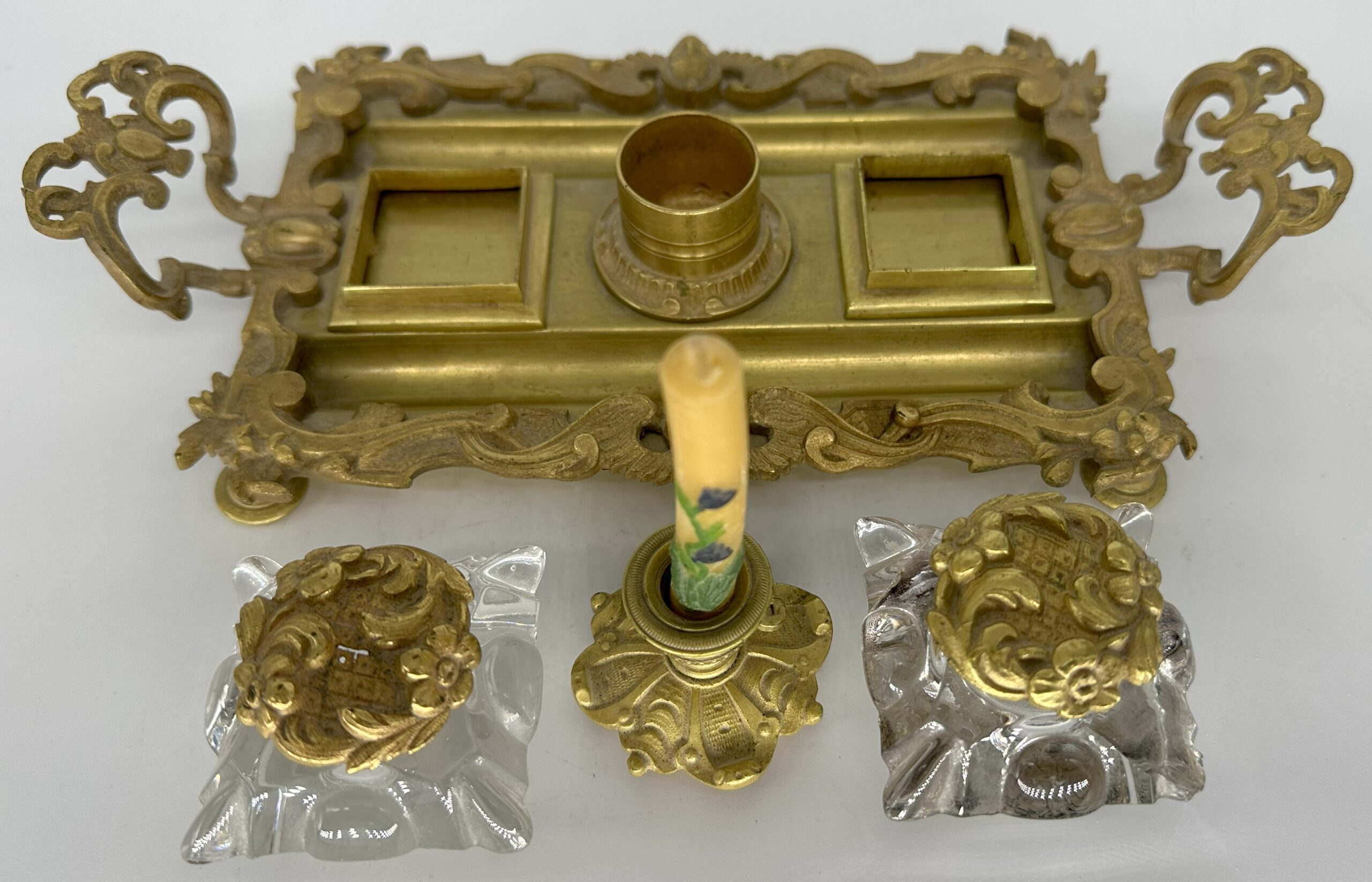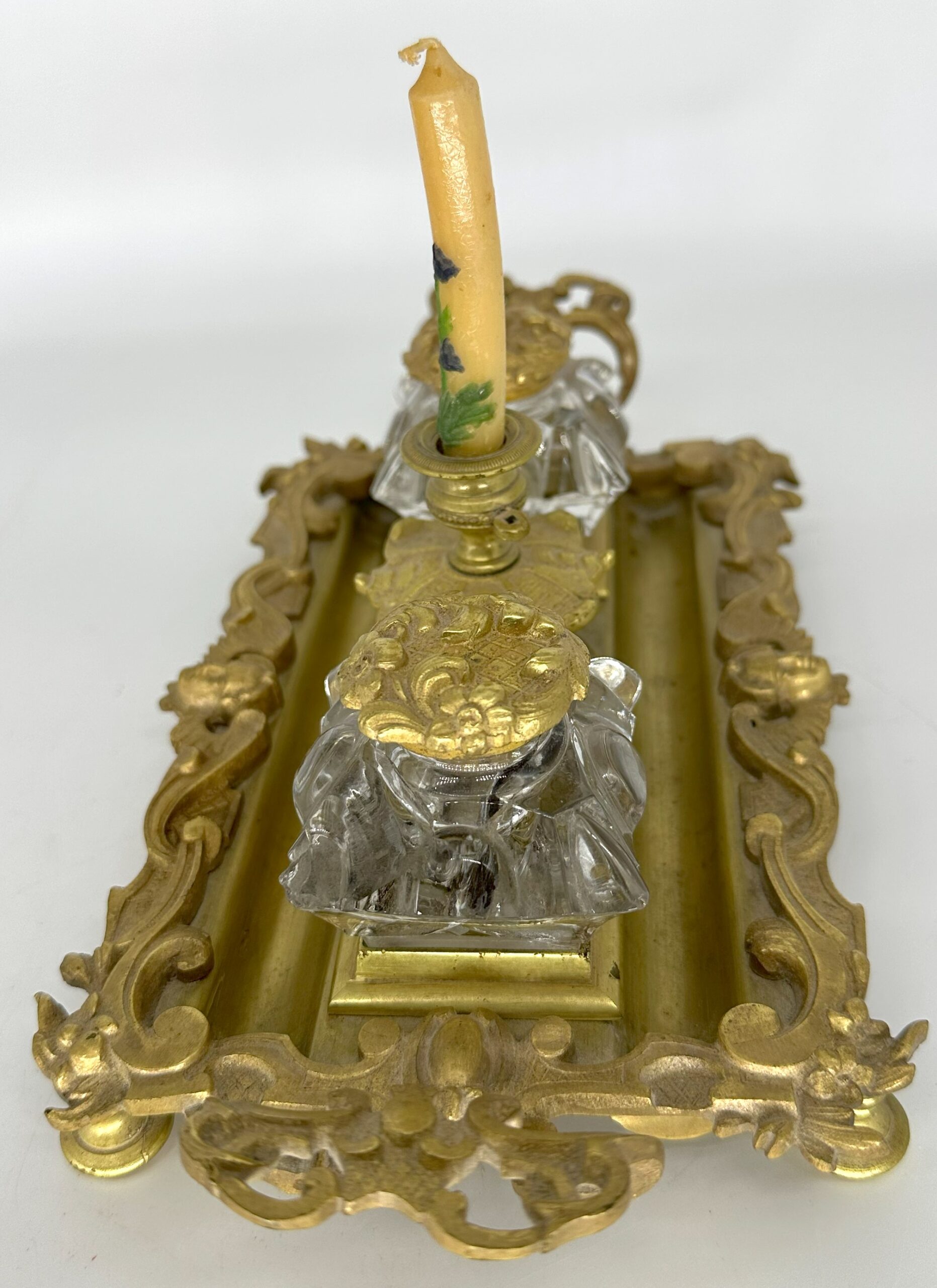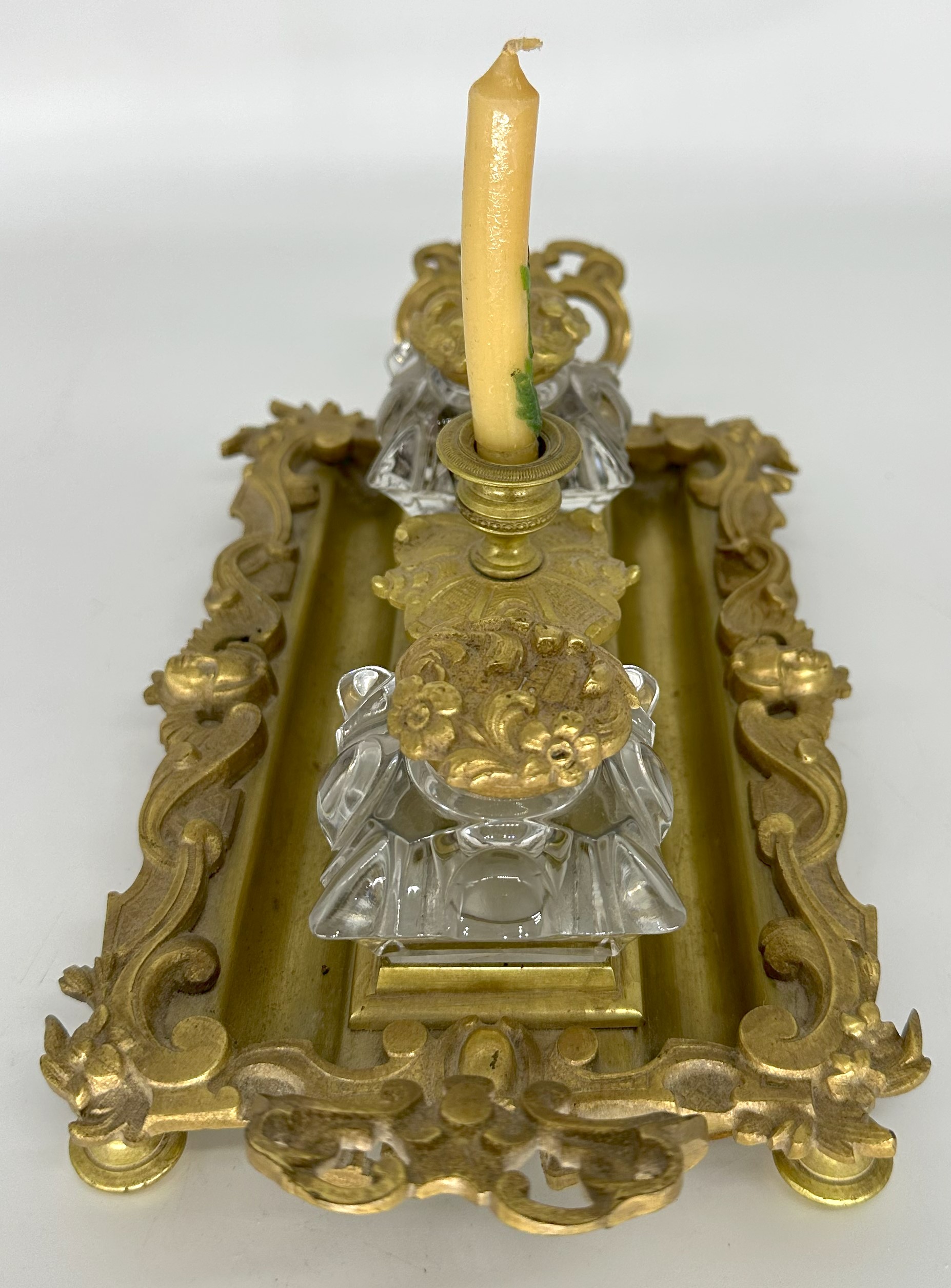 This cast brass double inkstand has two pen channels, handles, and two cut glass inkwells with separate lids. In the middle is a candleholder forming a lid for a nib/wafer storage compartment. Ornamentation with scrolls and faces completes the piece.