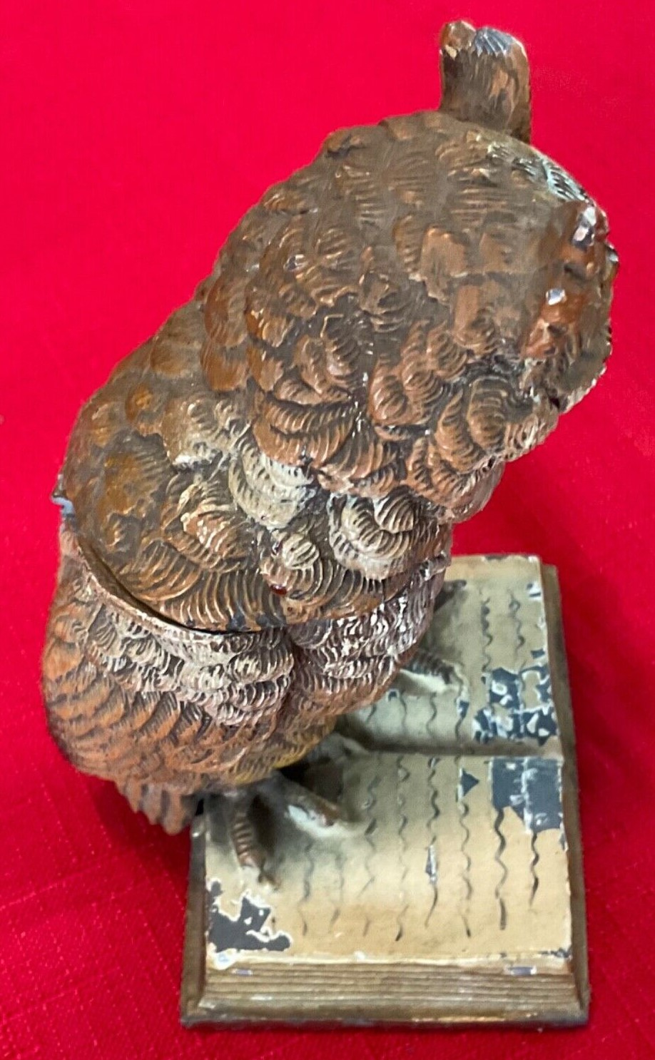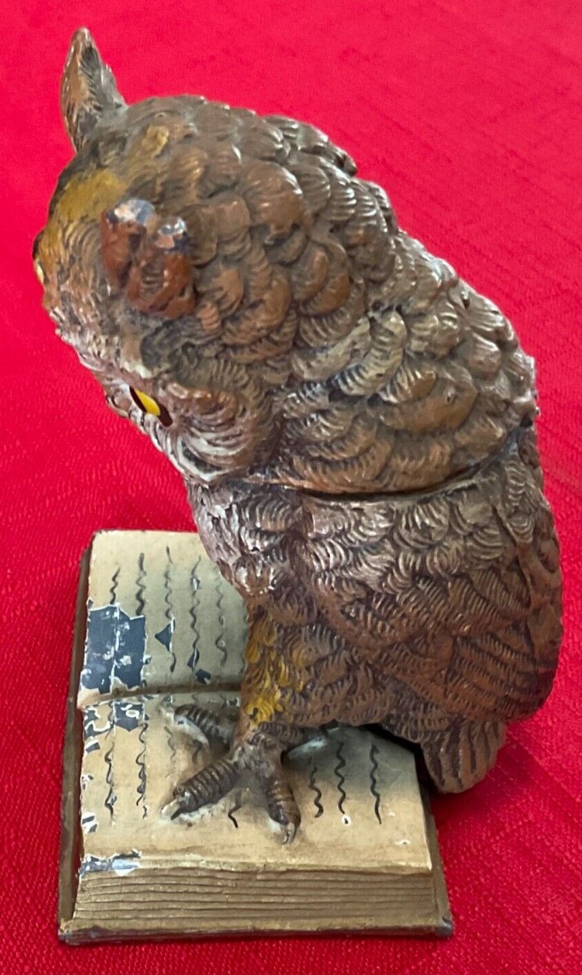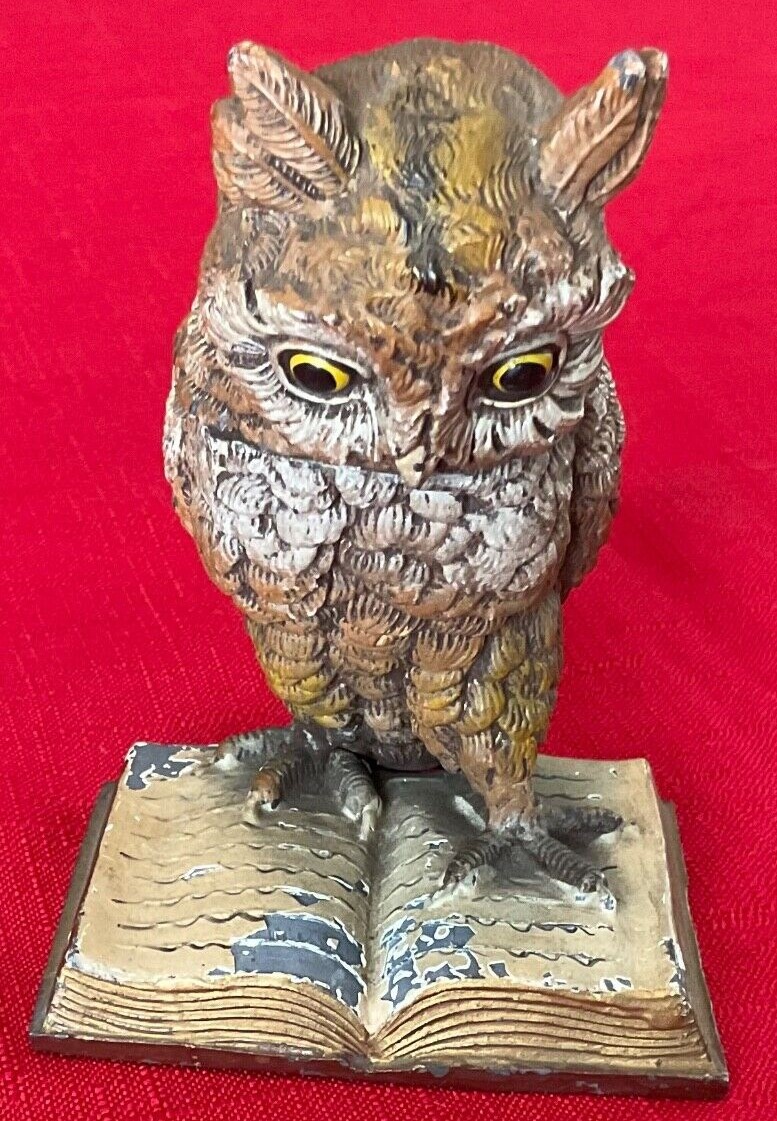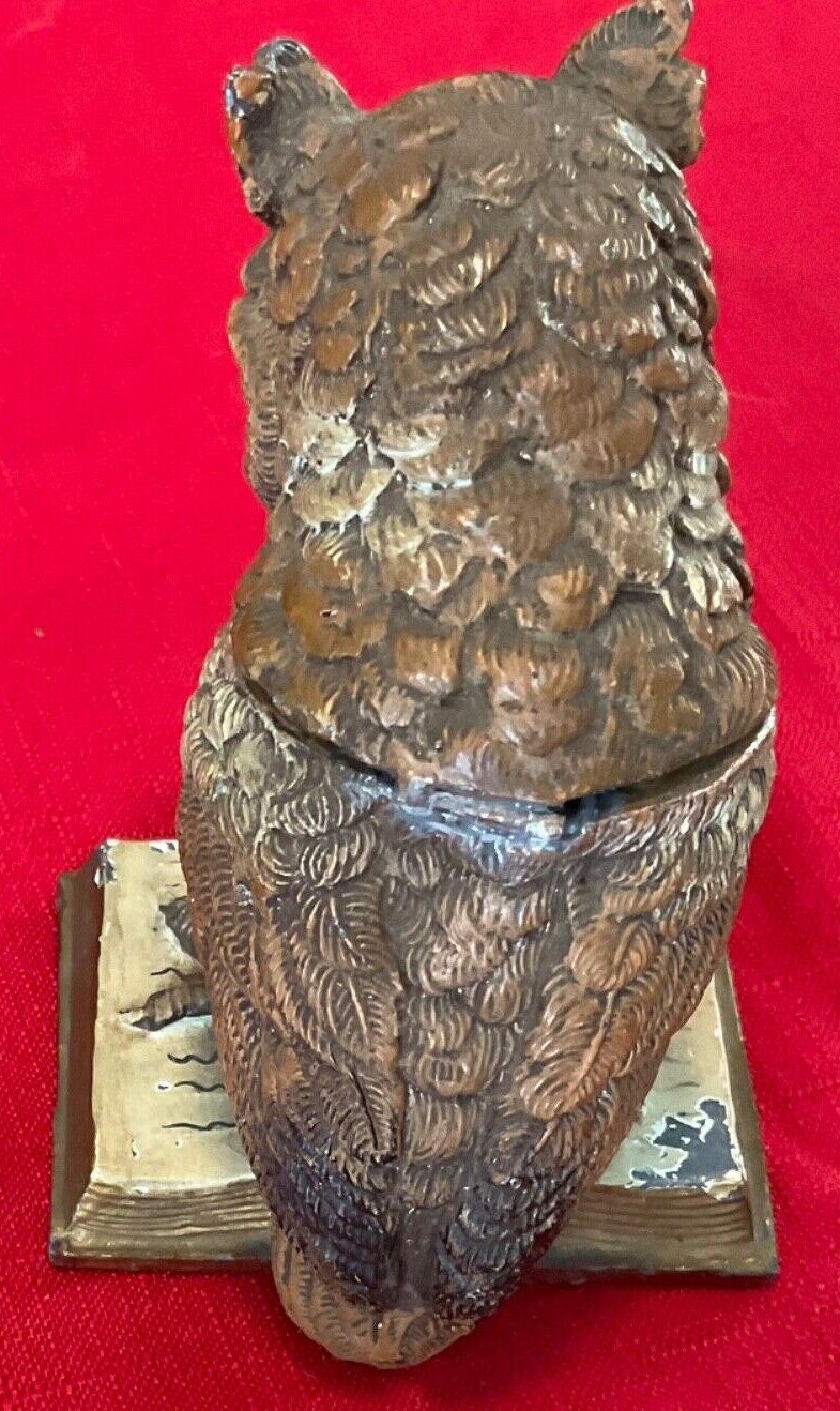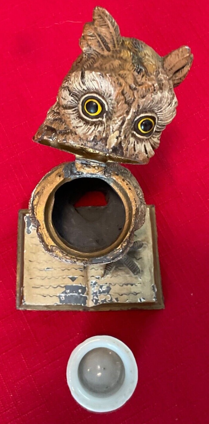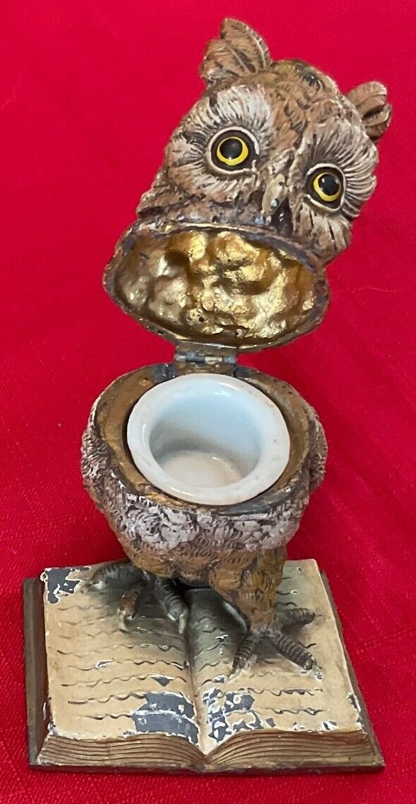 A cold-painted, realistically rendered owl made of mixed metals stands on an open book. His eyes are made of glass. His head is hinged and opens to access a milk glass inkwell.