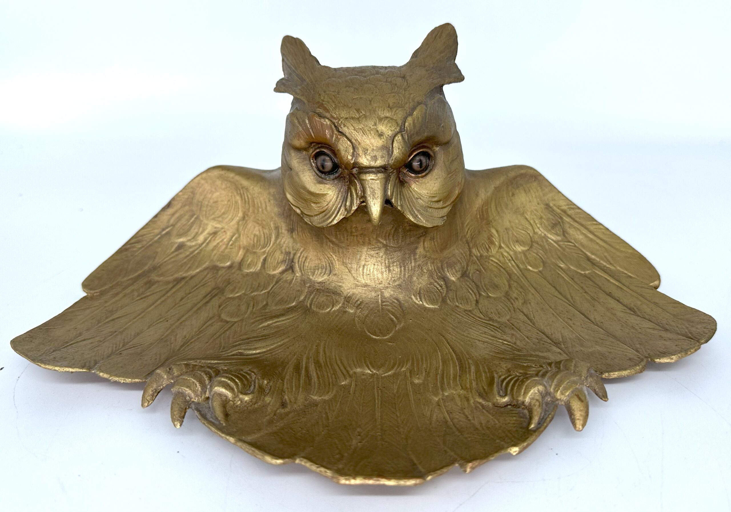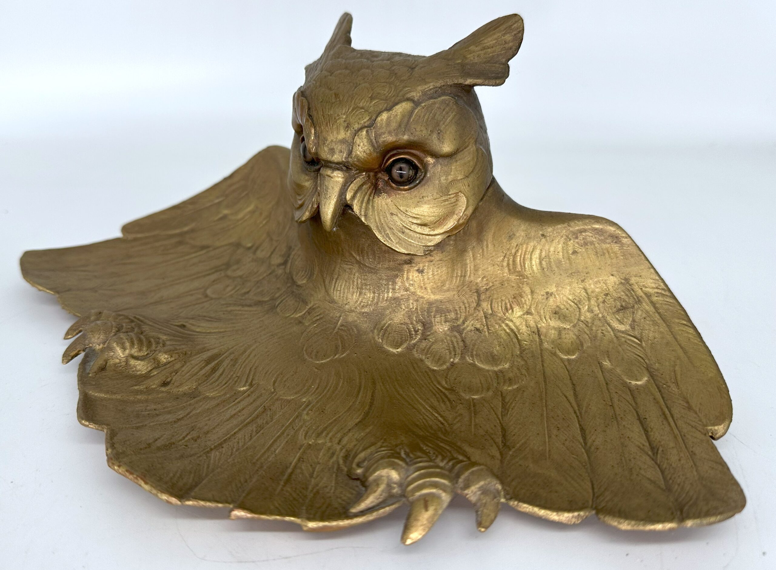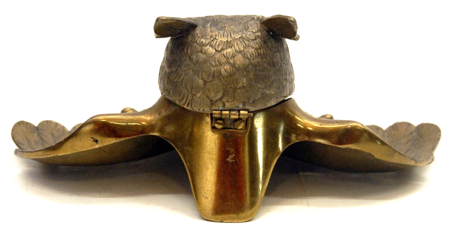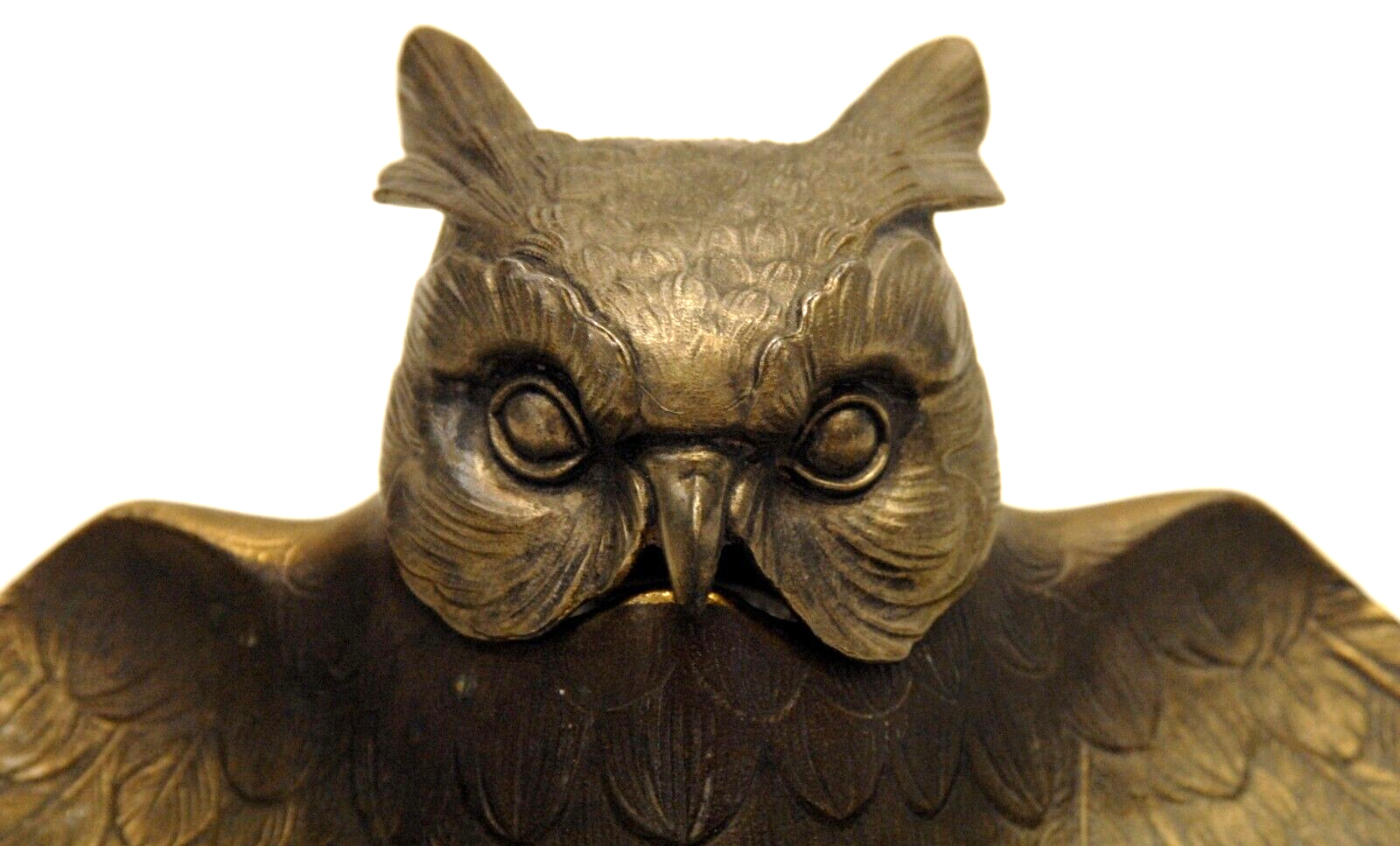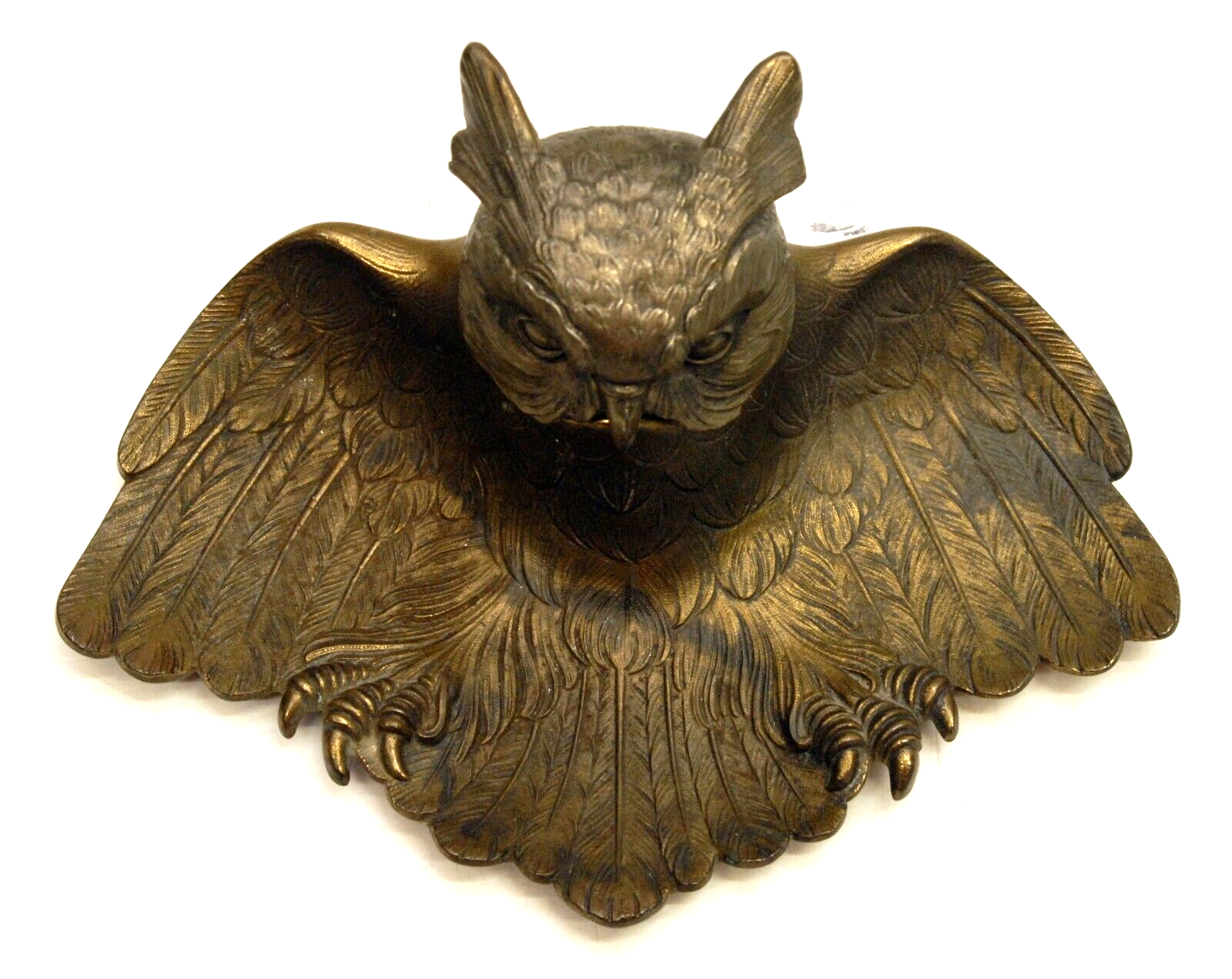 An owl with wings spread to form a pen tray. The head is hinged. Marked on the bottom with #4536. The head is nickel-plated brass. The base is cast iron with a brass finish.
