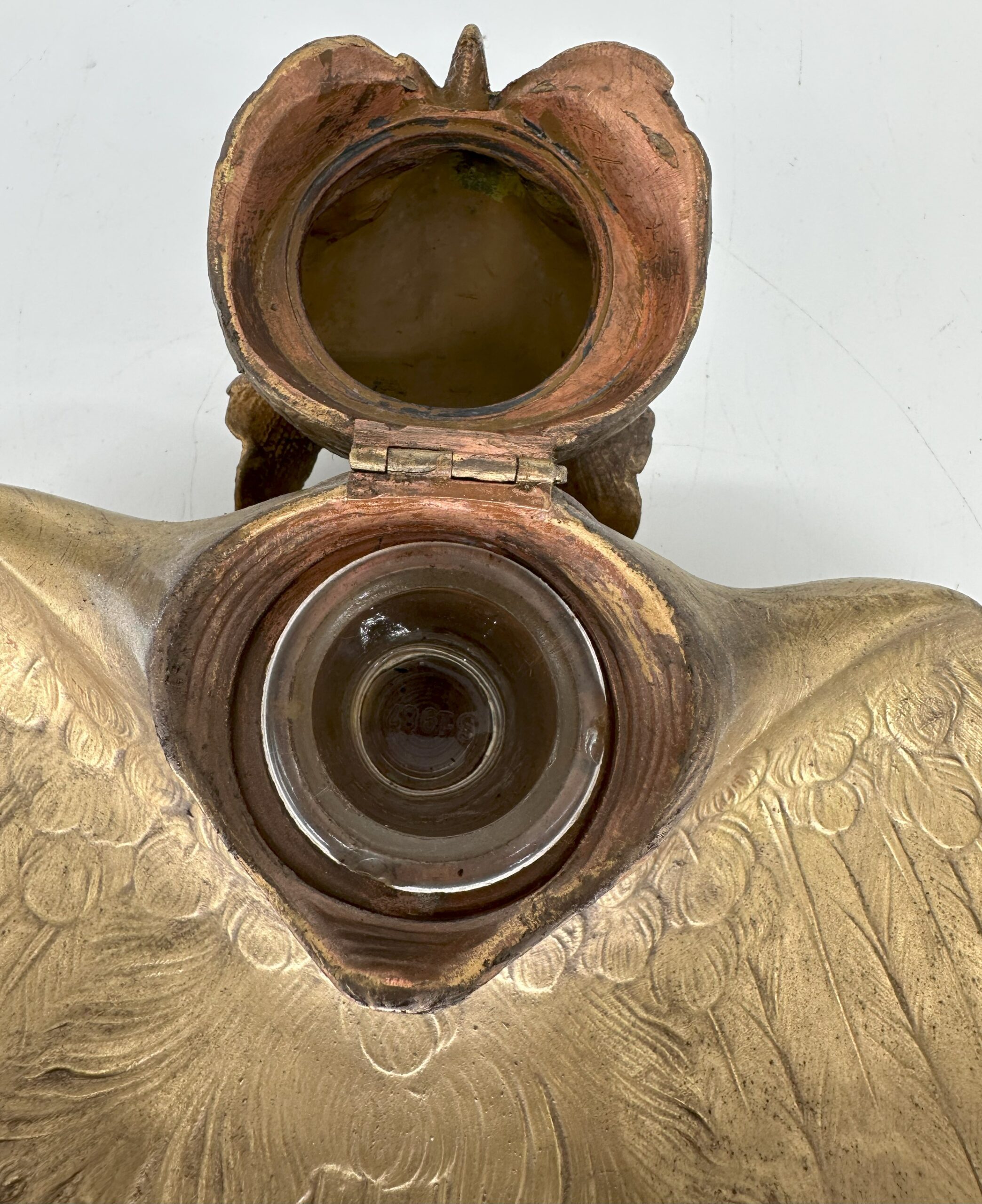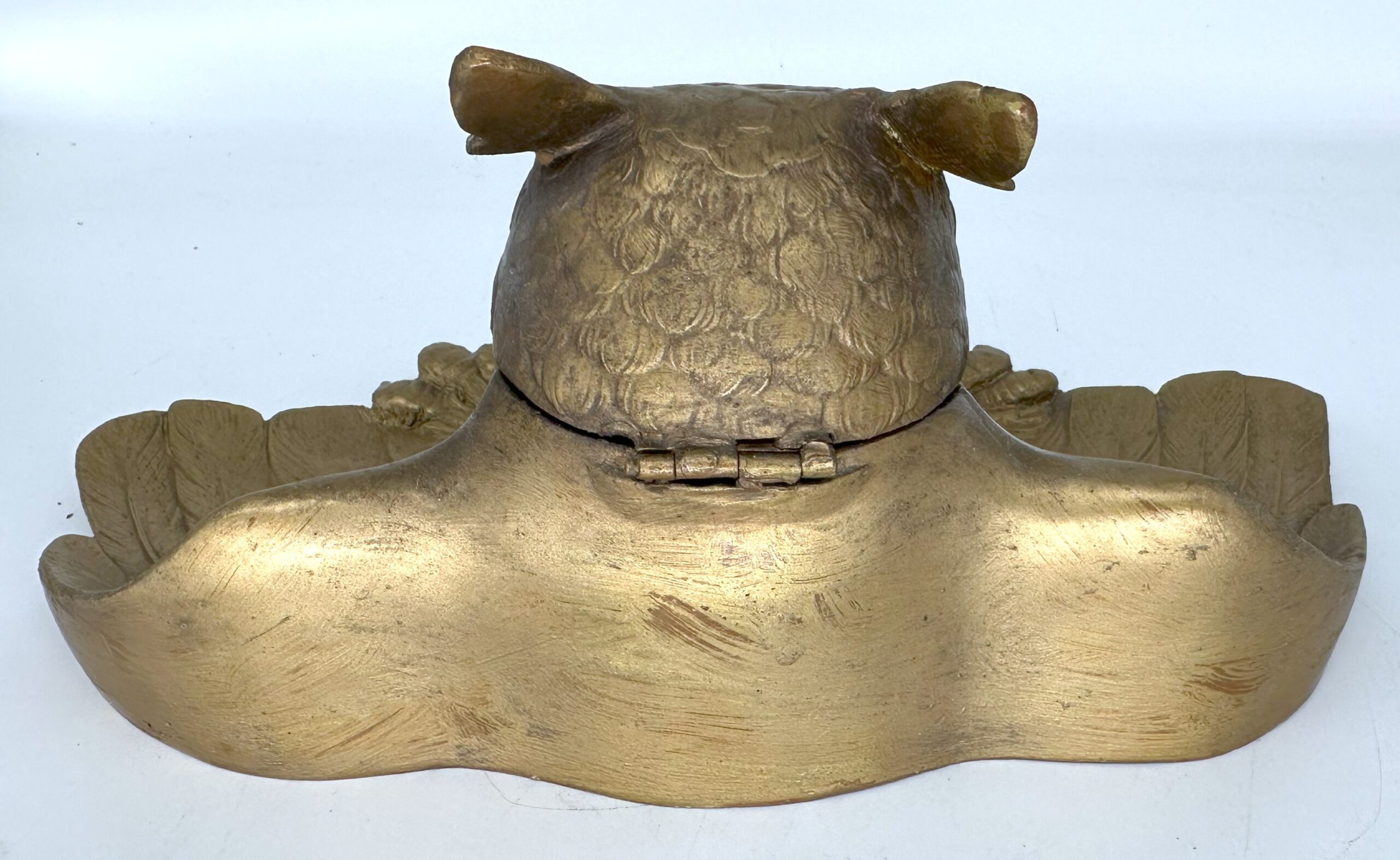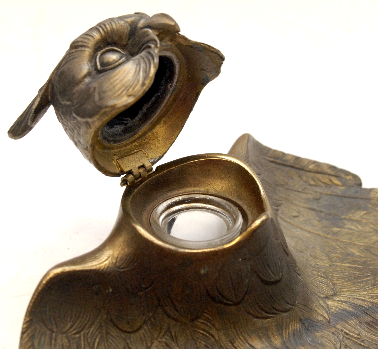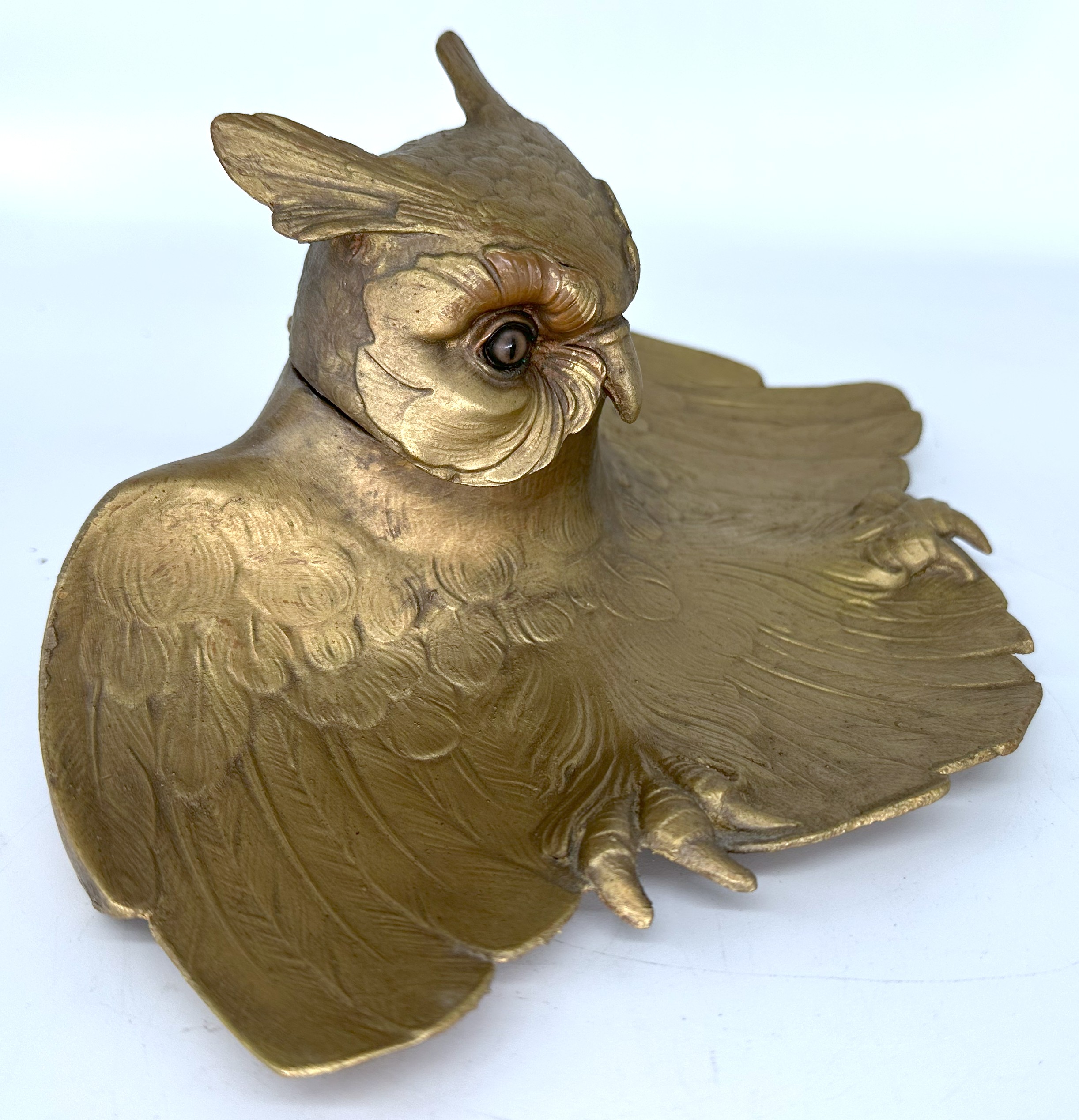 An owl with wings spread to form a pen tray. The head is hinged. Marked on the bottom with #4536. The head is nickel-plated brass. The base is cast iron with a brass finish.
