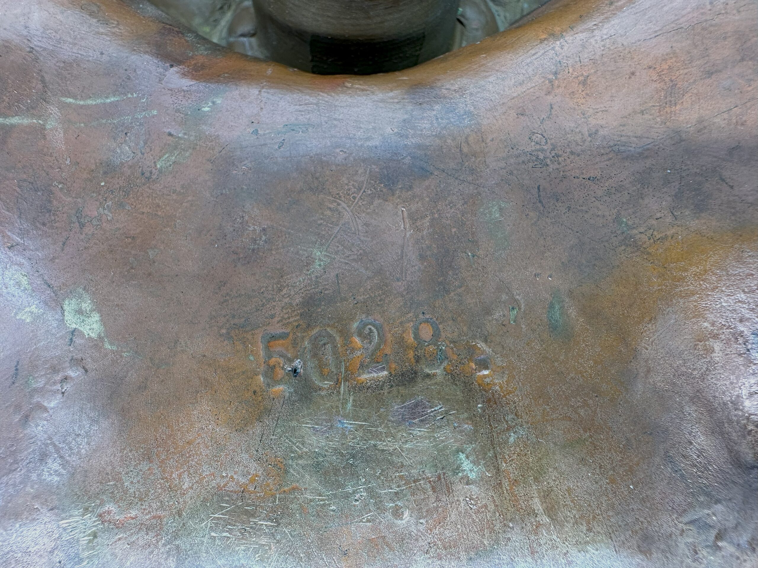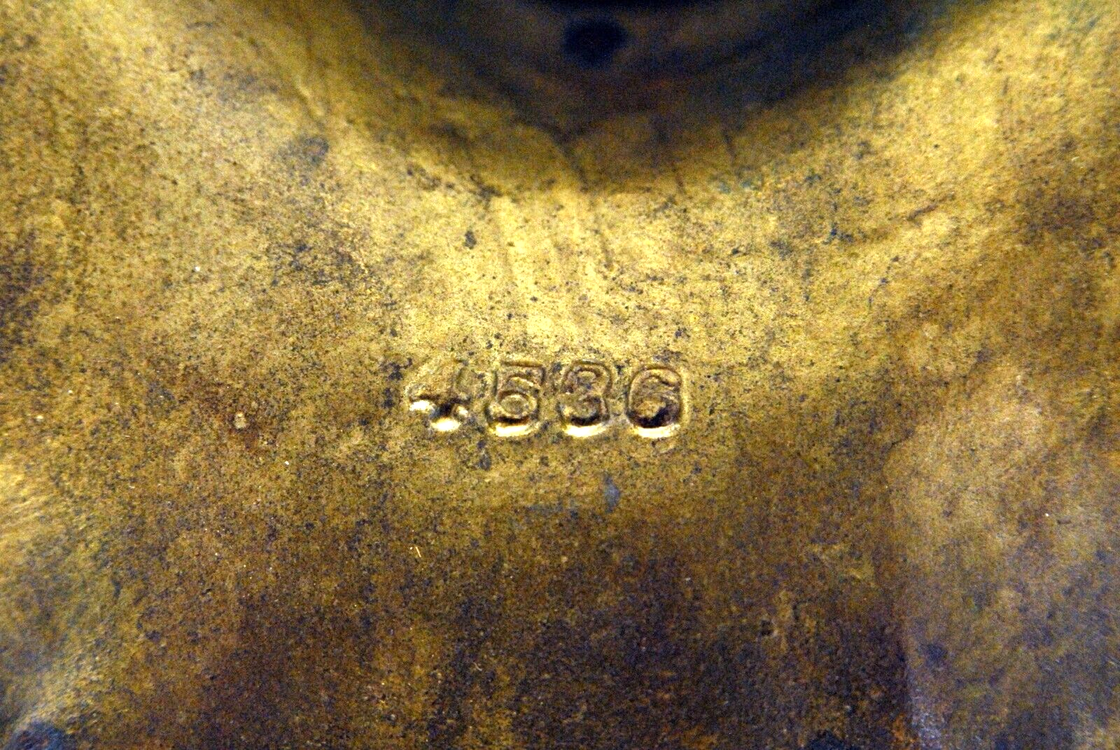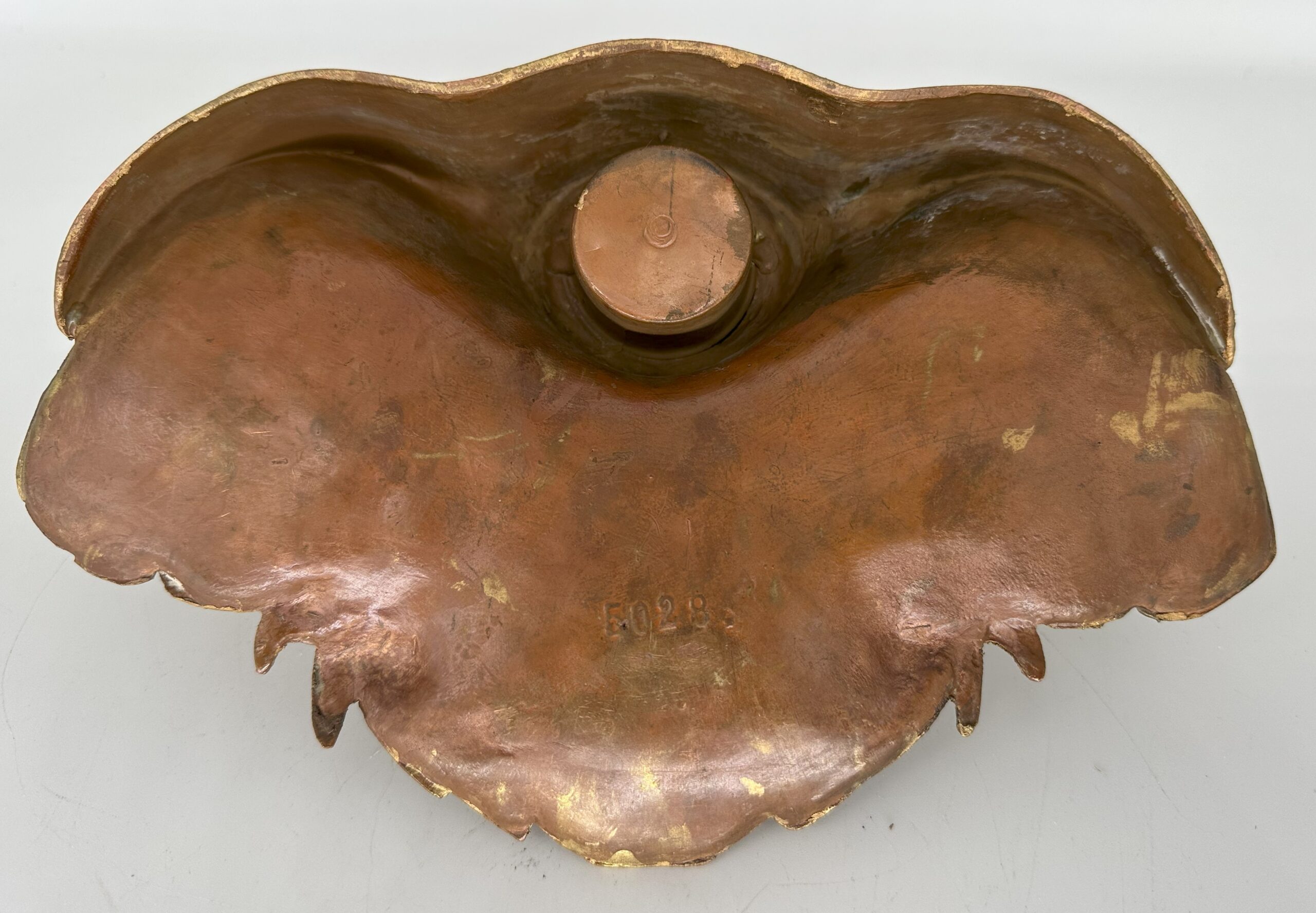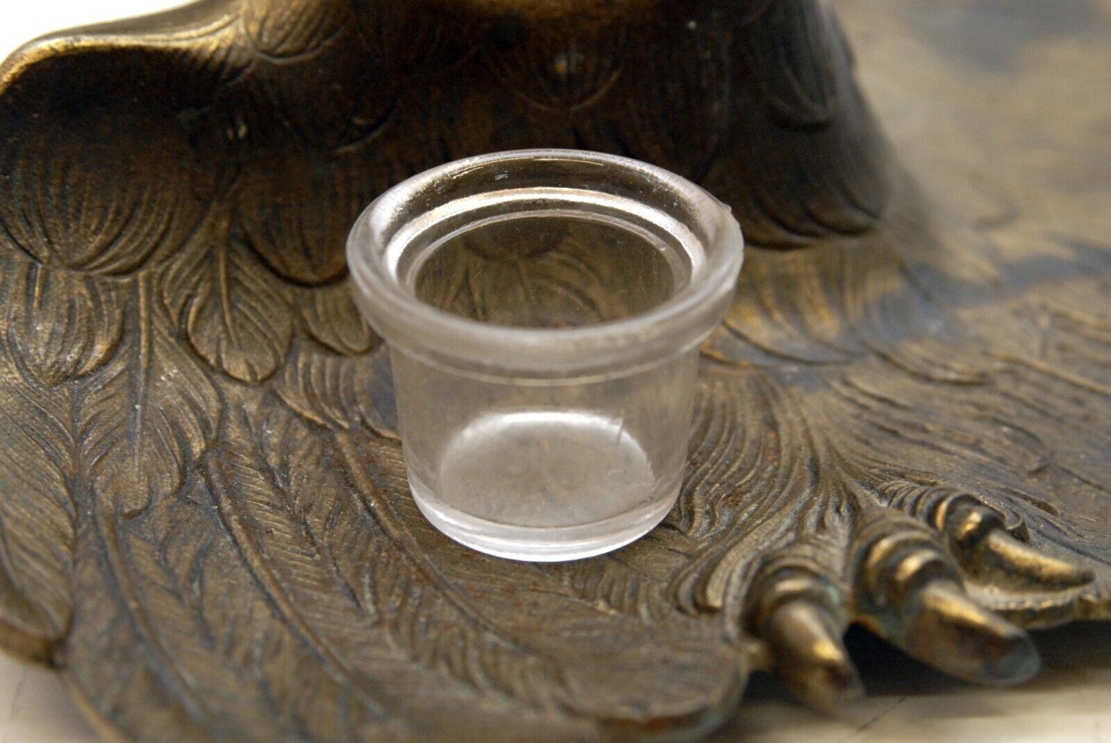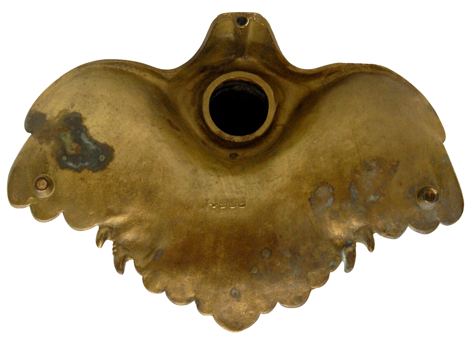 An owl with wings spread to form a pen tray. The head is hinged. Marked on the bottom with #4536. The head is nickel-plated brass. The base is cast iron with a brass finish.
