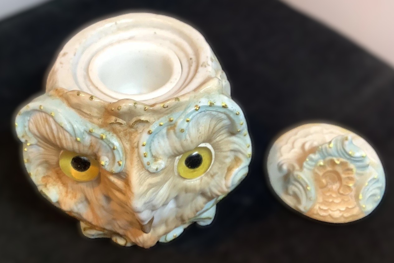 This figural owl’s head inkwell is a nice example of late 19th-century European novelty porcelain.