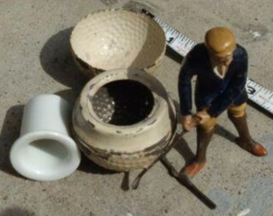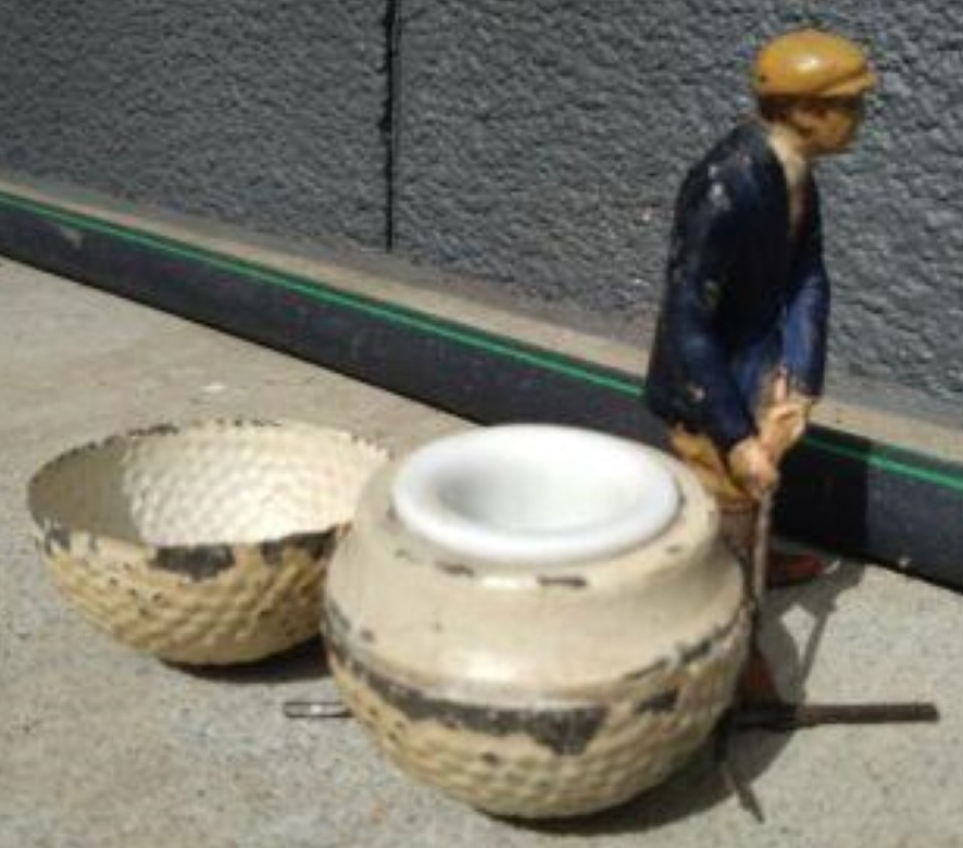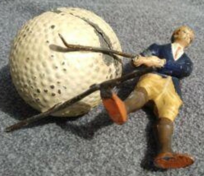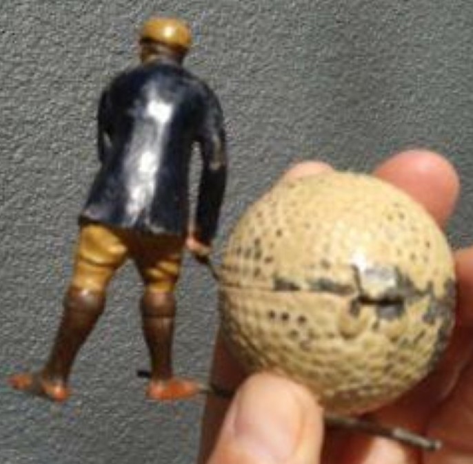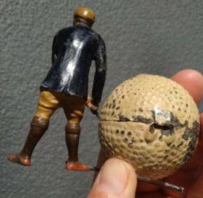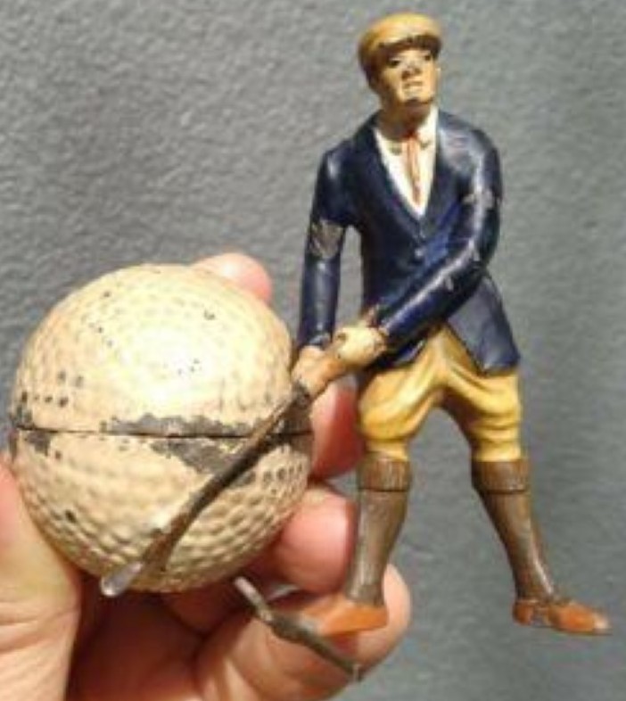 A painted lead figure of a golfer is positioned next to a large golf ball (the inkwell). The golfer, wearing traditional golf attire for the 1920’s – a flat cap, knickers, and stockings, looks like he is putting.