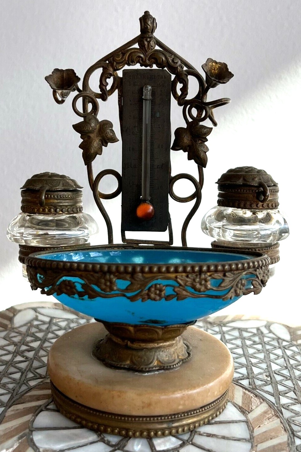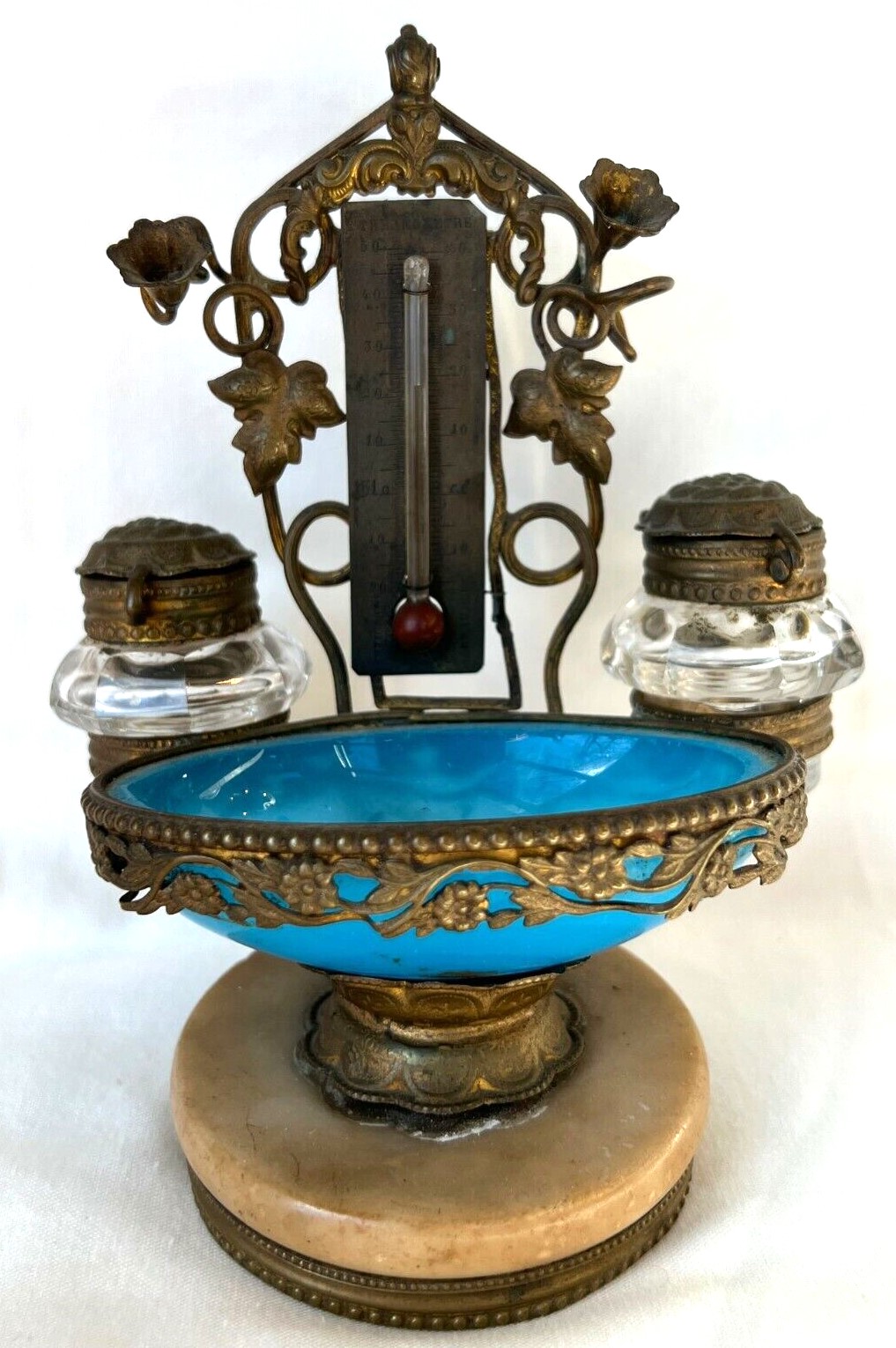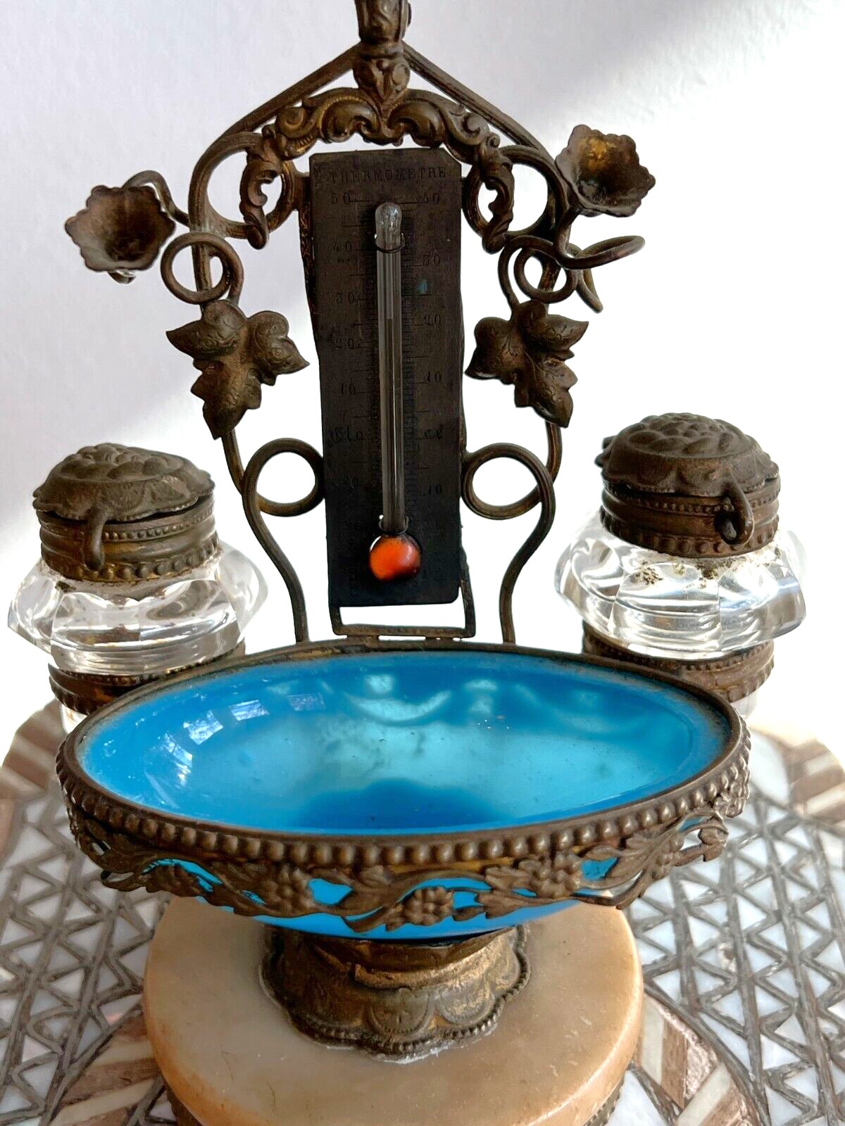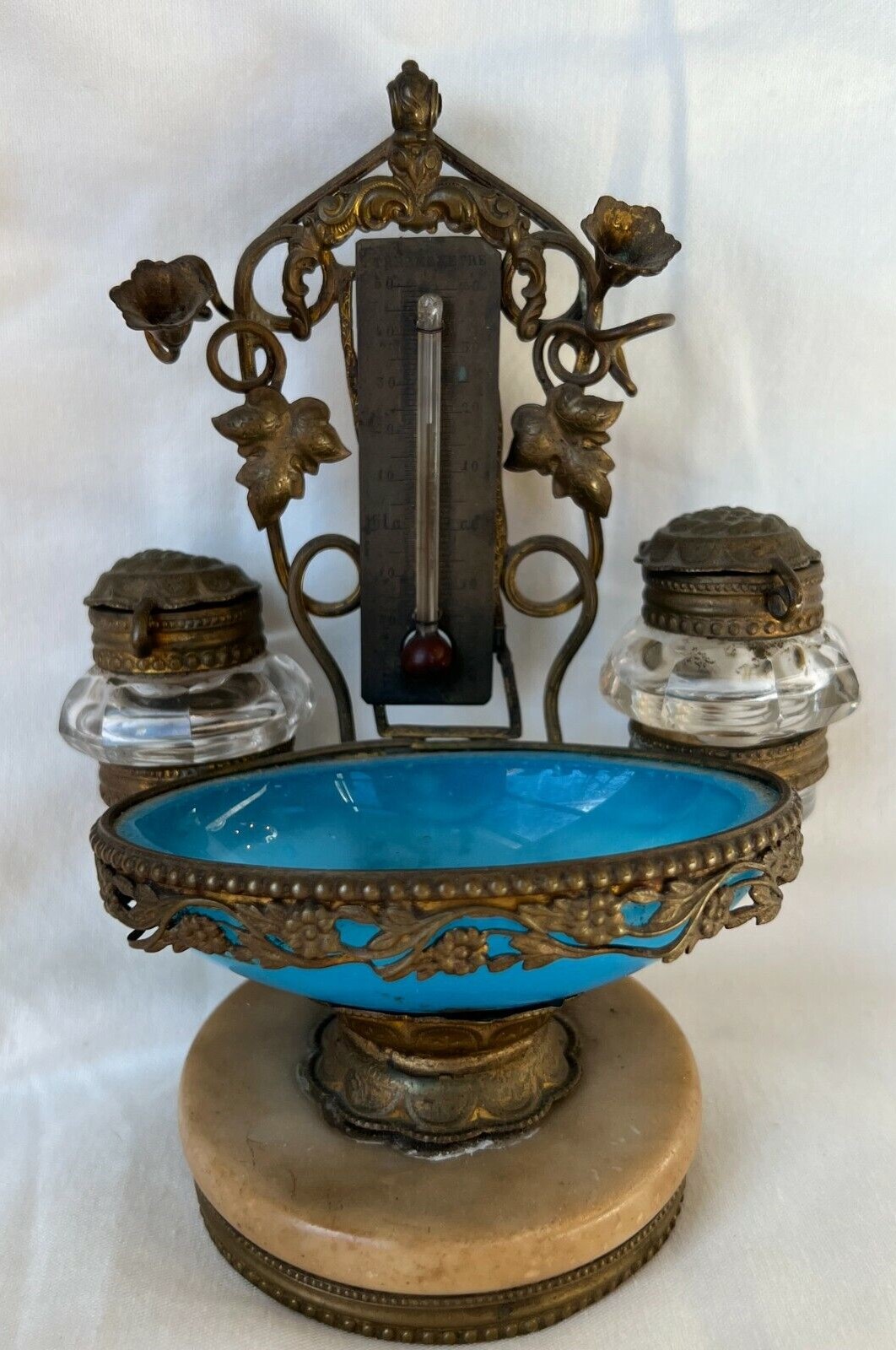 A French Palais Royal double inkstand with a blue opaline glass bowl and a thermometer. The piece stands on a round marble or alabaster base.