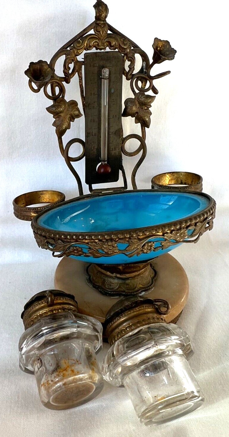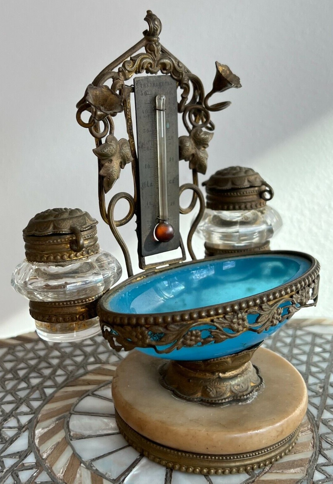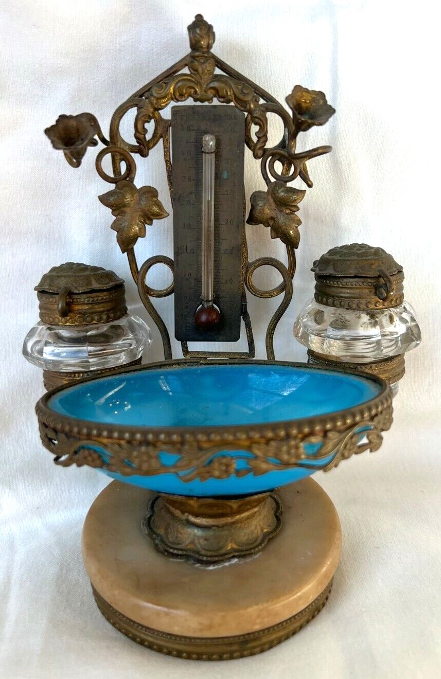 A French Palais Royal double inkstand with a blue opaline glass bowl and a thermometer. The piece stands on a round marble or alabaster base.