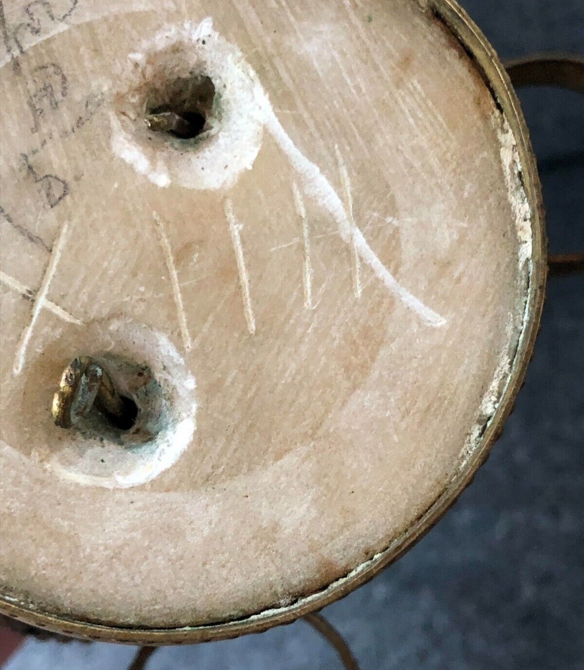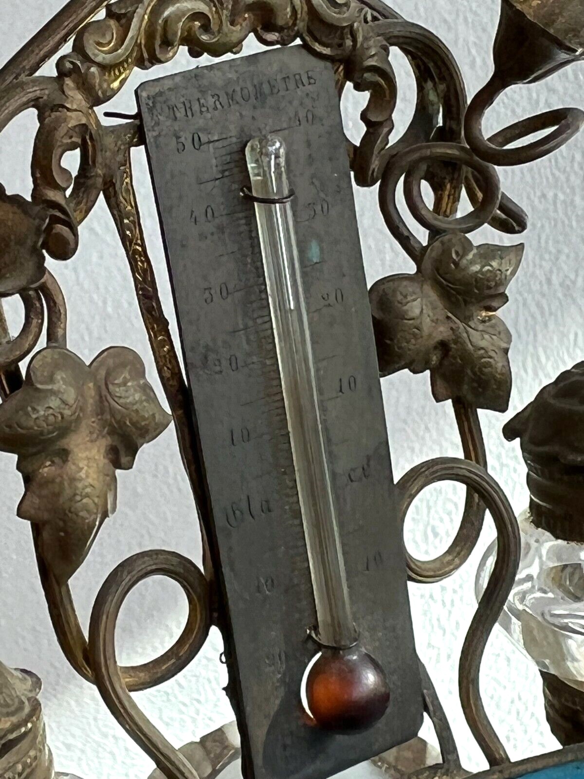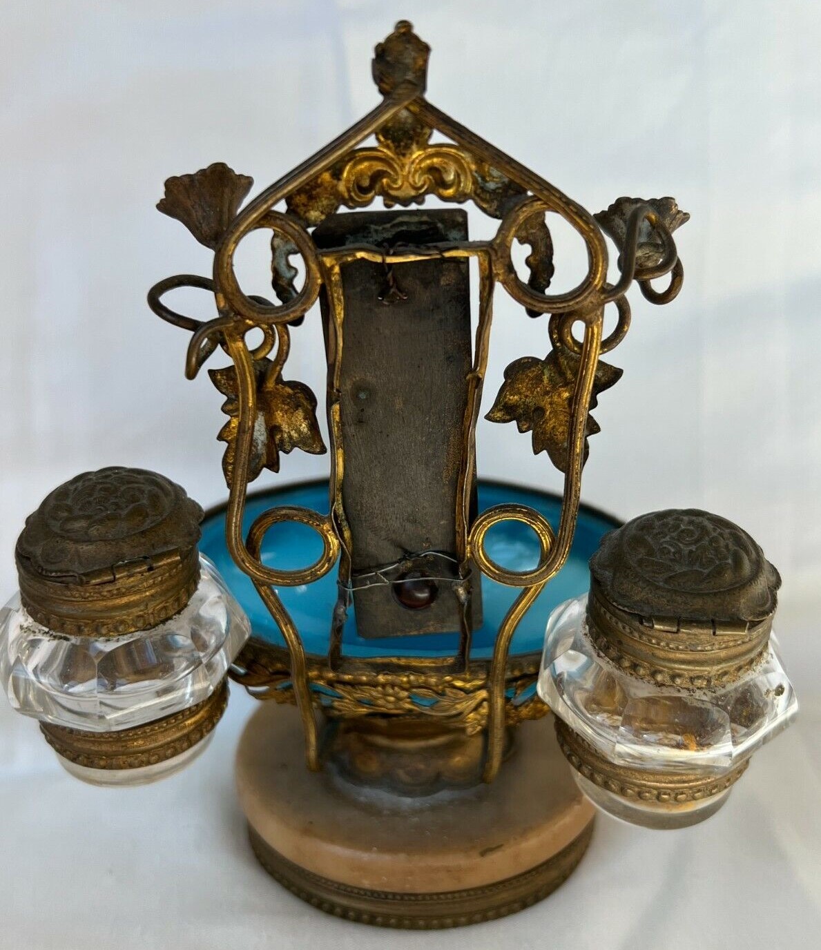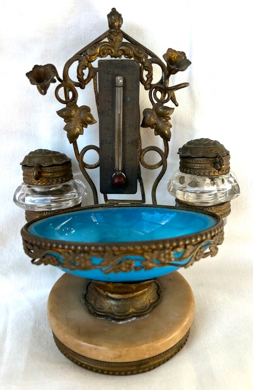 A French Palais Royal double inkstand with a blue opaline glass bowl and a thermometer. The piece stands on a round marble or alabaster base.