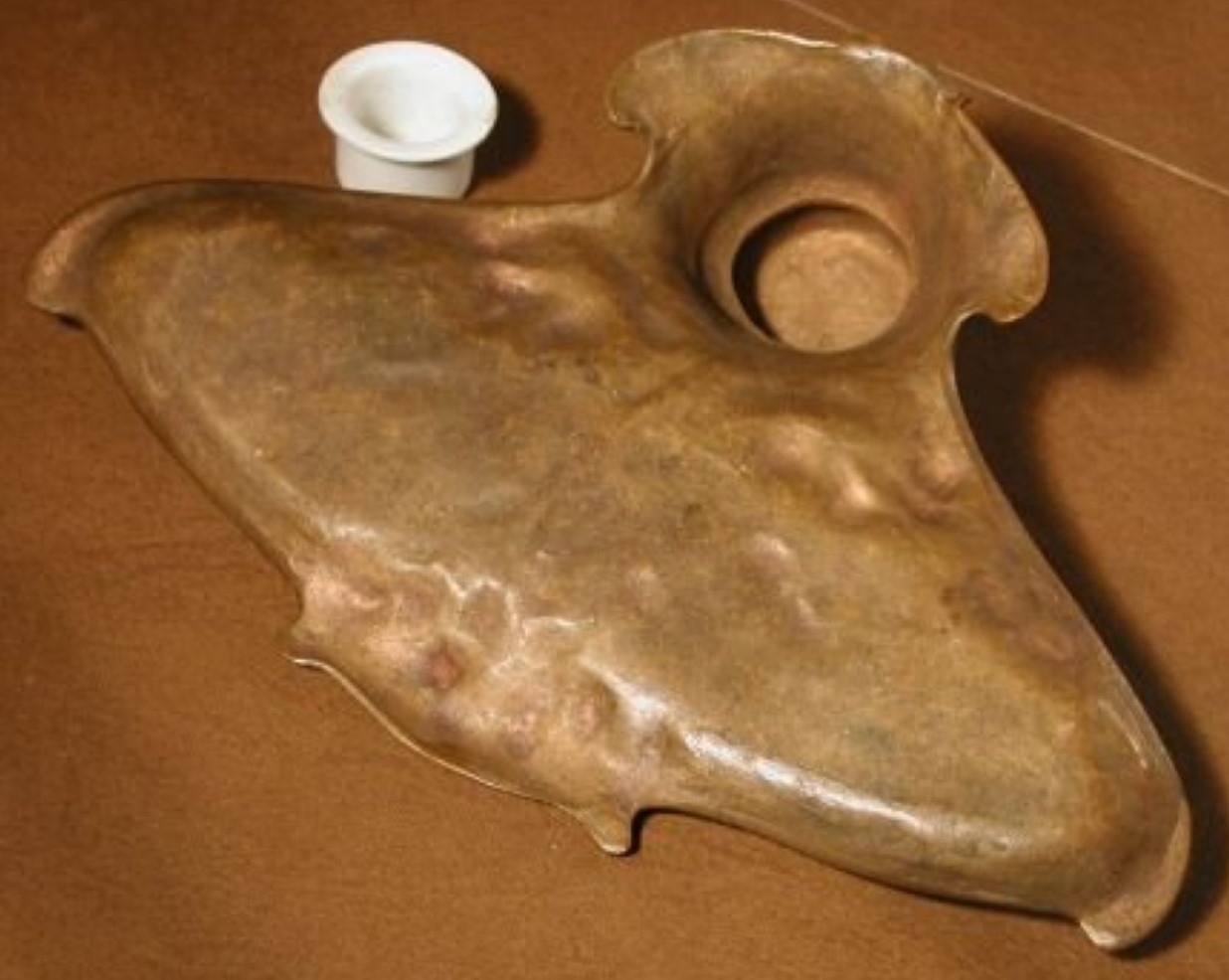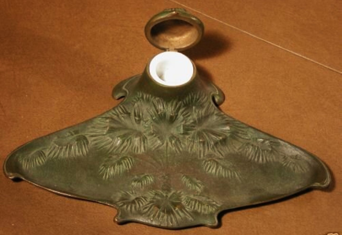 This bronze inkstand features a palm tree and fronds in high relief – remembrances of warm sun and gentle breezes. The piece is numbered 643 on the bottom.