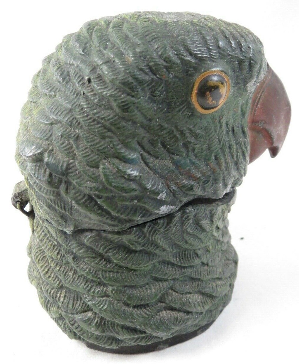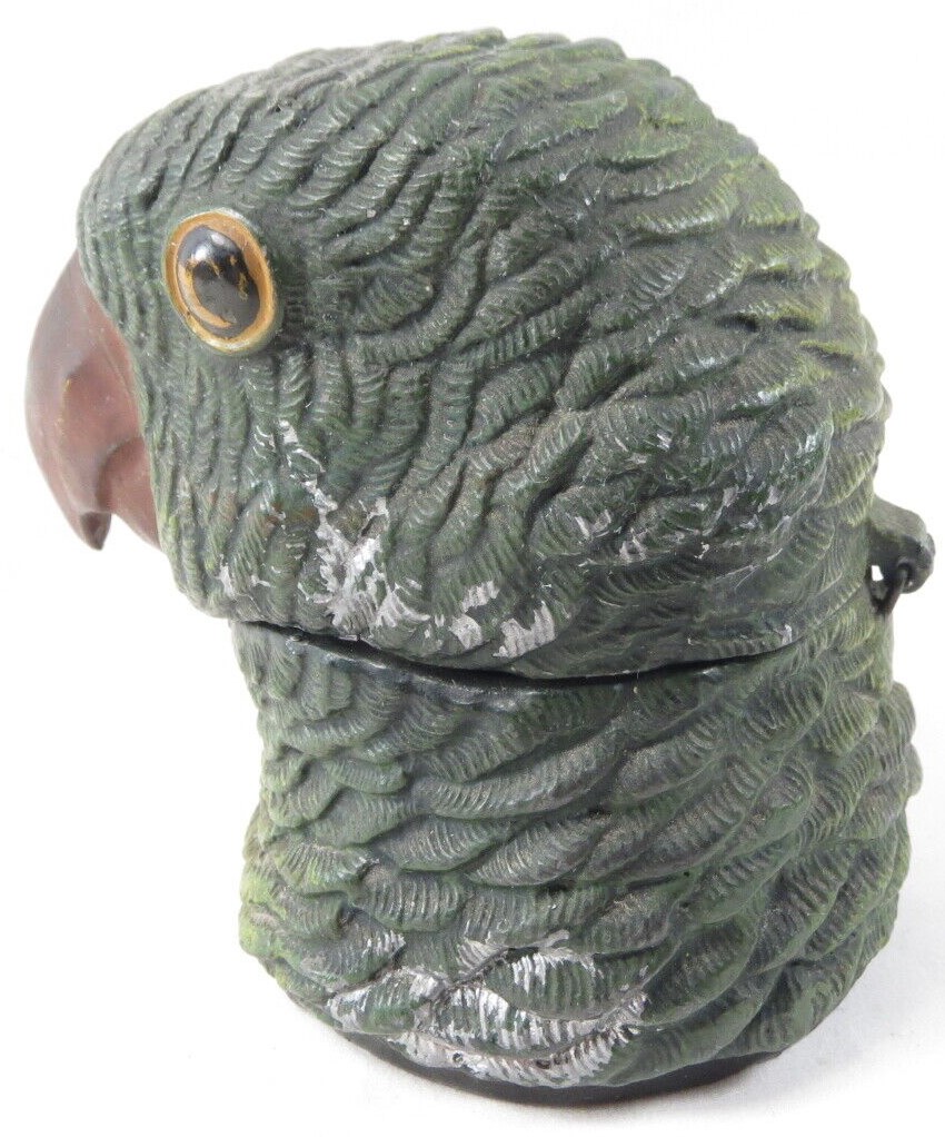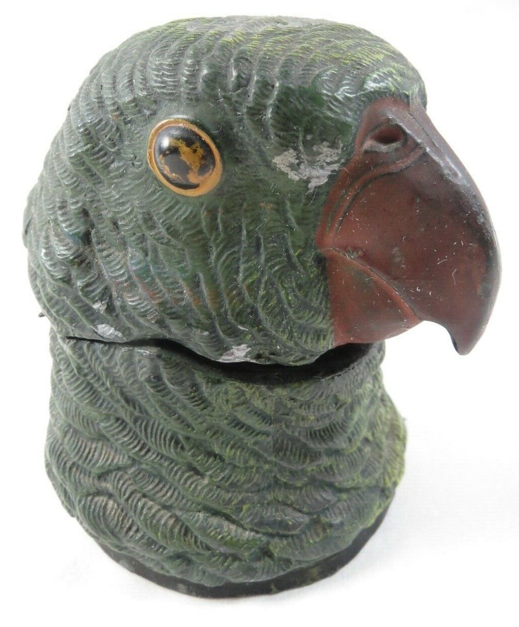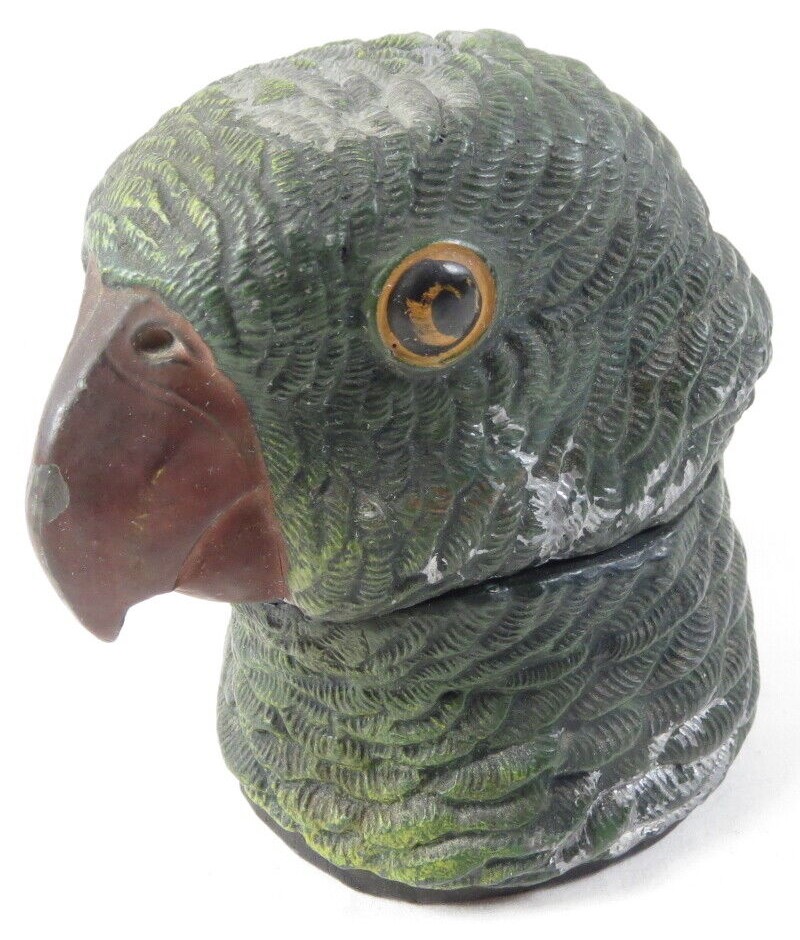 Painted white metal, the parrot’s head is hinged in the back and opens at the neck to access the inkwell.