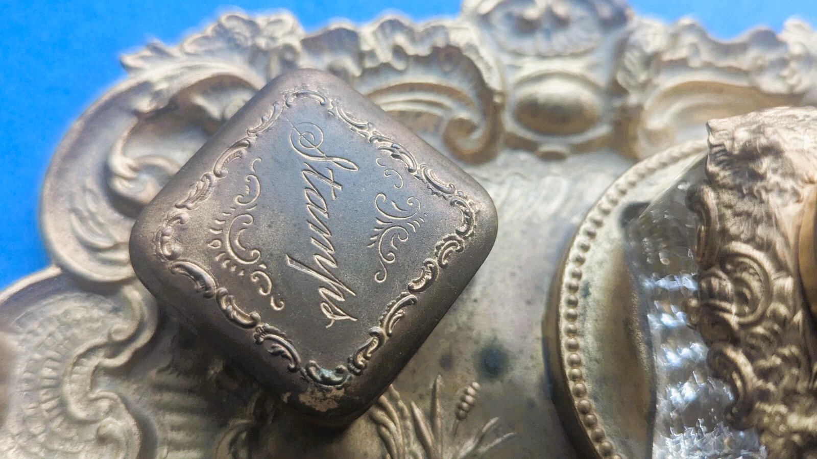 - Function: The separate container marked “Stamps” served as a small box for keeping postage stamps flat and clean. This inclusion marks the piece as a contemporary office item, reflecting the growing use of the postal service.