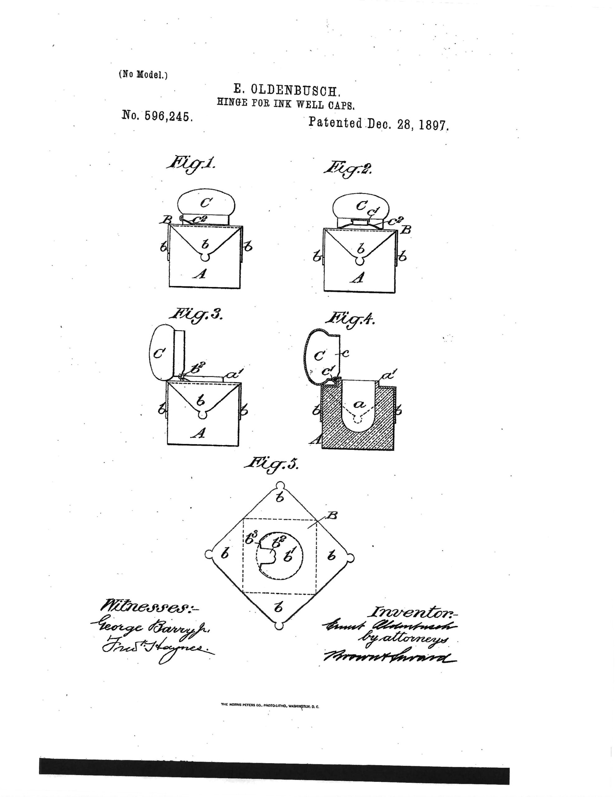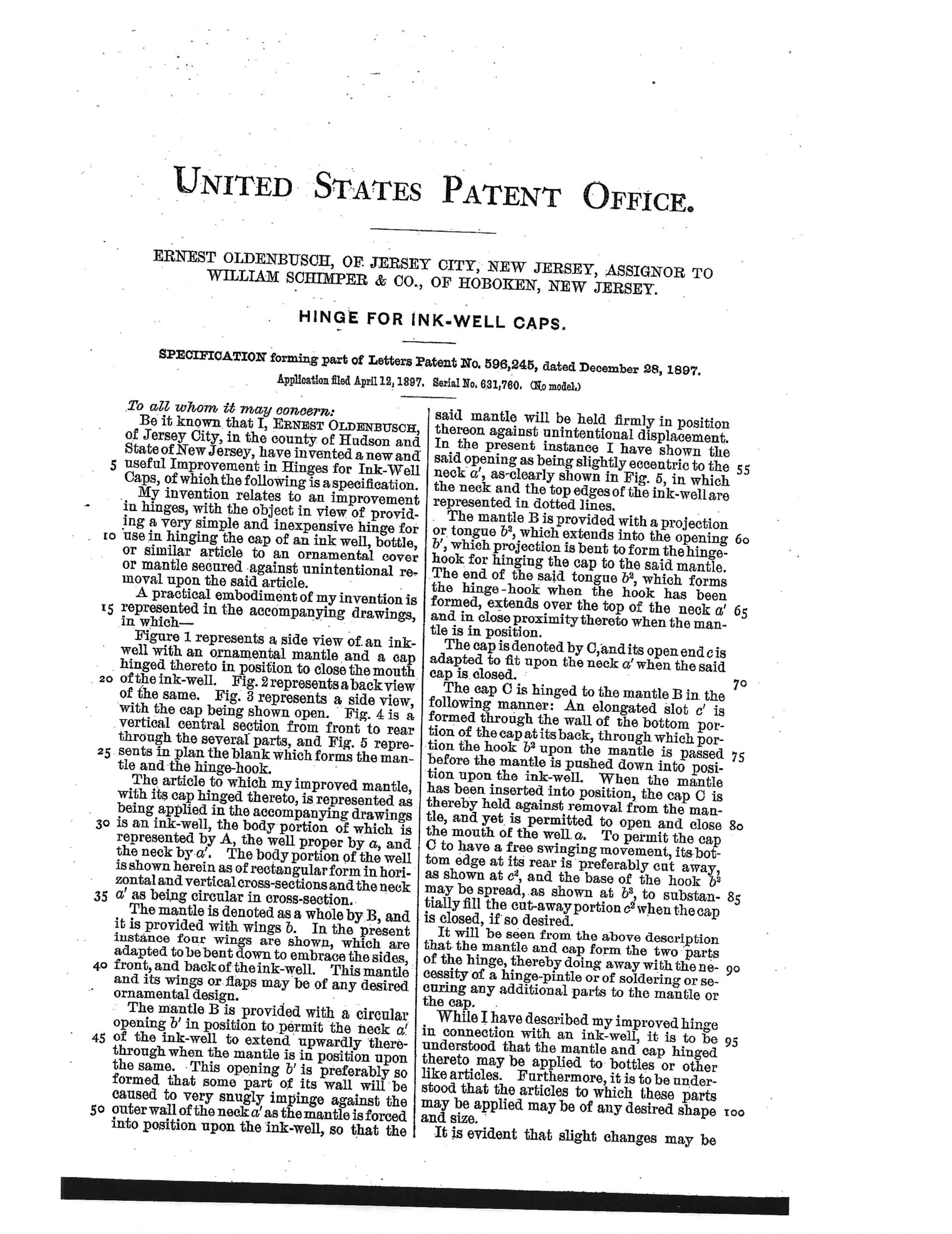 The patent was issued for the mechanical improvement to the inkwell lid -specifically the hinge, collar, and method of attaching it to the base – which was a common practice for manufacturers seeking market advantages at the time.