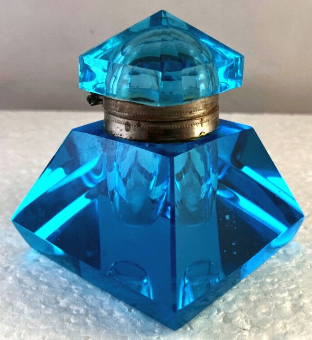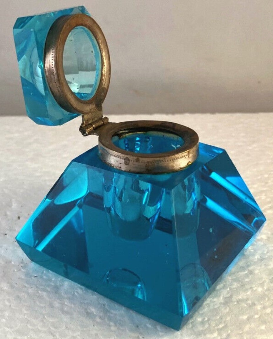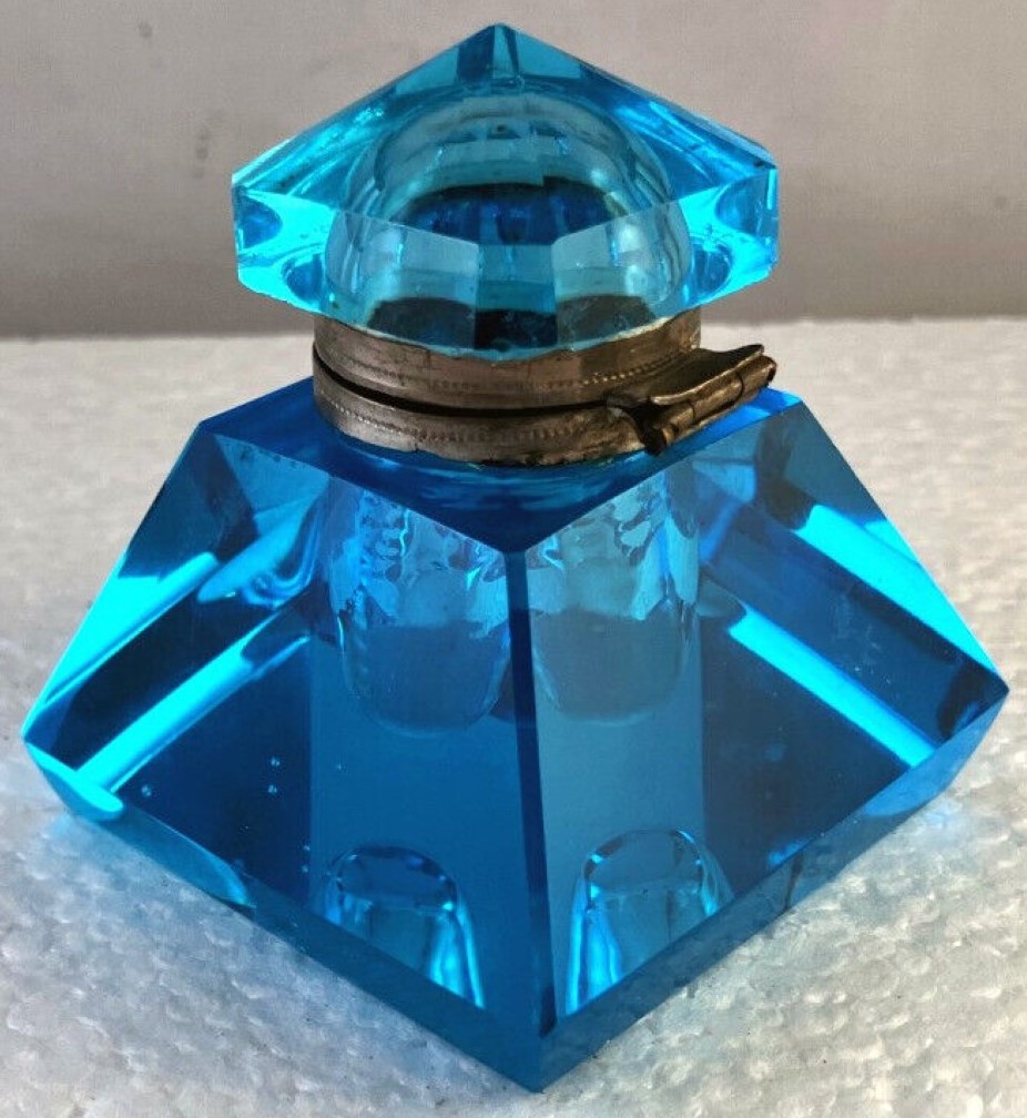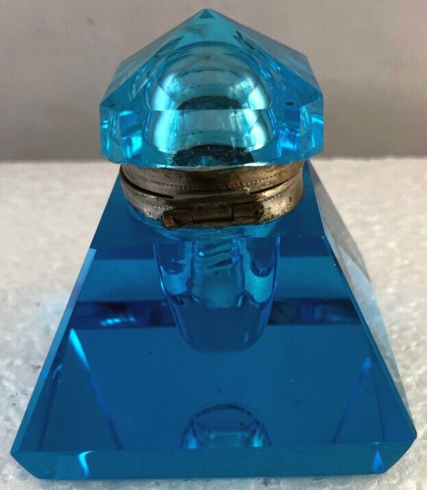 Brilliant blue pyramid shaped cut crystal inkwell. The faceted lid has a brass collar and hinge.
