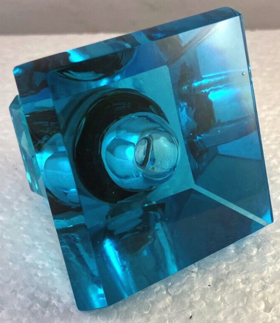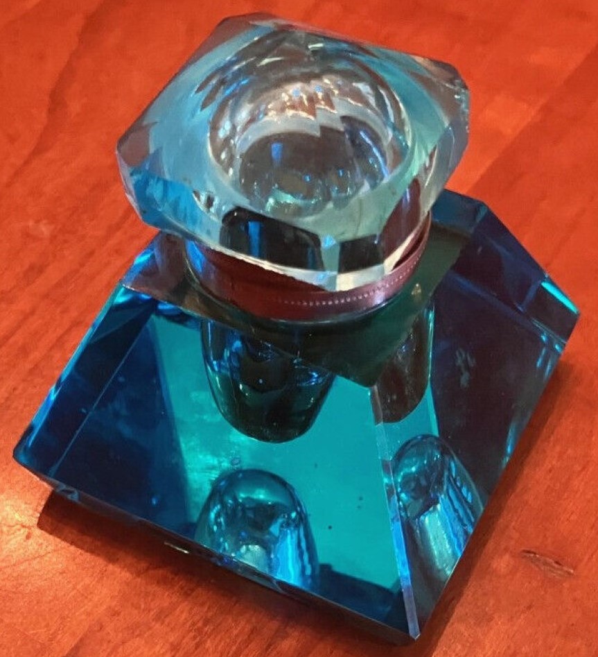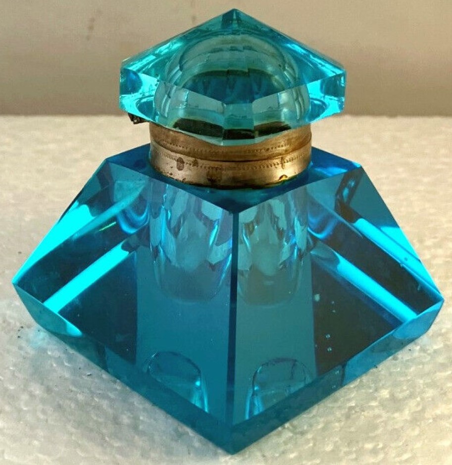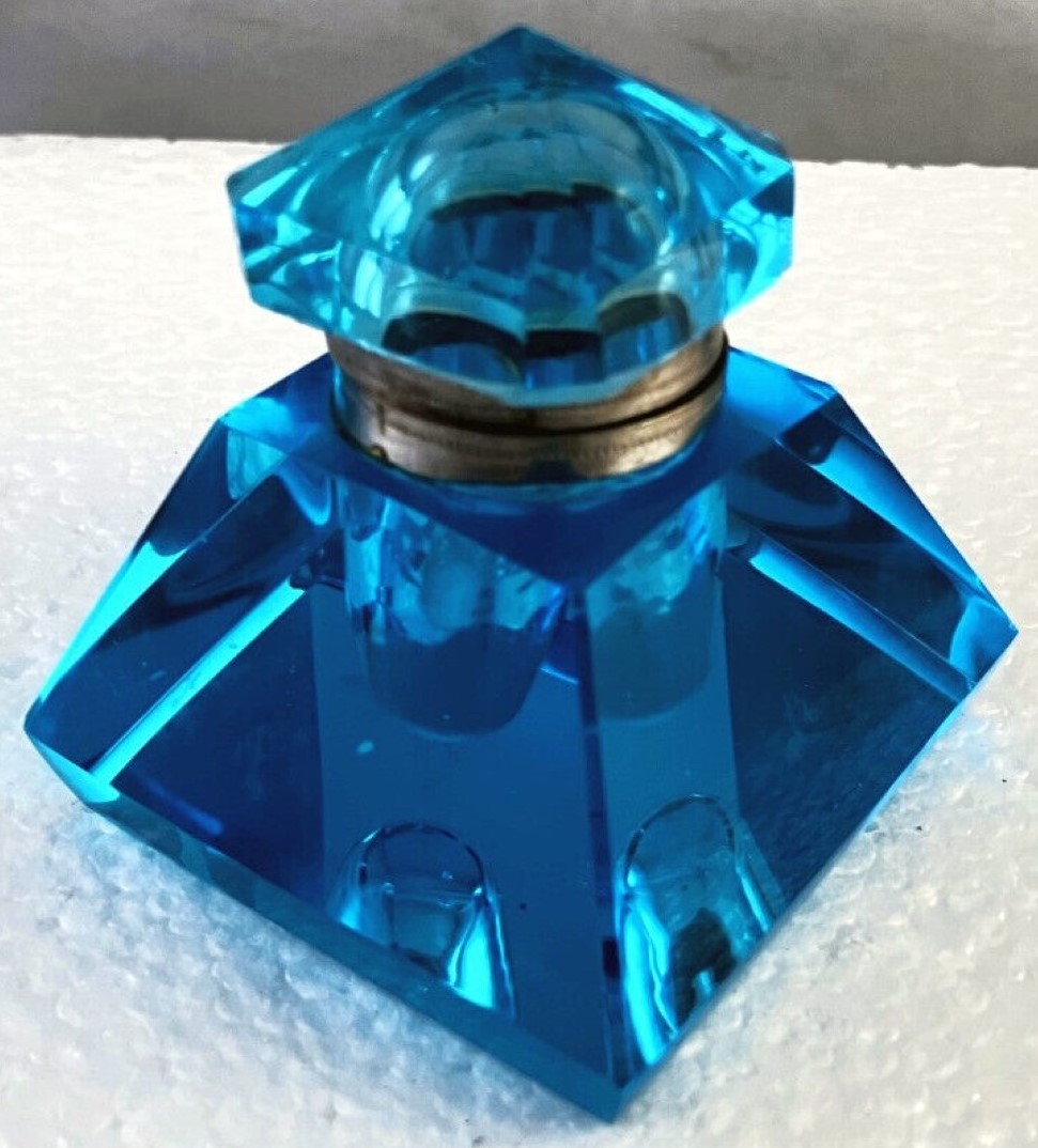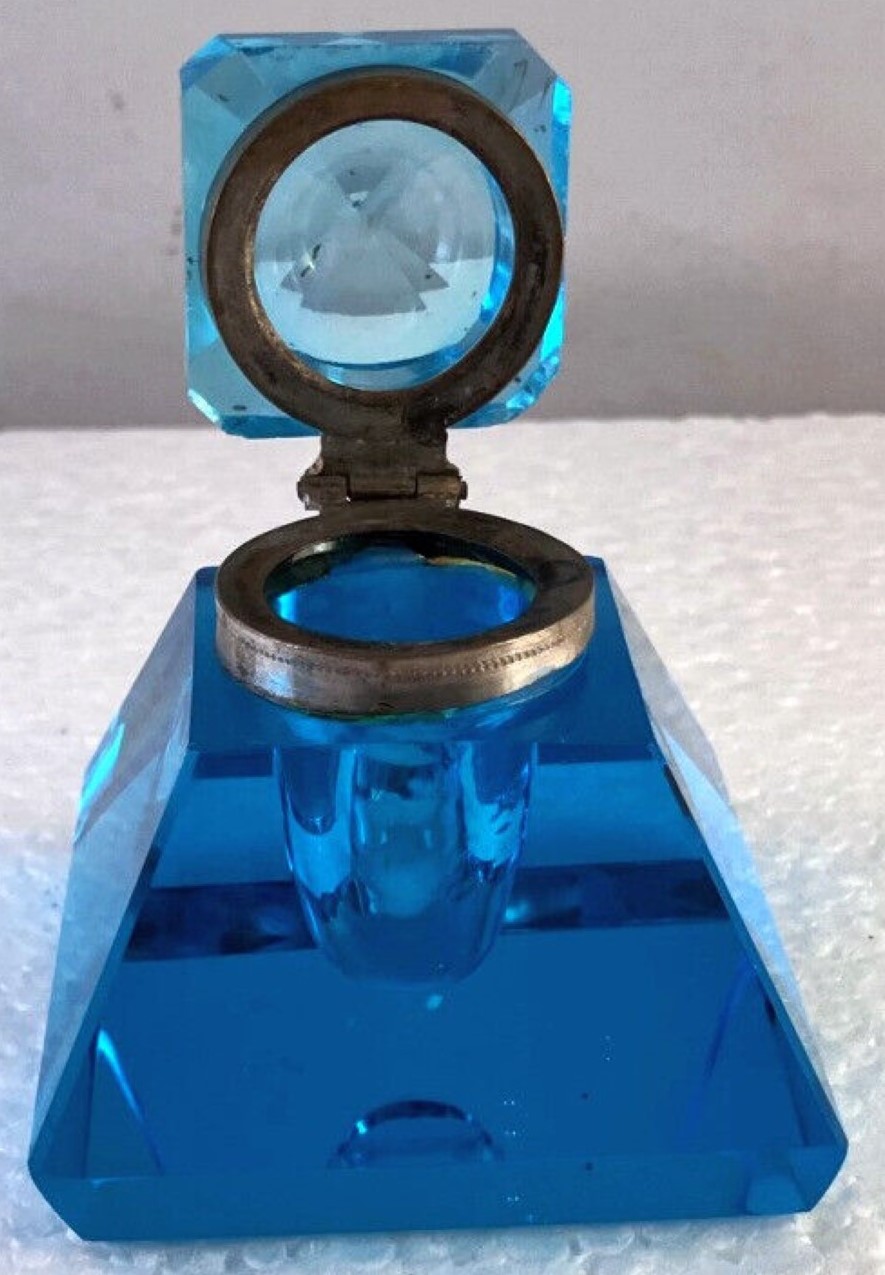 Brilliant blue pyramid shaped cut crystal inkwell. The faceted lid has a brass collar and hinge.
