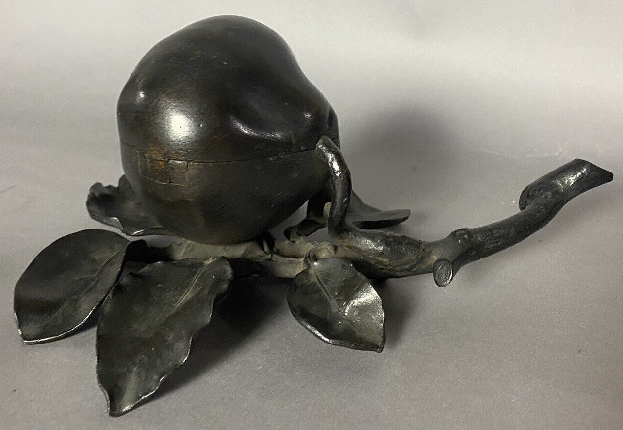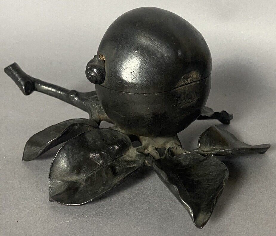 Cast metal inkwell (insert missing) in the form of a pear resting on a branch. A whimsical snail is perched on its side.