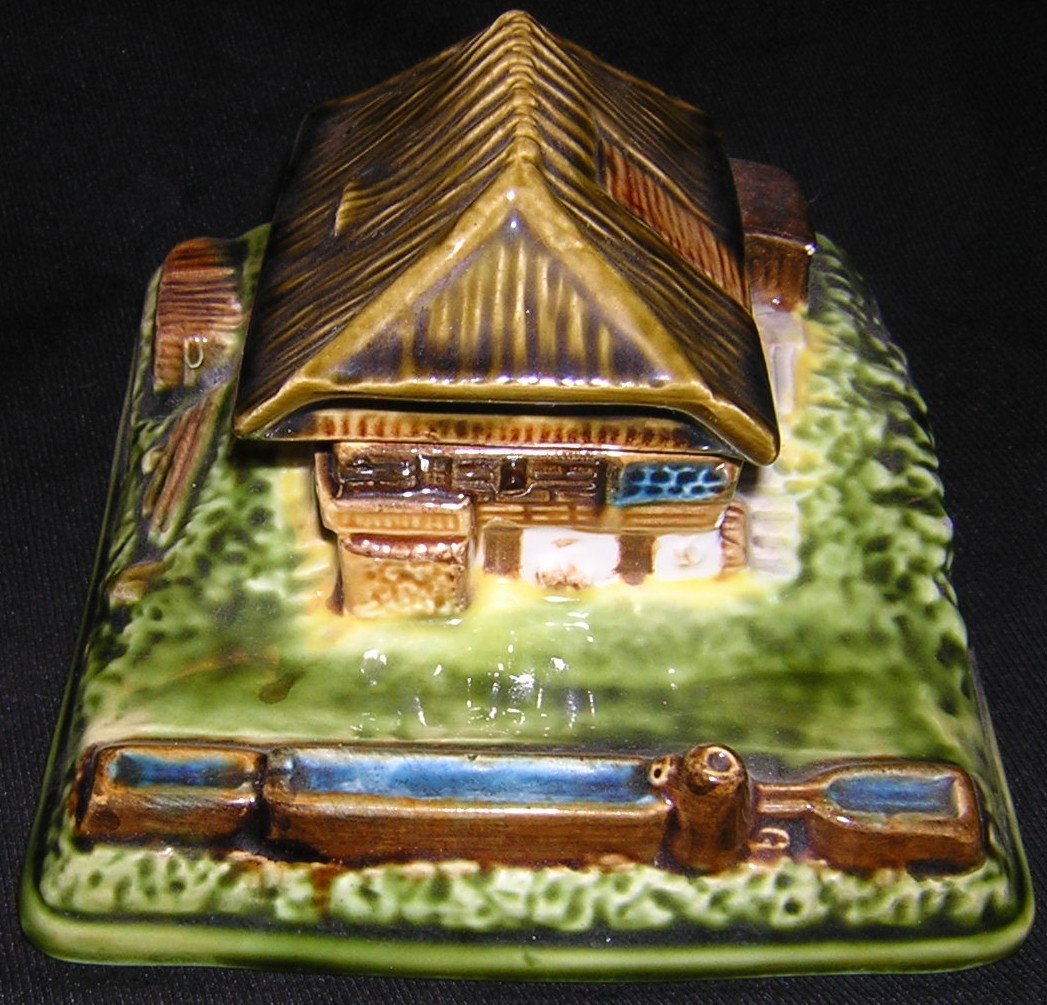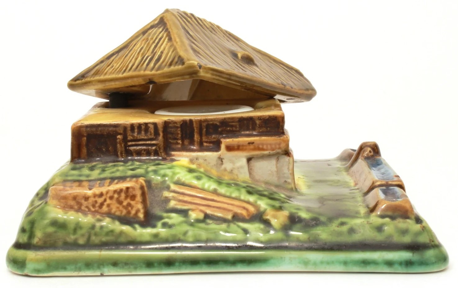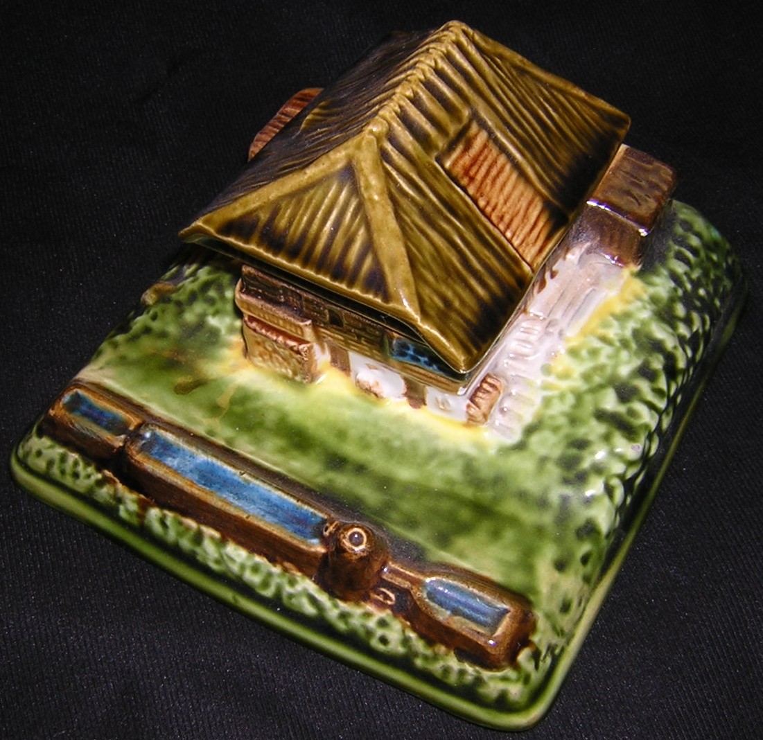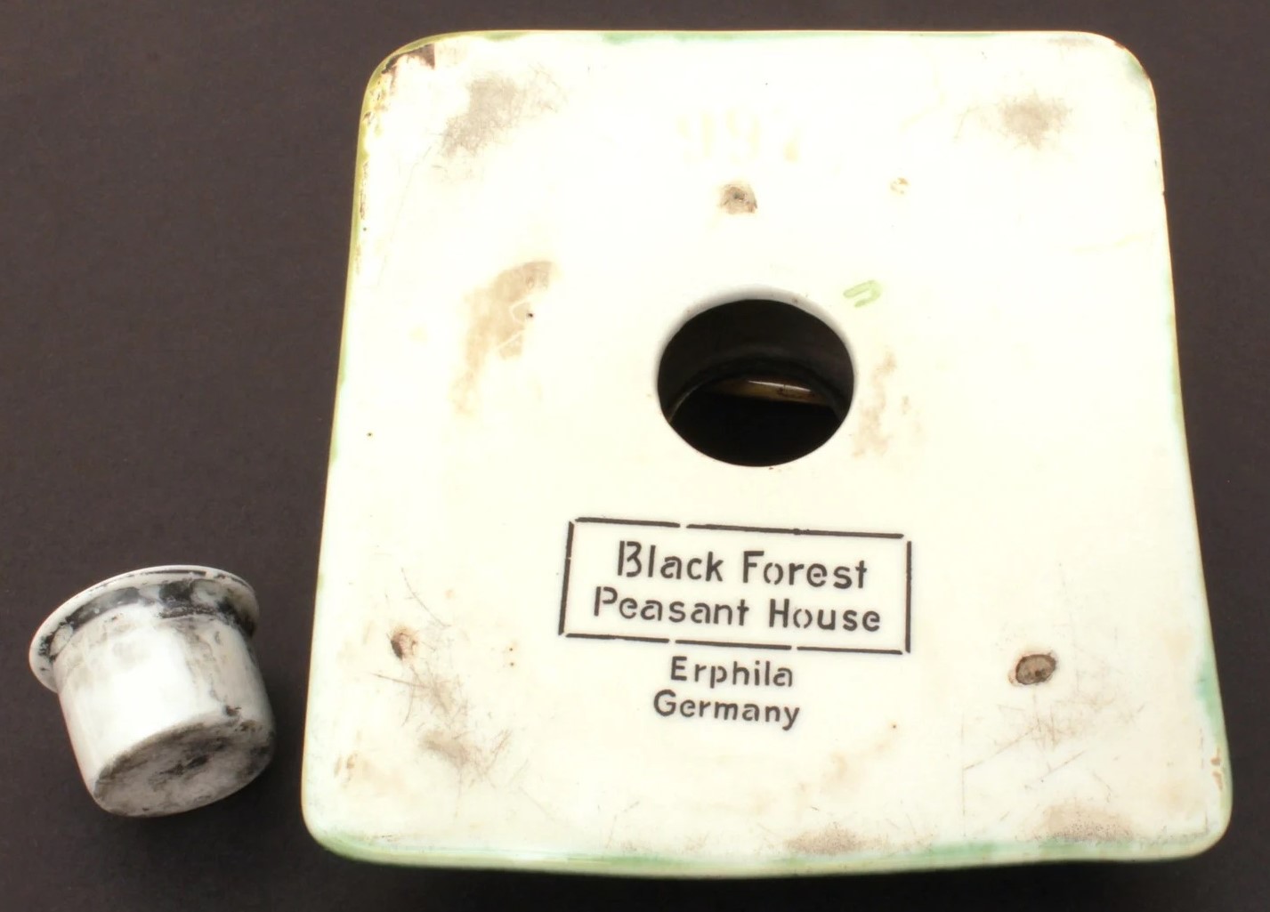 Majolica (earthenware) inkstand with pen channel in the shape of a peasant’s thatched cottage. The roof fits into the bottom with a metal pipe stem, and swivels open to reveal the inkwell. Marked “Black Forest peasant house, Erphila, Germany”. While most Erphila is Czech, they are harder to find in German production. The Erphila mark was used on porcelain imported by Eberling & Reuss of Philadelphia, PA. The import firm operated starting in 1886 and continued into the 1900’s.