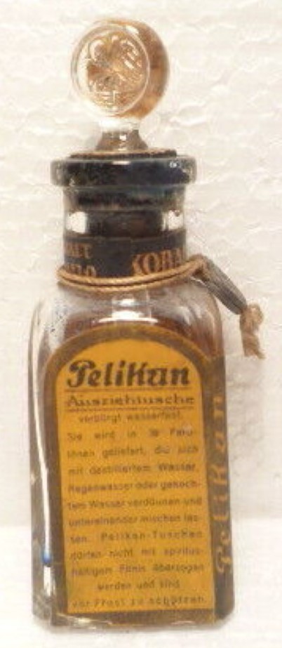 Pictured are Pelikan ink bottles (various colors) by Günther Wagner with original paper labels and glass stoppers.