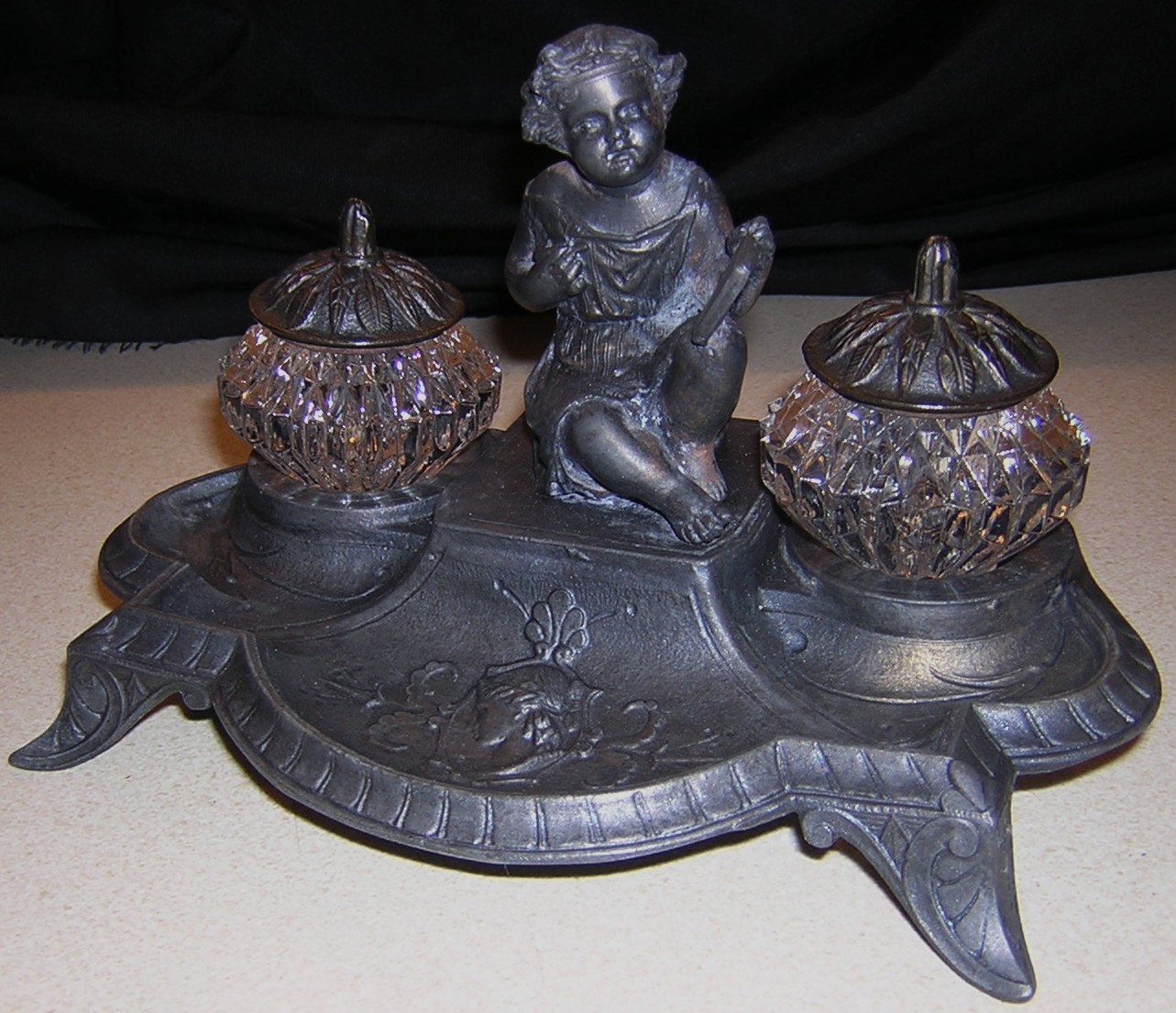 This double inkstand features a young girl, sitting, holding a pen and tablet or book.