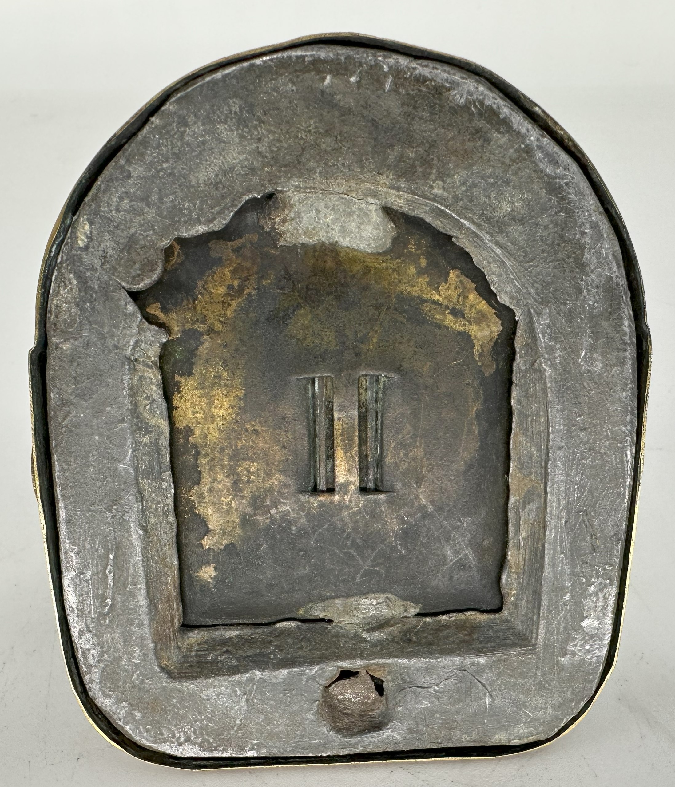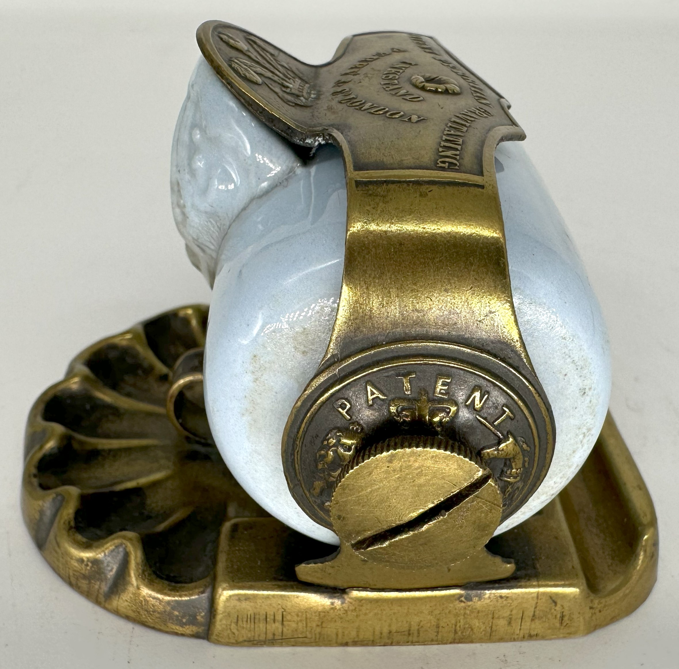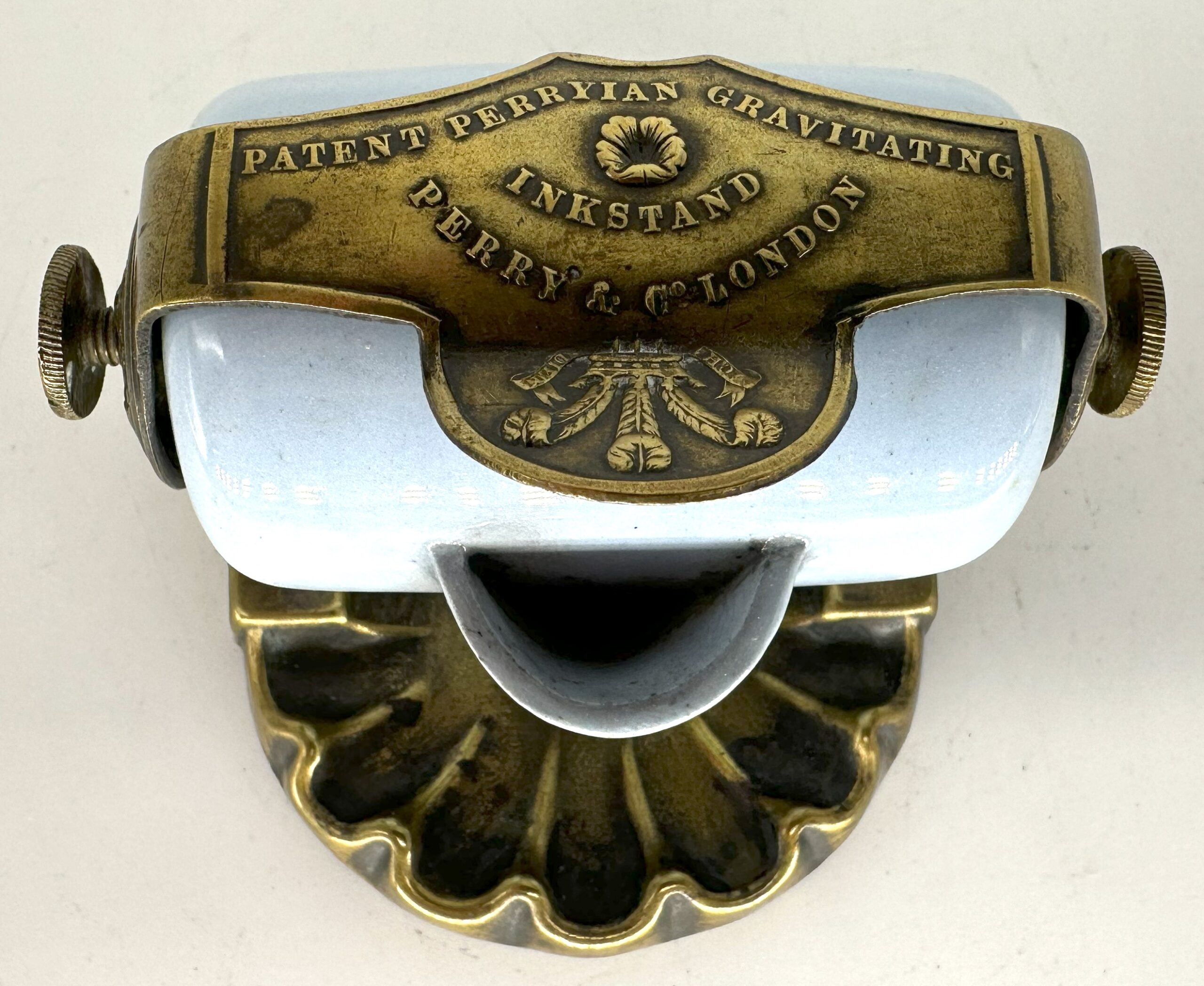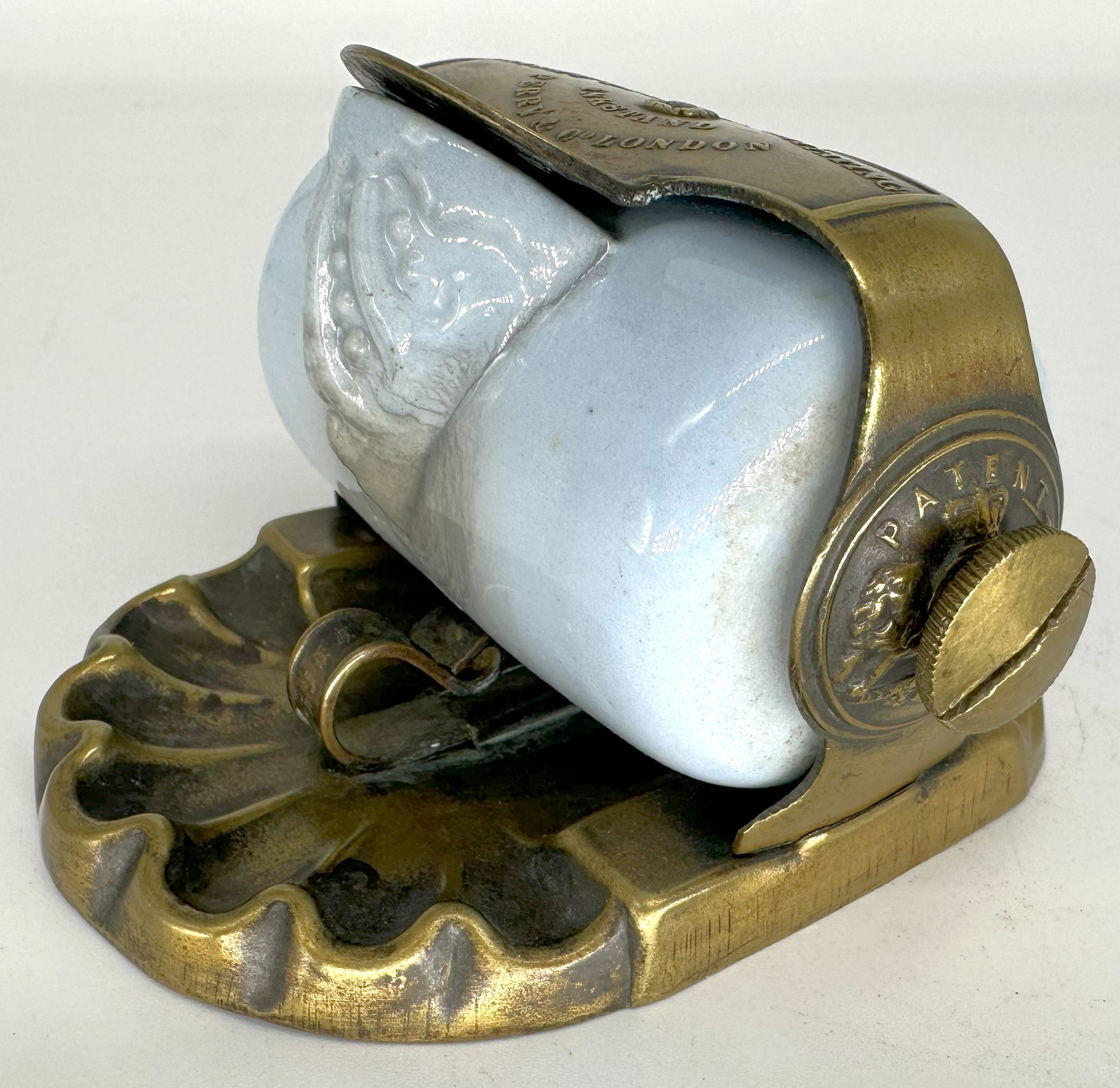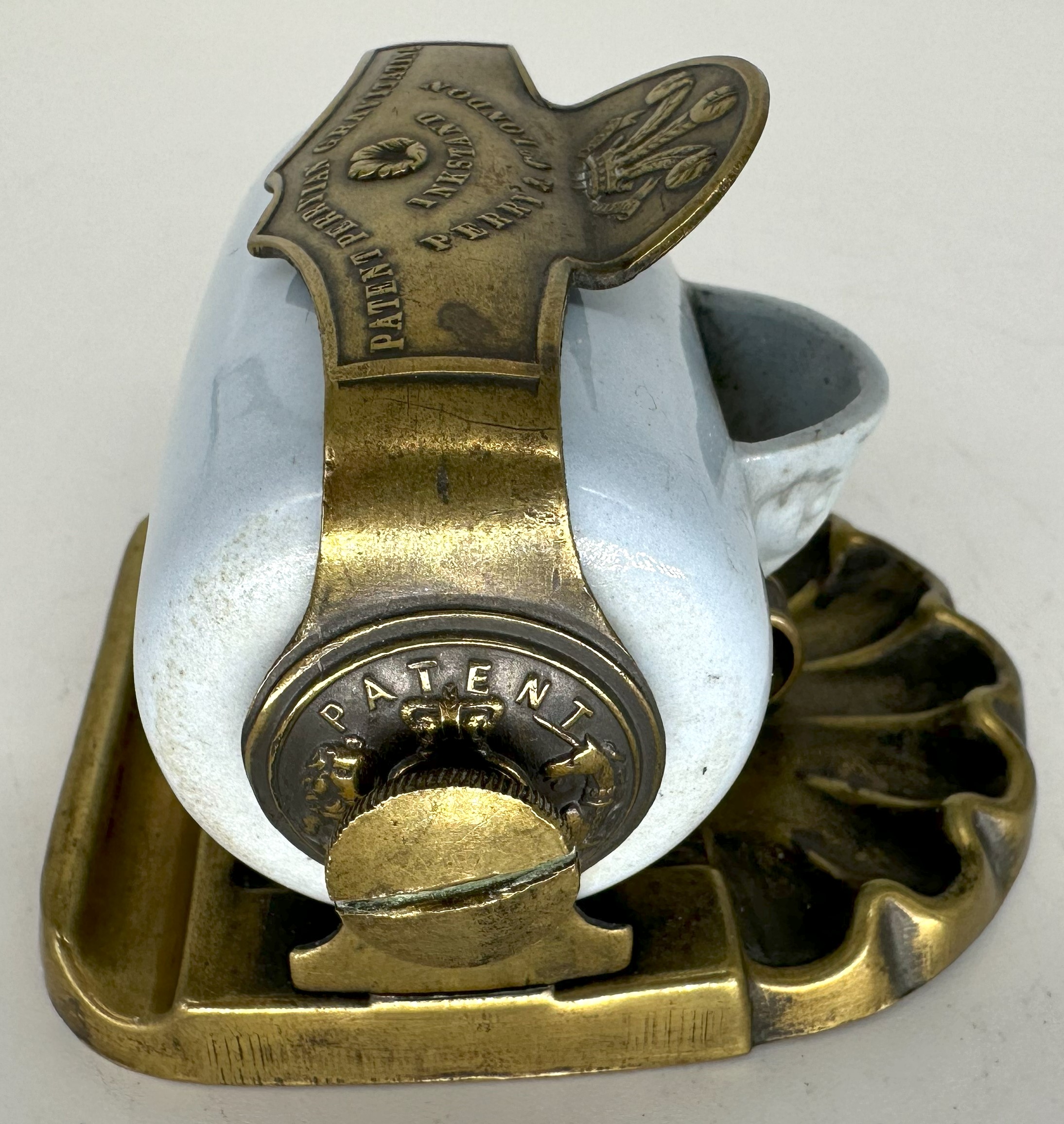 Made by Perry & Co., this inkstand features a white ceramic cylinder reservoir with a decorated “beak” opening for dipping the pen. The cylinder reservoir is held in a brass frame. The frame is marked with three ostrich plumes (Prince of Wales) and is stamped “Patent Perryian Gravitating Inkstand, Perry & Co London”. The shell shaped saucer in the front is notched to make a pen rest. There is another pen rest in the rear. The cylinder rolls open for use, and then rolls up to close the opening to preserve the ink. Above the turn knob on each side, the piece is marked “Patent” and shows the coat of arms of the United Kingdom.