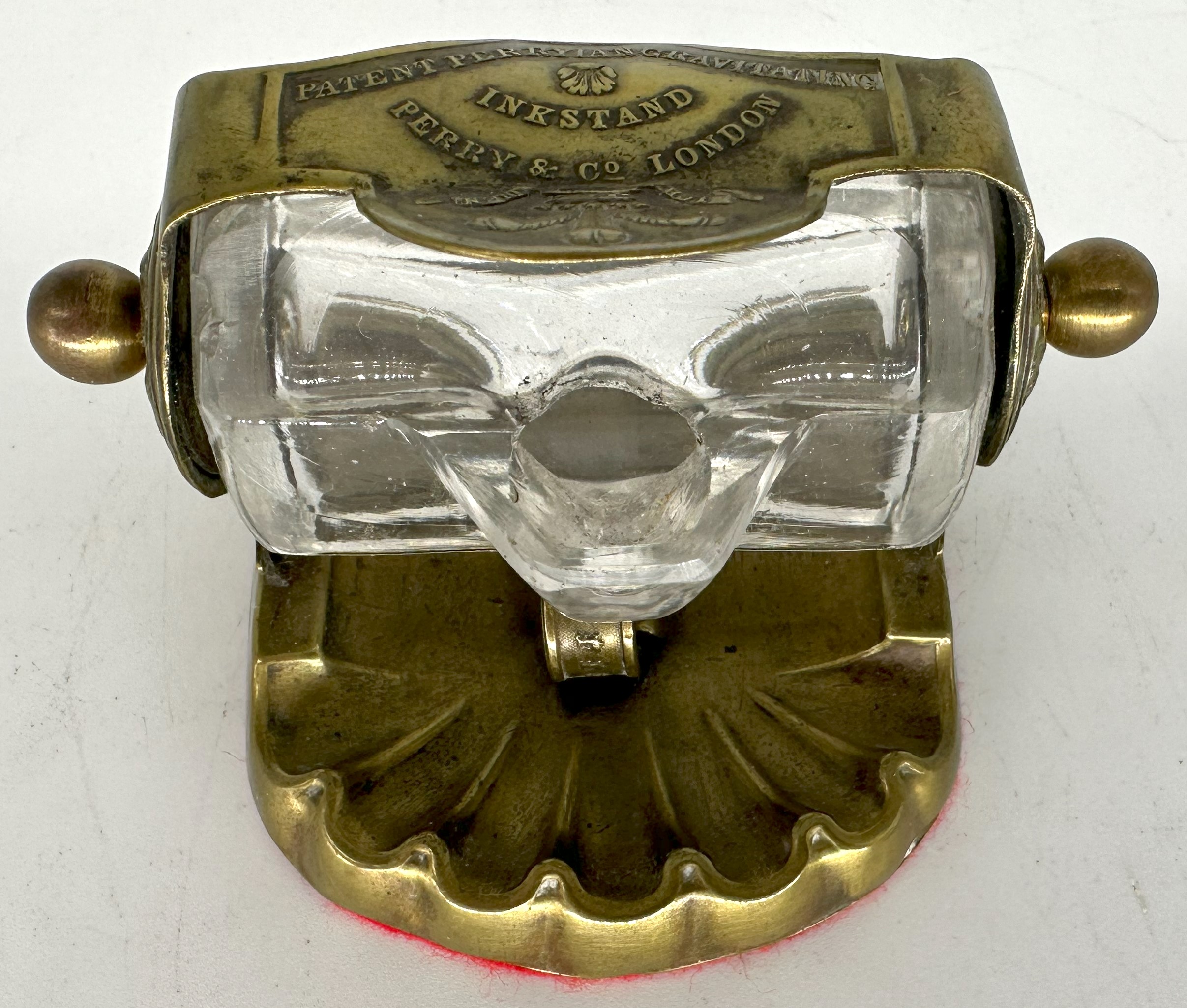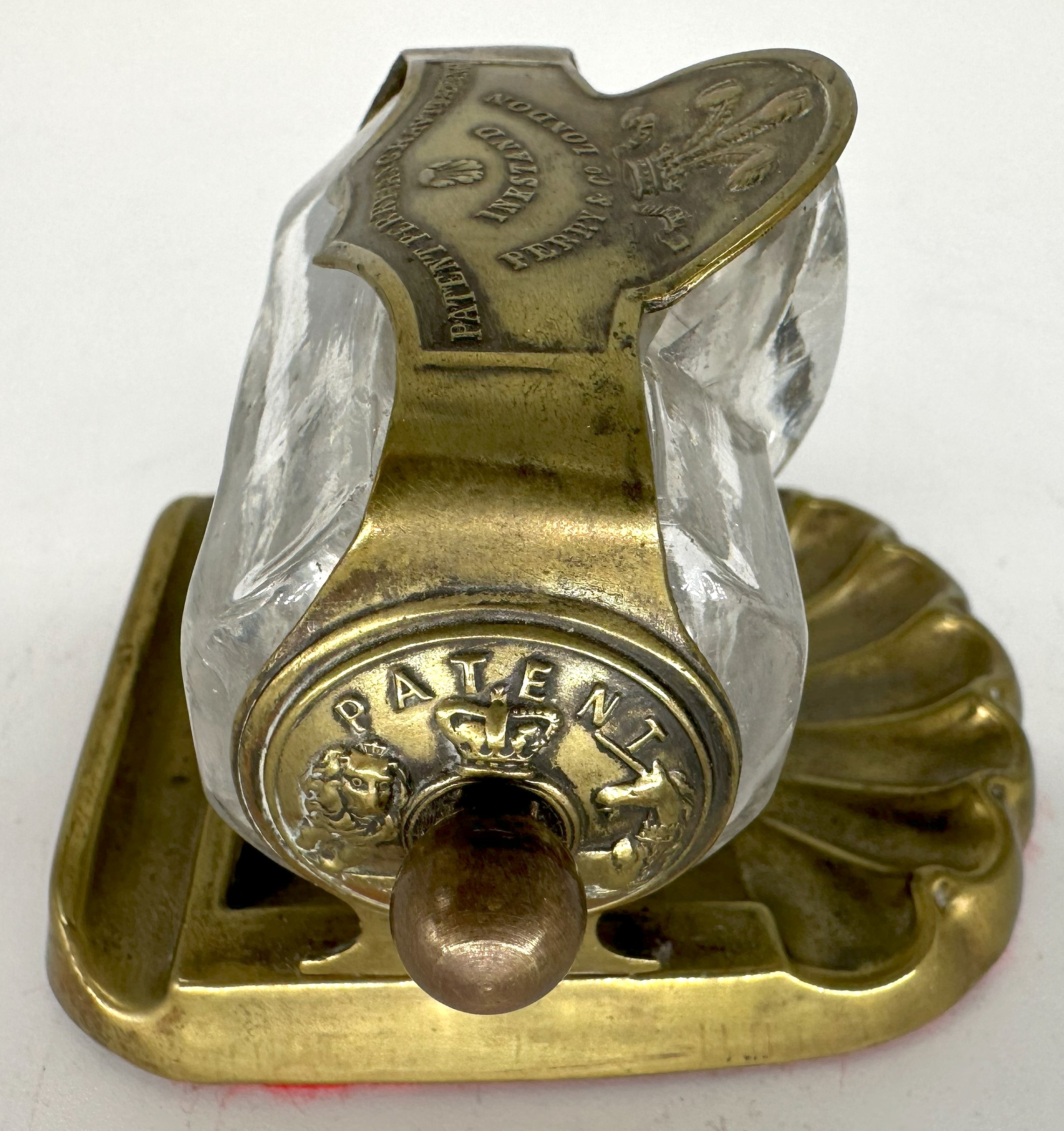 Made by Perry & Co., this inkstand features a glass cylinder reservoir with a “beak” opening for dipping the pen. The cylinder reservoir is held in a brass frame. The frame is marked with three ostrich plumes (Prince of Wales) and is stamped “Patent Perryian Gravitating Inkstand, Perry & Co London”. The shell shaped saucer in the front is notched to make a pen rest. There is another pen rest in the rear. The cylinder rolls open for use, and then rolls up to close the opening to preserve the ink. Above the turn knob on each side, the piece is marked “Patent” and shows the coat of arms of the United Kingdom. This is the smallest version of this inkstand.