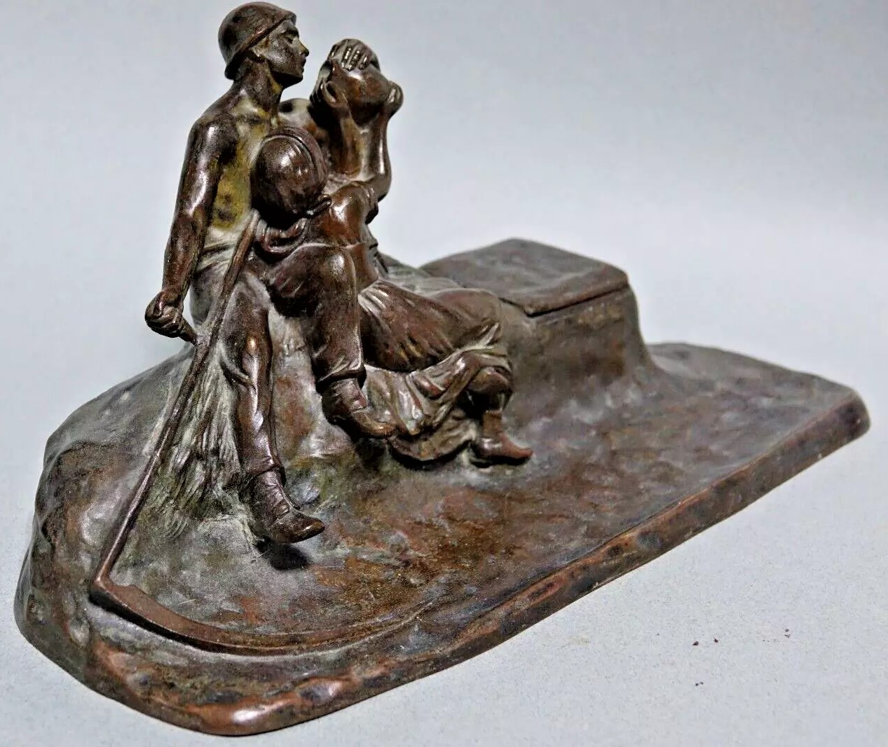 This bronze inkstand by Peter Tereszczuk depicts a laborer and a woman in a moment of rest and care. The laborer is seated, holding a scythe in one hand, while the woman kneels beside him, offering him a drink from a jug. The figures are detailed and expressive, capturing a tender scene of respite.