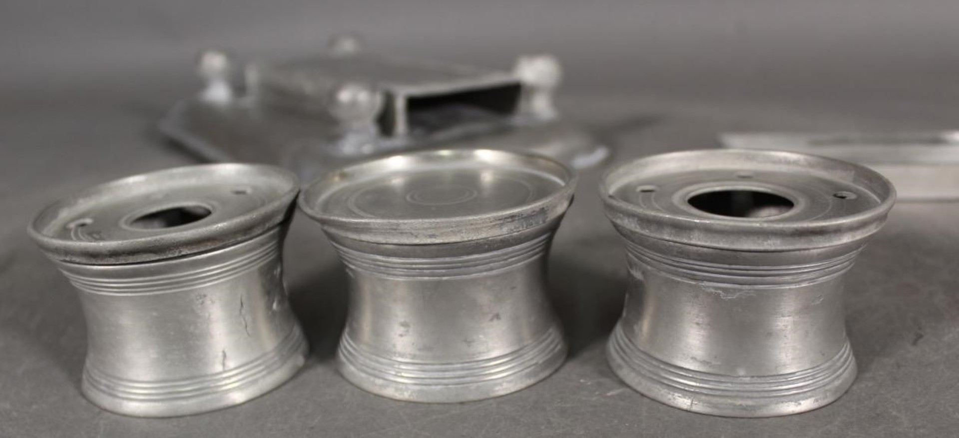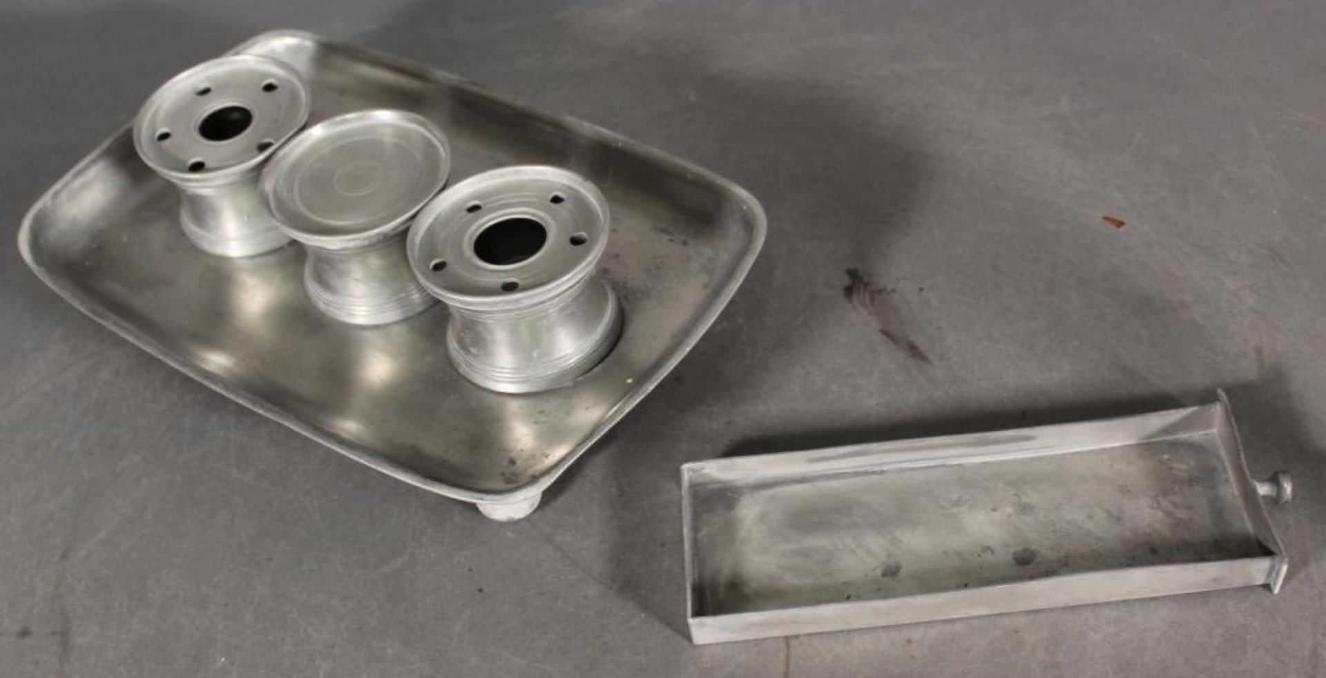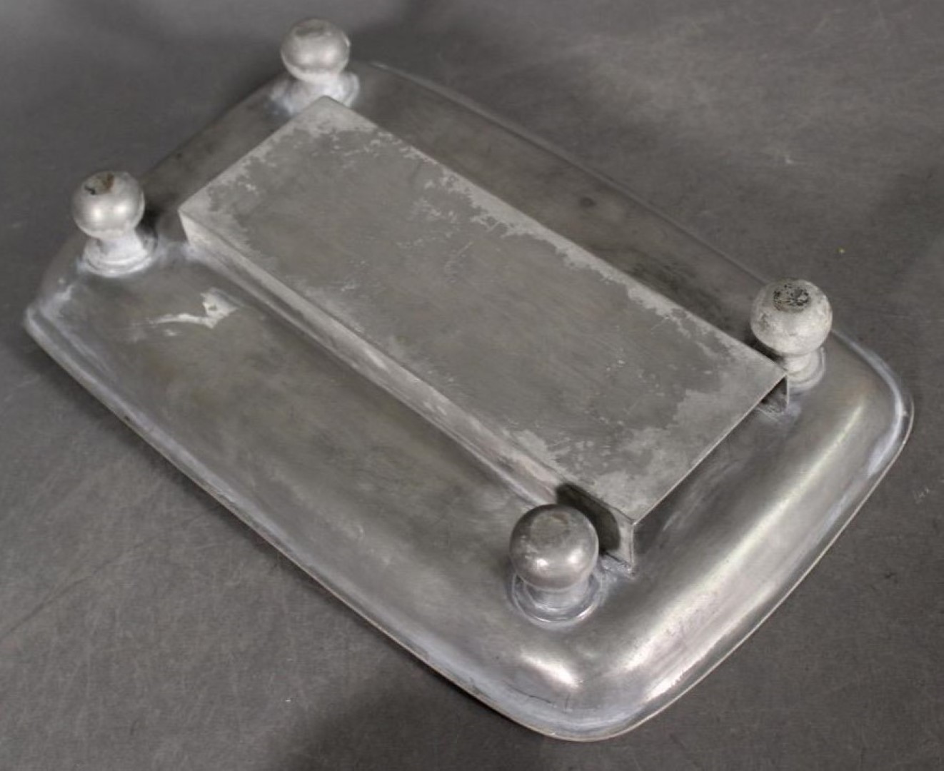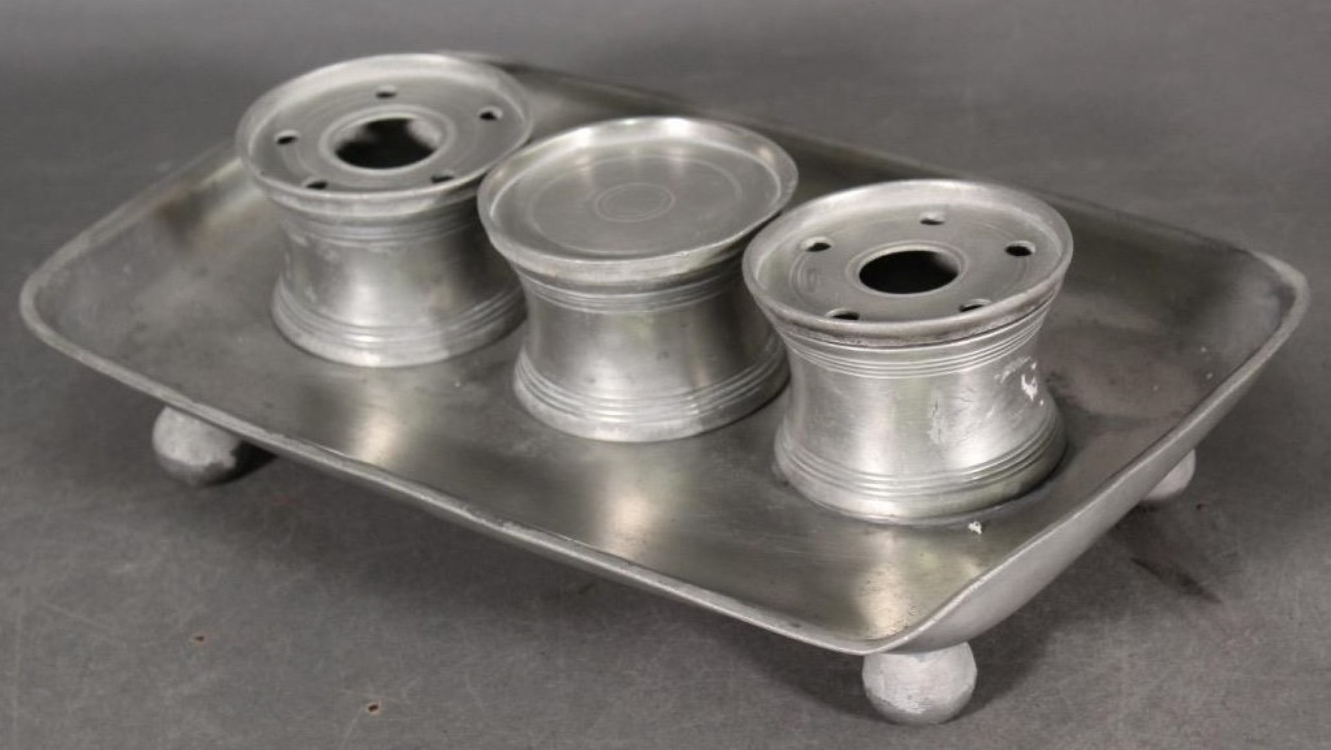 Two pewter inkwells and a storage container are held on a rectangular base with ball feet. Within the base is a pull-out drawer for storage.